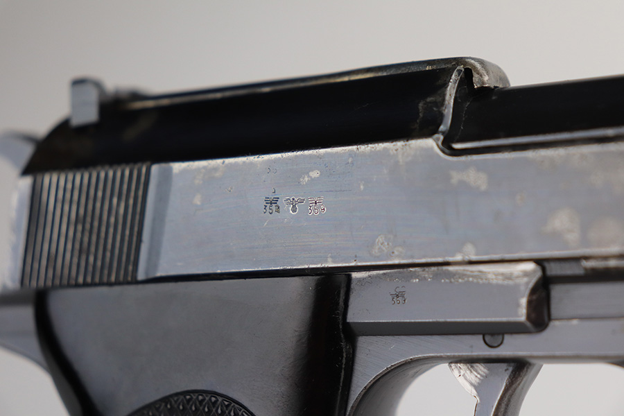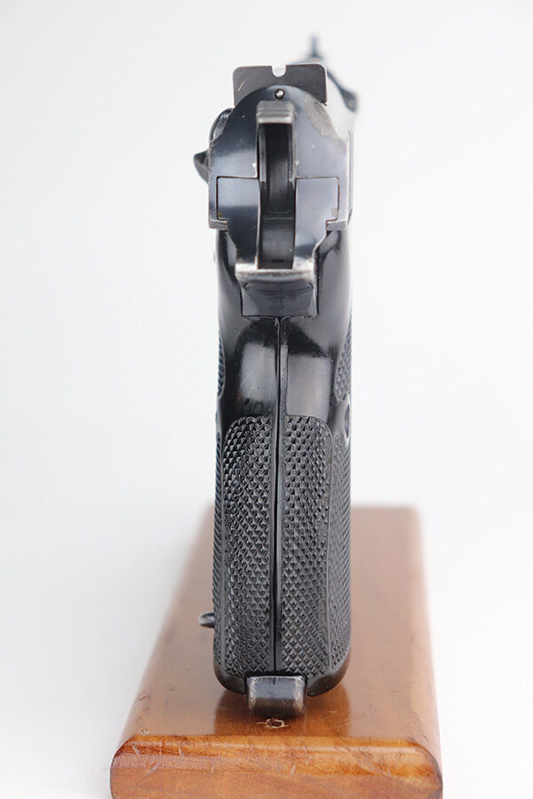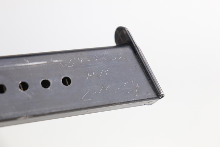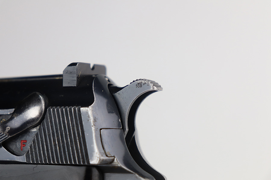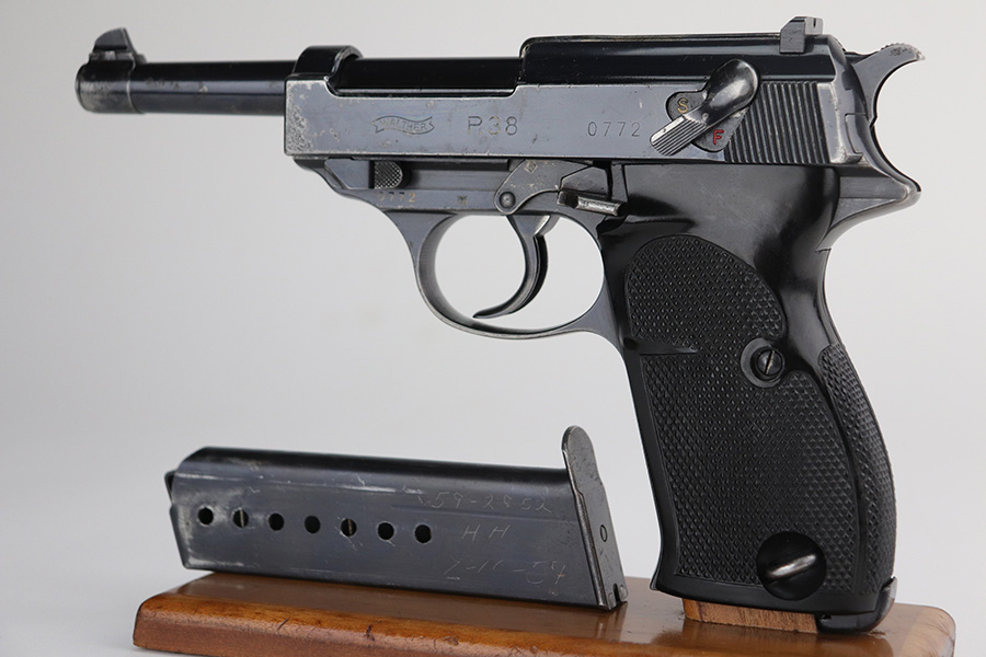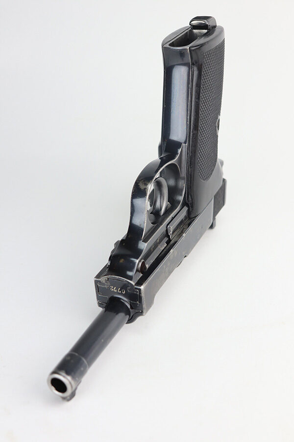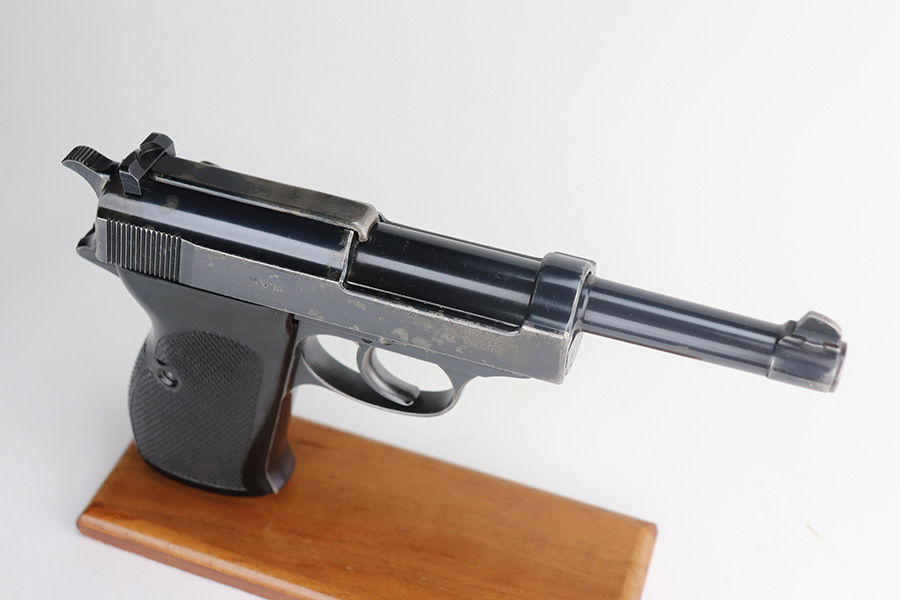 4/7/22 – This is a rare and highly desirable Zero Series Walther P.38, part of the first variation run of these pistols. Only about 1,000 of these pistols were produced. The First Variation Zero Series is characterized by this serial range, the rectangular firing pin, and a hidden extractor. This one is all matching and has retained roughly 80-85% of its original finish. There are areas of spotty discoloration and minor pitting on both sides of the slide, on the barrel, on the safety lever, around the muzzle, and the underside of the trigger guard. The gun comes with its original matching grips and a proper Zero Series magazine that does not match the gun. The bore has strong rifling with spotty freckling throughout. De-cocker is functional.