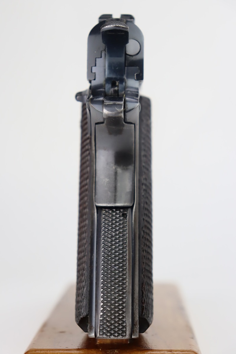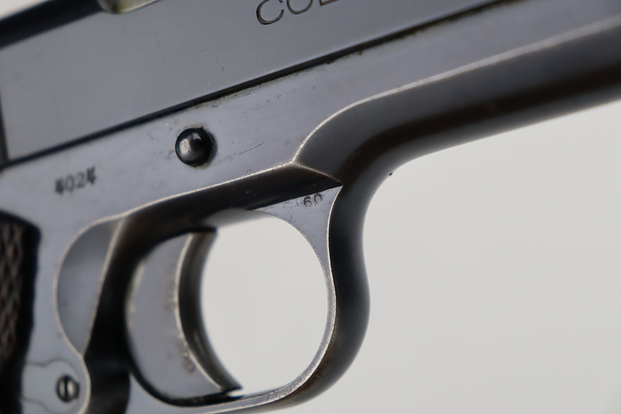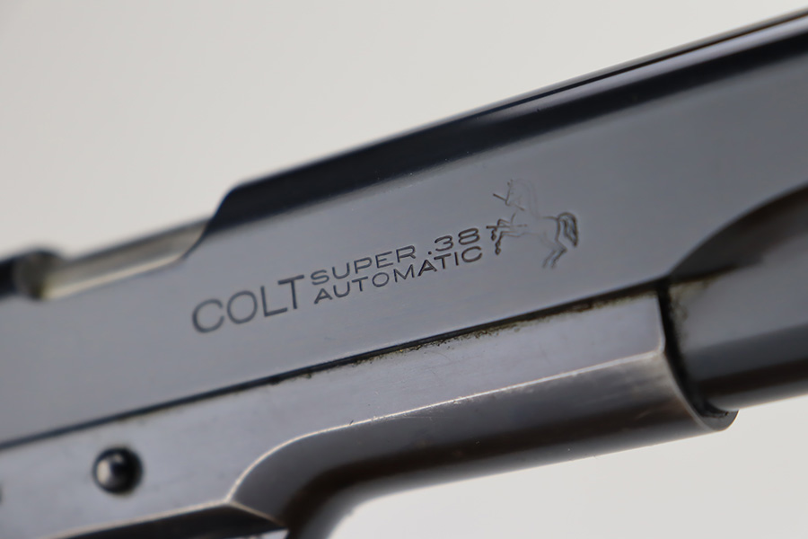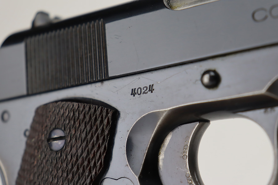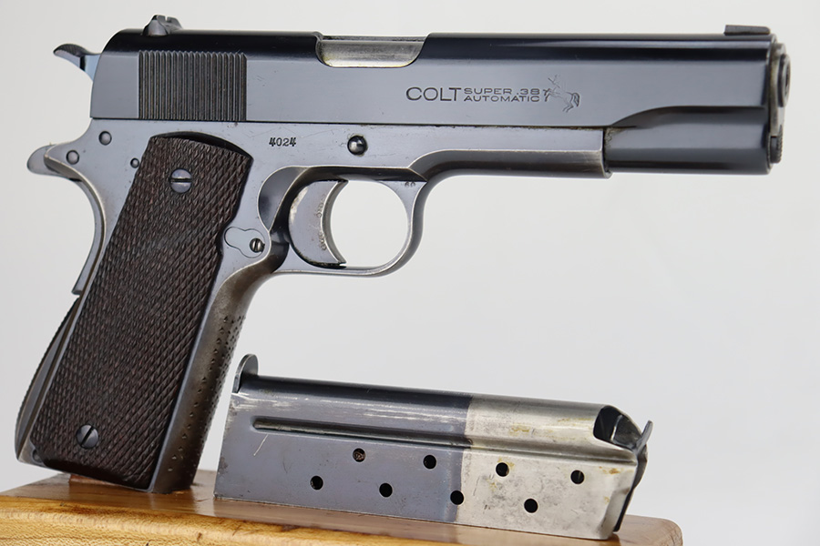 9/20/23 – This is a nice example of an original prewar Colt Super .38 that was made in 1929, the first year of production. The pistol has a beautiful profile with only minor high edge wear, but a previous owner custom stipled the grip frame and there is finish loss all along the front strap as a result. Mint bore that hardly looks used. Excellent grips, though there is a gouge near the left panel’s upper screw. Original two-tone magazine. Slide is correctly matching numbered to the frame.