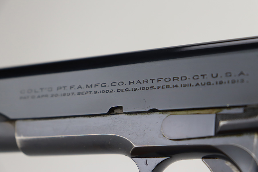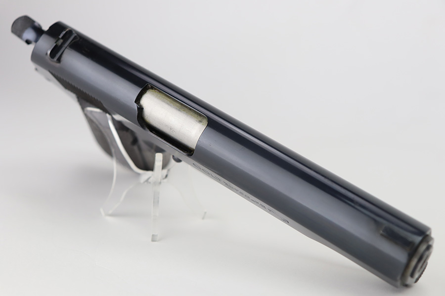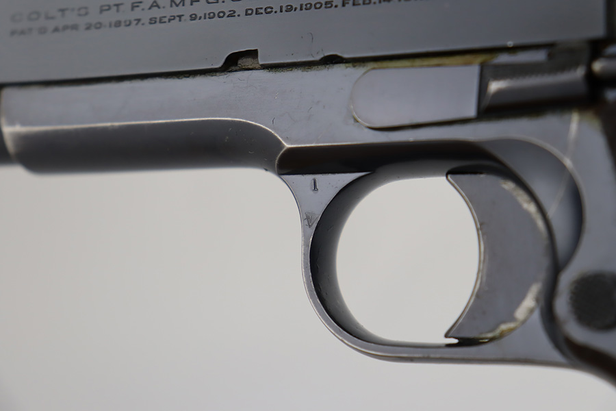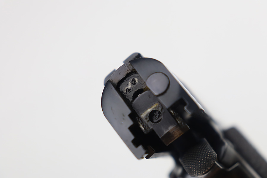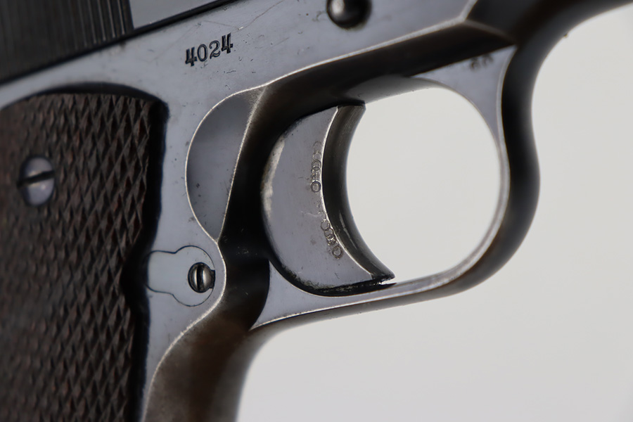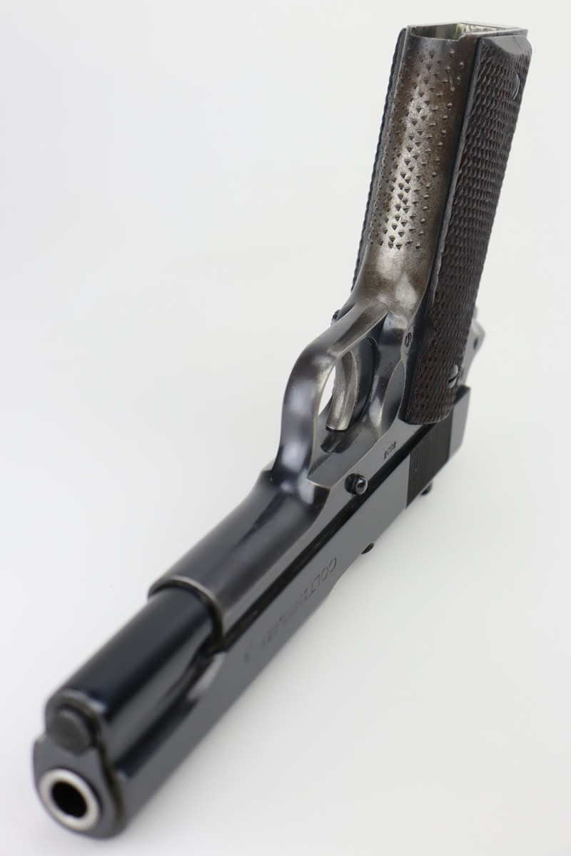 9/20/23 – This is a nice example of an original prewar Colt Super .38 that was made in 1929, the first year of production. The pistol has a beautiful profile with only minor high edge wear, but a previous owner custom stipled the grip frame and there is finish loss all along the front strap as a result. Mint bore that hardly looks used. Excellent grips, though there is a gouge near the left panel’s upper screw. Original two-tone magazine. Slide is correctly matching numbered to the frame.