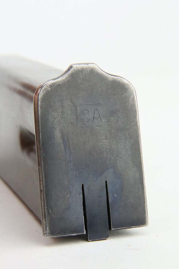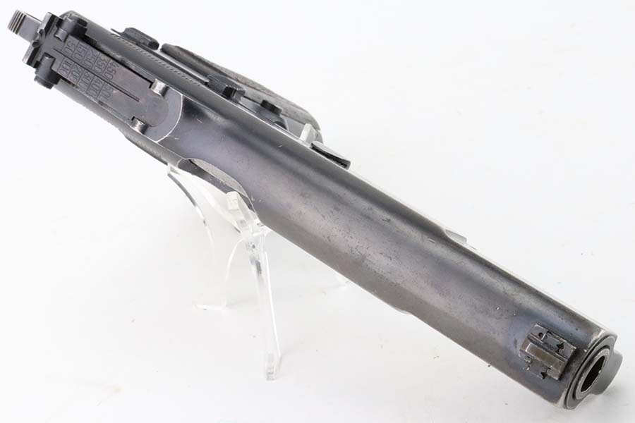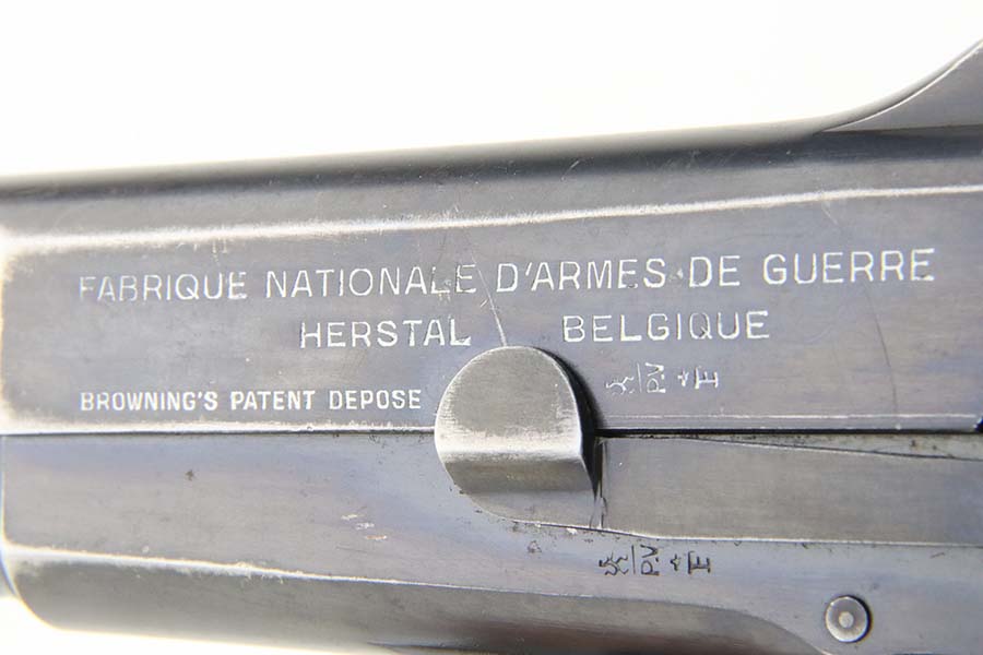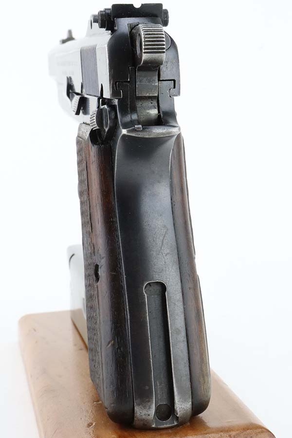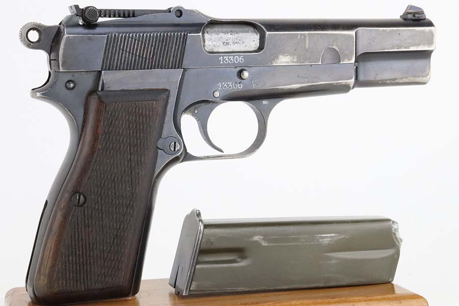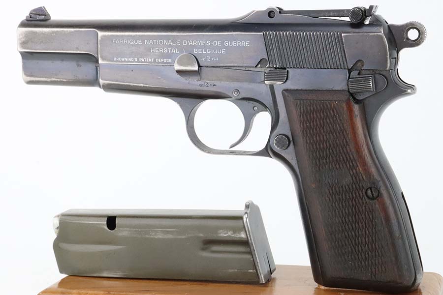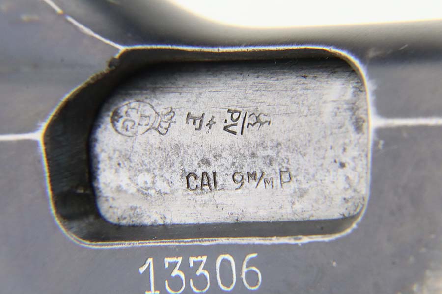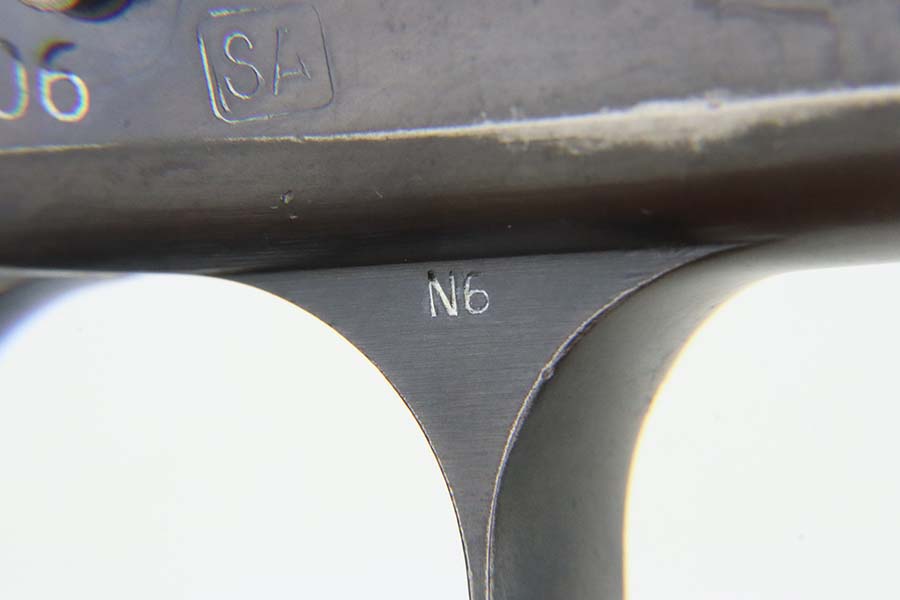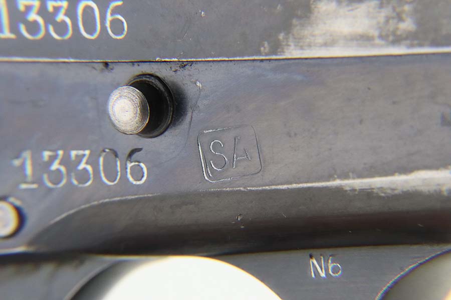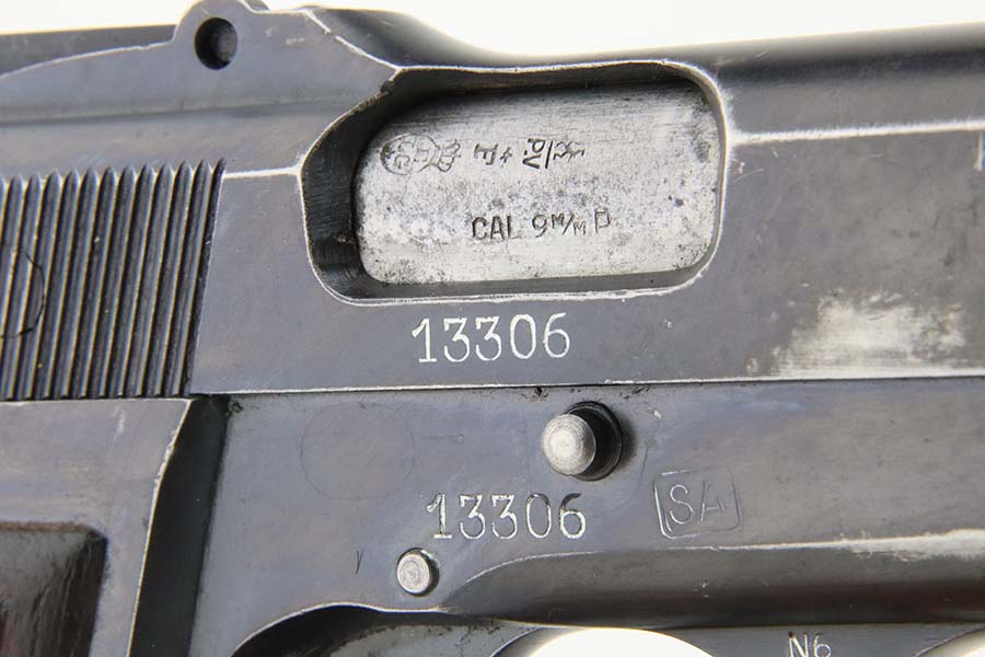 3/7/24 – This is a very rare and desirable FN Browning High Power that was part of a very small Finnish contract. Per Vanderlinden’s book on FN pistols, Finland used nearly every FN handgun over the years in their attempts to defend themselves against their Russian neighbors. With the outbreak of the Winter War, Finland requested a supply of High Powers with shoulder-stocks on a short schedule. Only ~2,400 such examples were shipped, all in serial range 11,000-15,000. This pistol is in the proper serial range and is marked N6 on the right side of the trigger guard. Finnish “SA” marking on the right side of the frame and on the base of the magazine. It is all matching. Import mark on the butt of the frame. The original finish rates somewhere between 85-90% with general high edge wear. Fitted with nice wood grips. The bore has good rifling, but there is light frosting throughout.