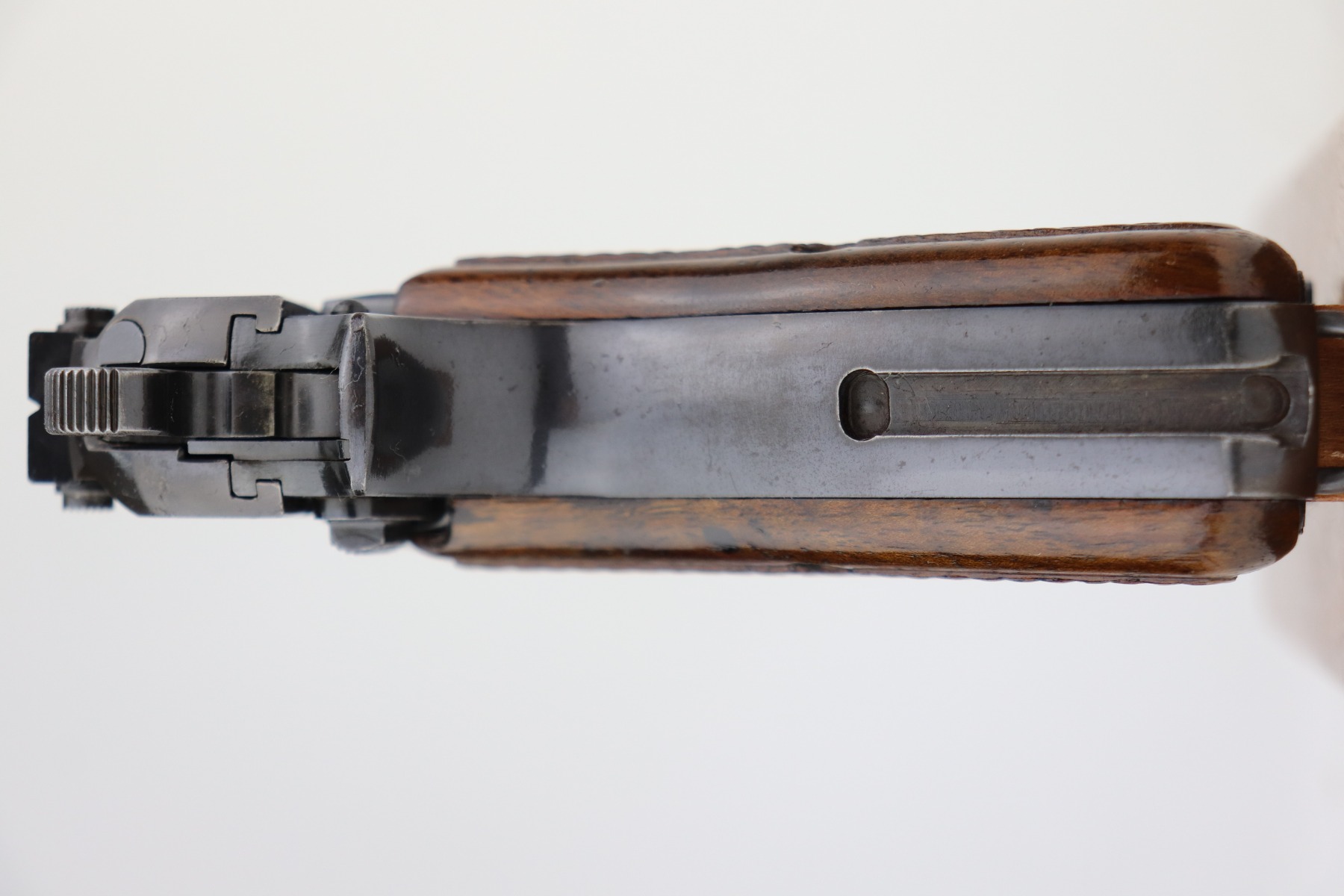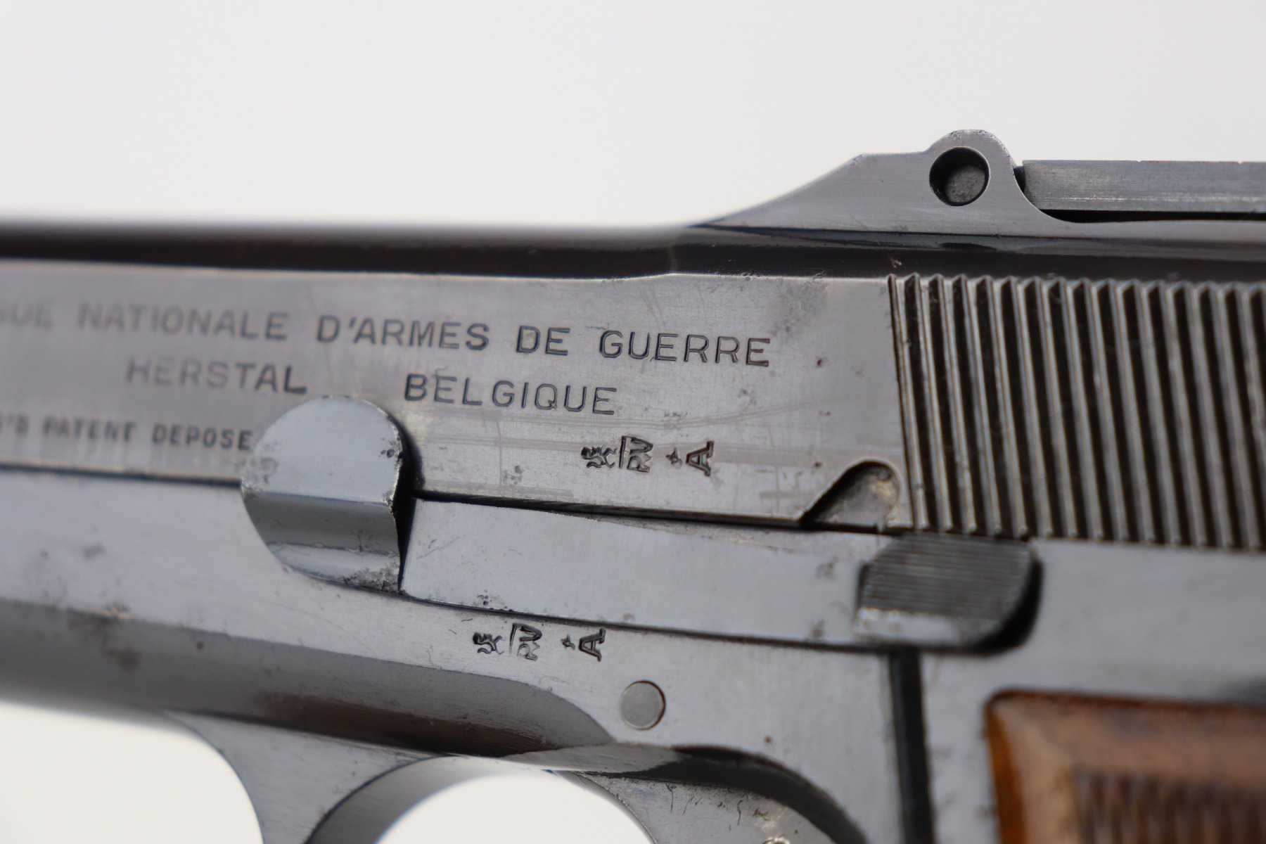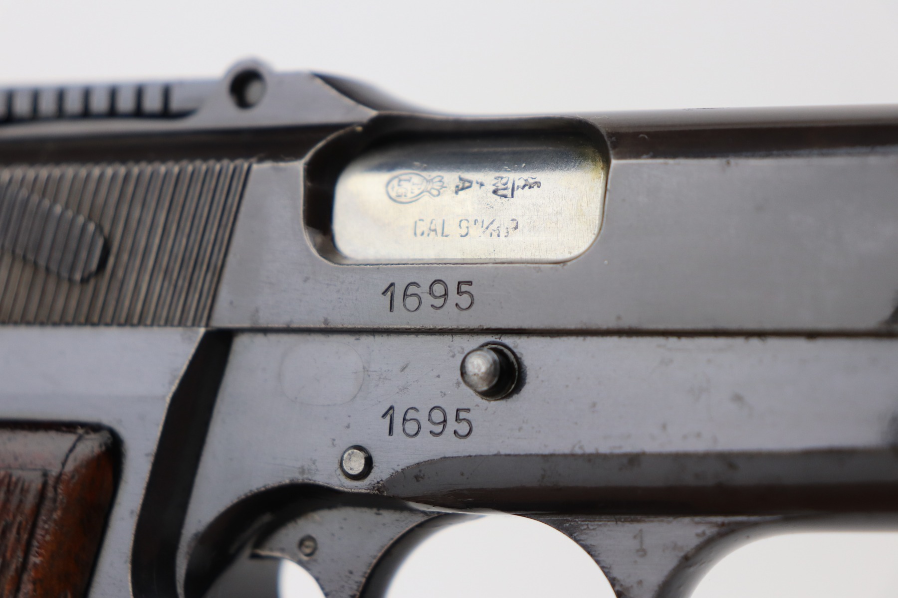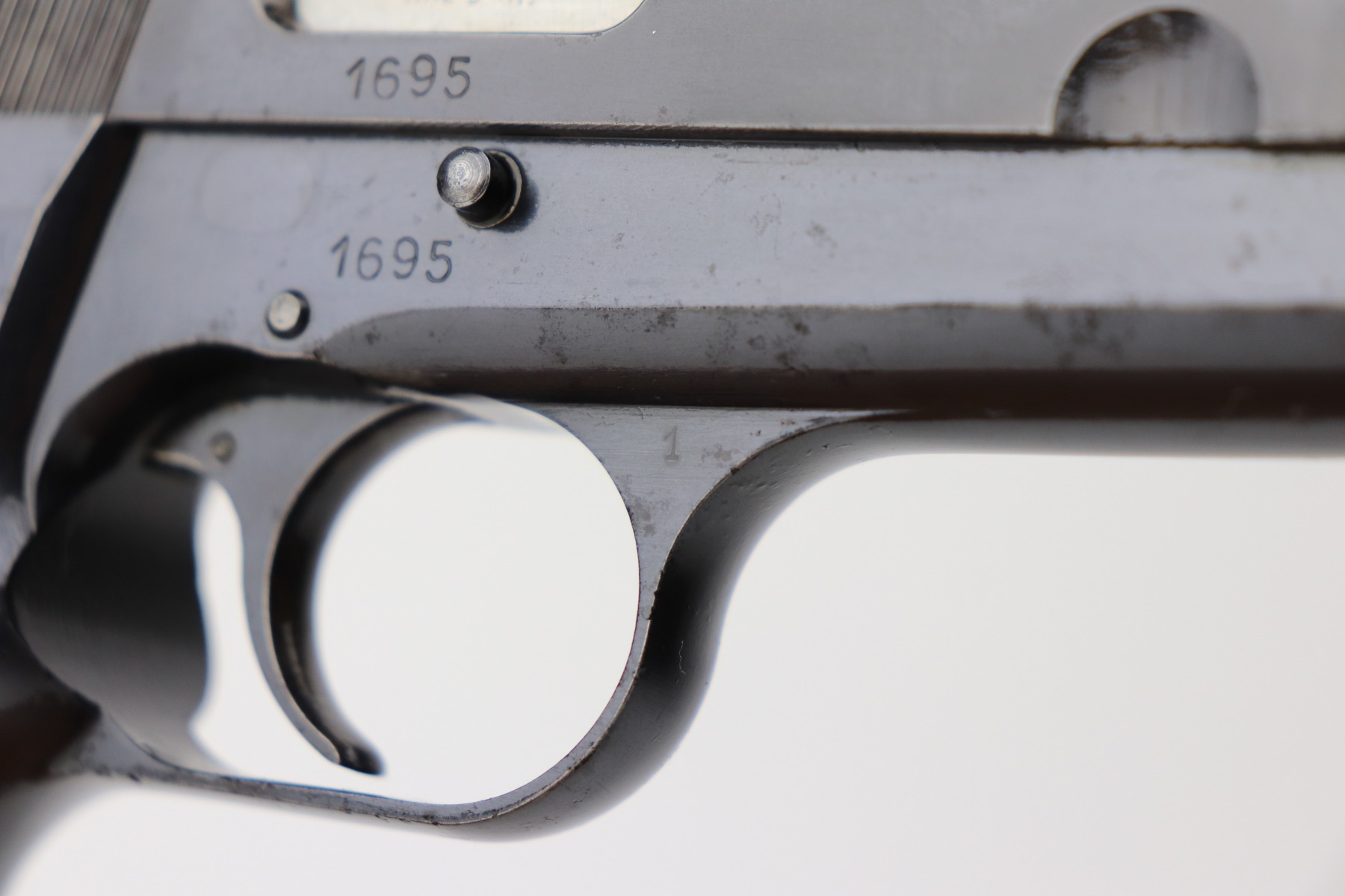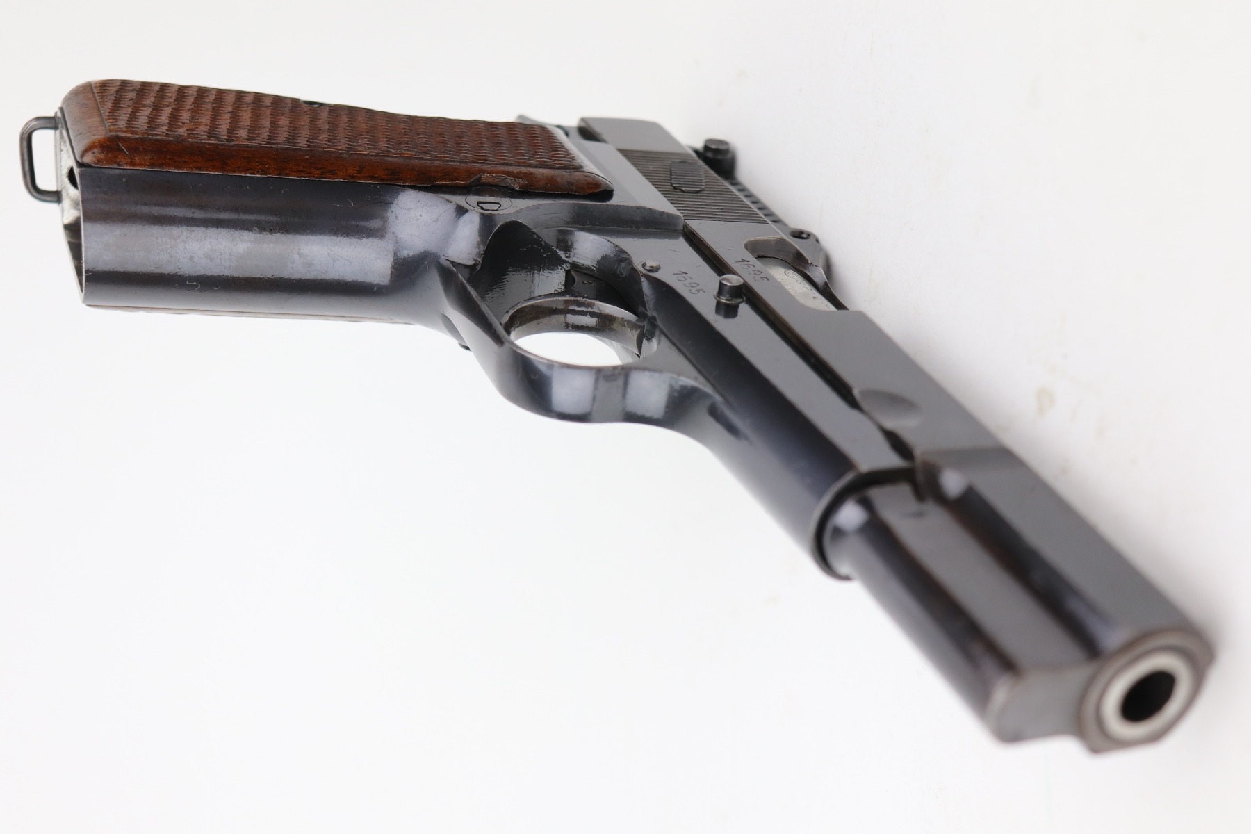 4/9/21 – This is an excellent example of an FN Browning High Power, manufactured in 1937. This gun is rare because it was shipped to the Lithuanian government along with about 7,000 other guns. It is all matching and has the Lithuanian symbol on the top of the slide. It has retained about 97-98% of its bluing. There is spotty wear on the front strap and hints of wear on the high edges of the slide. Some areas of minor pitting on the top of the slide. Comes with excellent grips and a proper magazine. Excellent bore – shiny with strong rifling.