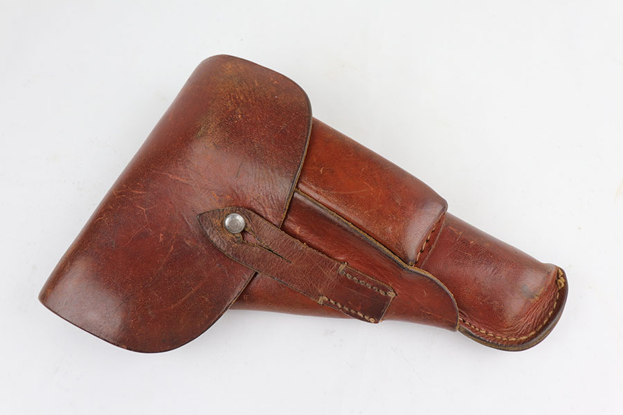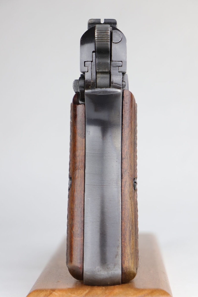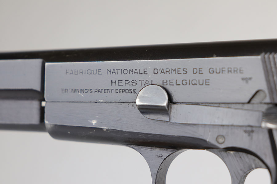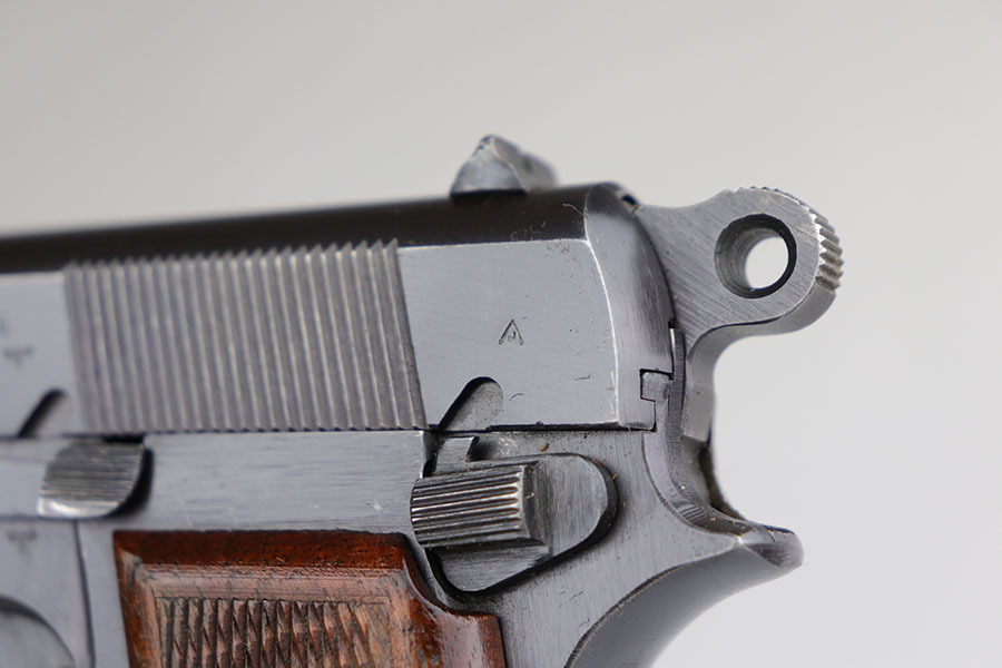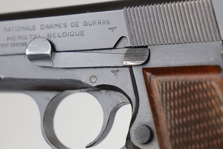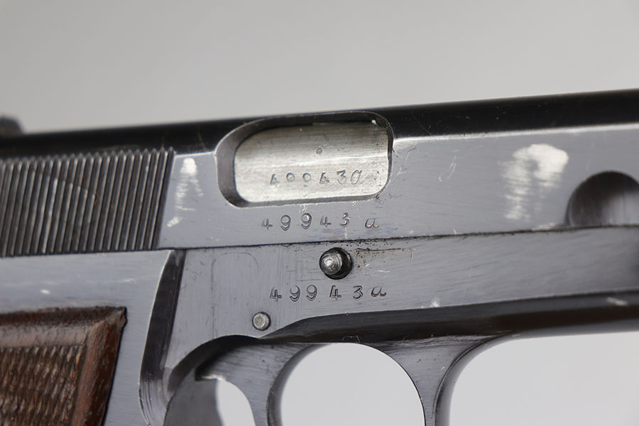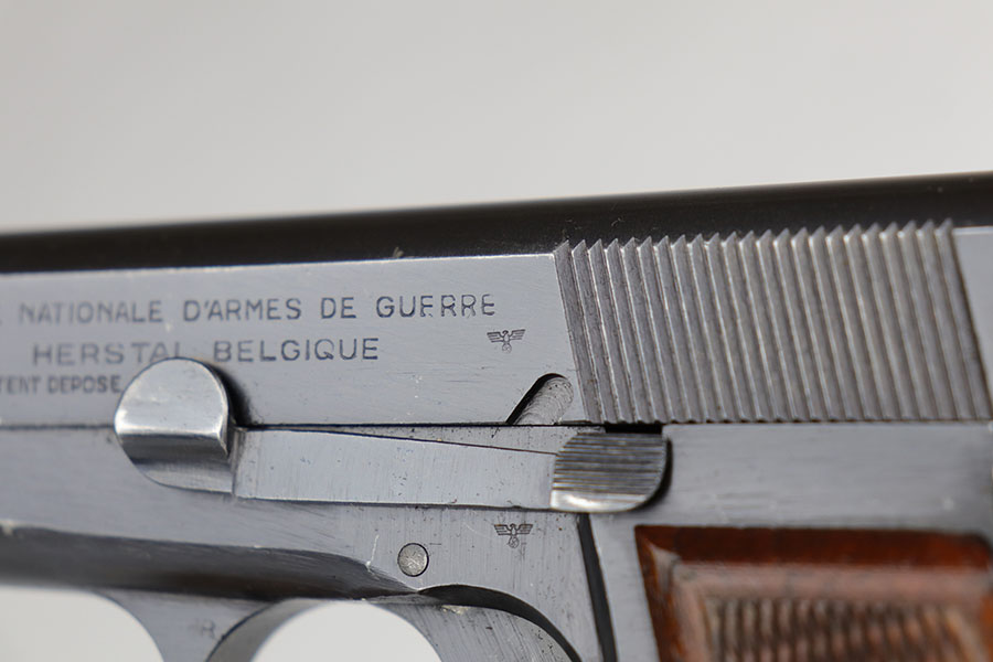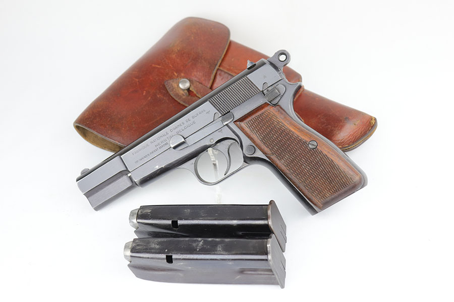 5/28/20 – This is a complete and rare FN Browning High Power rig from the Nazi era with test proof only on slide. The pistol features several Eagle proofs with swastika in the talons but no military acceptance proofs. This one is especially rare in that the slide has the test proof, but it is not accompanied by the Eagle/N proofs that would more commonly be seen on this variation. It’s estimated that only 5-8% of pistols made during the WaA140 era are Eagle/N or test proof only, and the test proof only pistols are more rare of the two. Some collectors have suggested that these pistols were supplied to German/Nazi law enforcement groups, and that test proof only pistols were true commercial pistols that were supplied to company securities and select individuals. This info comes from Vanderlinden’s book on FN pistols, but he states he has found no proof on this matter in either direction, and that the significance of the test proof is unclear. The pistol itself is all matching and original with about 94% blue remaining. Most of the finish loss is on either strap, and a couple of areas on the right side of the slide. Mint bore and excellent grips. Both pistols are period correct and unmarked. Rig is completed by an excellent holster with clear waffenamt, ’43 date and ‘nka’ maker mark.