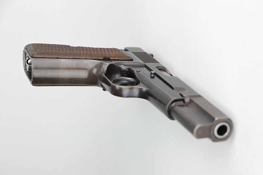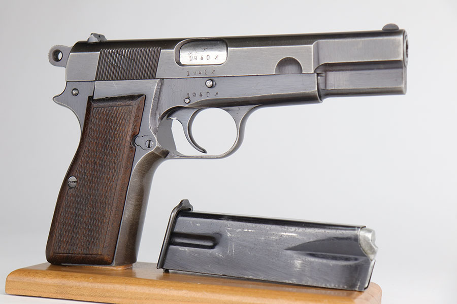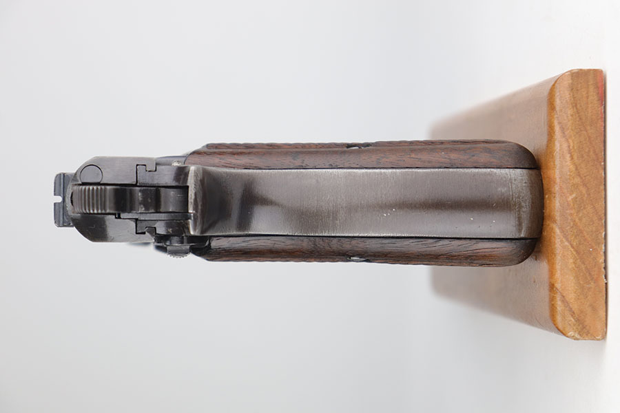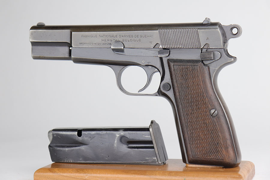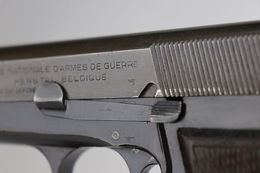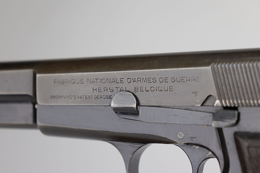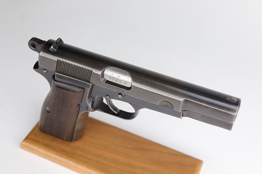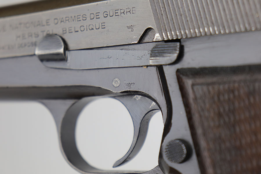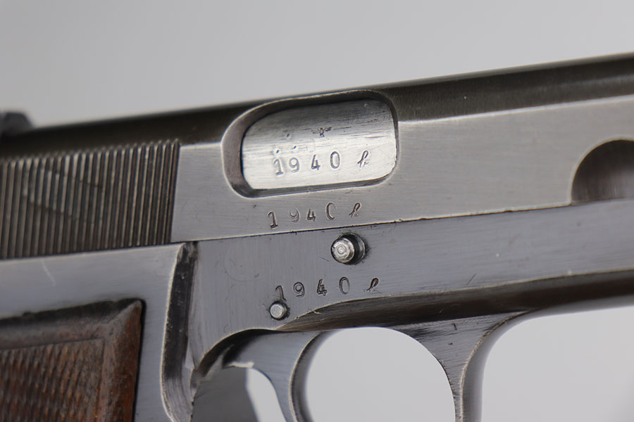 11/12/20 – This is a rare FN Browning High Power from the Nazi era with test proof only on slide. The pistol features several Eagle proofs with swastika in the talons but no military acceptance proofs. This one is especially rare in that the slide has the test proof, but it is not accompanied by the Eagle/N proofs that would more commonly be seen on this variation. It’s estimated that only 5-8% of pistols made during the WaA140 era are Eagle/N or test proof only, and the test proof only pistols are more rare of the two. Some collectors have suggested that these pistols were supplied to German/Nazi law enforcement groups, and that test proof only pistols were true commercial pistols that were supplied to company securities and select individuals. This info comes from Vanderlinden’s book on FN pistols, but he states he has found no proof on this matter in either direction, and that the significance of the test proof is unclear. The pistol itself is all matching and original with about 70-75% blue remaining. There’s a general thinning and patina to the slide and straps. The wood grips are original and in good condition with no cracks or chips. Bore has strong rifling but a little freckling in the grooves. Original magazine.