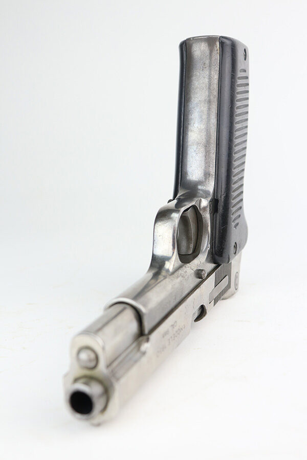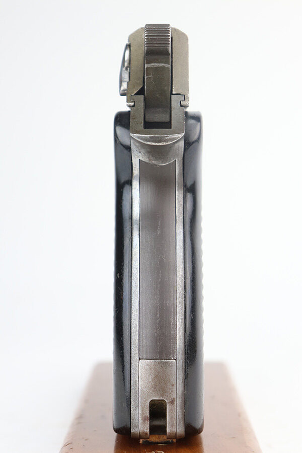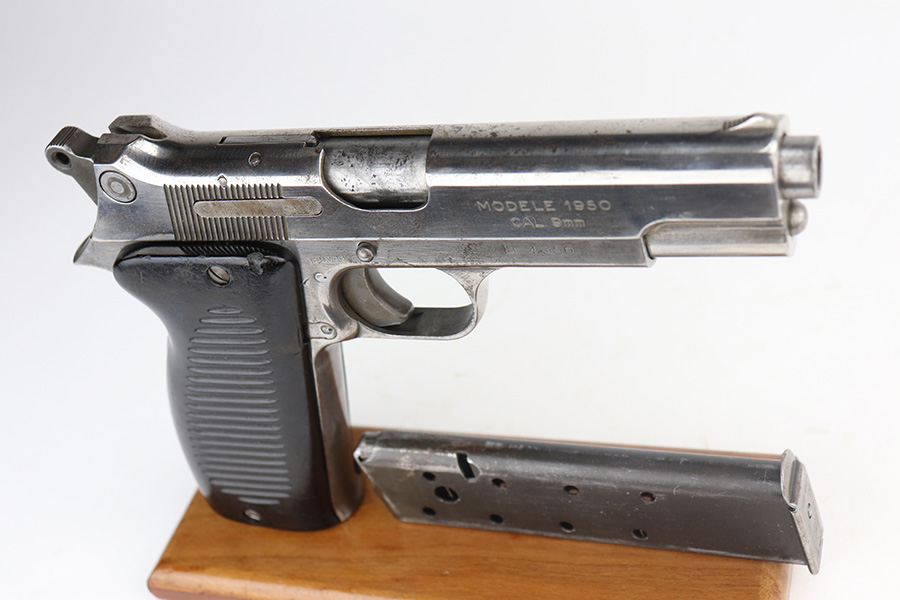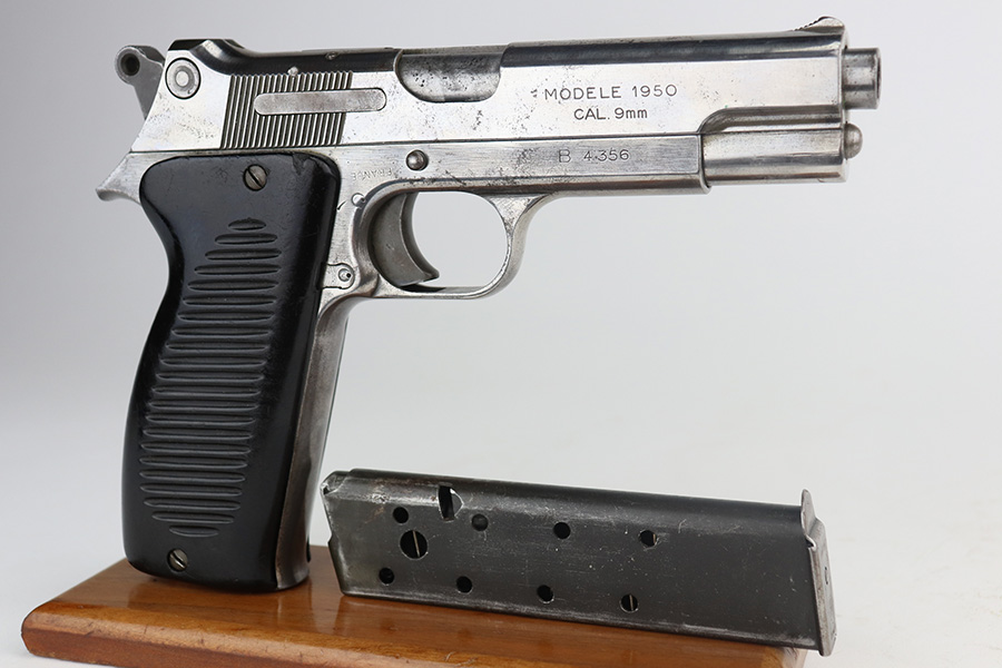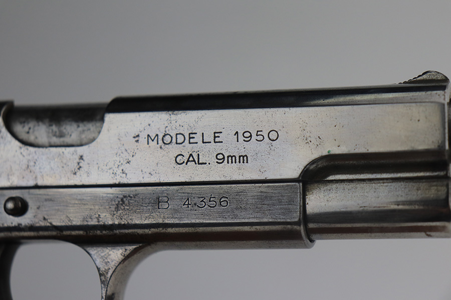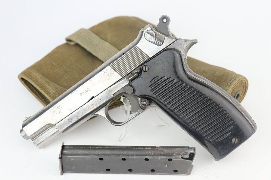 6/30/21 – This is a nice example of a French MAC Model 1950 rig, manufactured and issued to the French military in the 1950’s. This one has an early “B” prefix serial number – one of the first 20,000 made. These guns are rare and highly sought-after among collectors. It’s easy to see why – the gun has a really nice action and feels great in the hand. This one is all matching and has a “France” export mark on the right side of the frame. It has only retained about 10% of its original parkerized finish, mostly visible on the small parts and in the crevices. It appears that someone stripped the finish on most of the gun down to bare metal and polished it. There is spotty oxidation throughout. Comes with period-correct grips and a proper magazine. There are handling marks on the grips throughout and a few minor chips here and there. The rifling in the bore is a bit worn, and there is minor pitting throughout. Comes with a period-correct canvas holster.