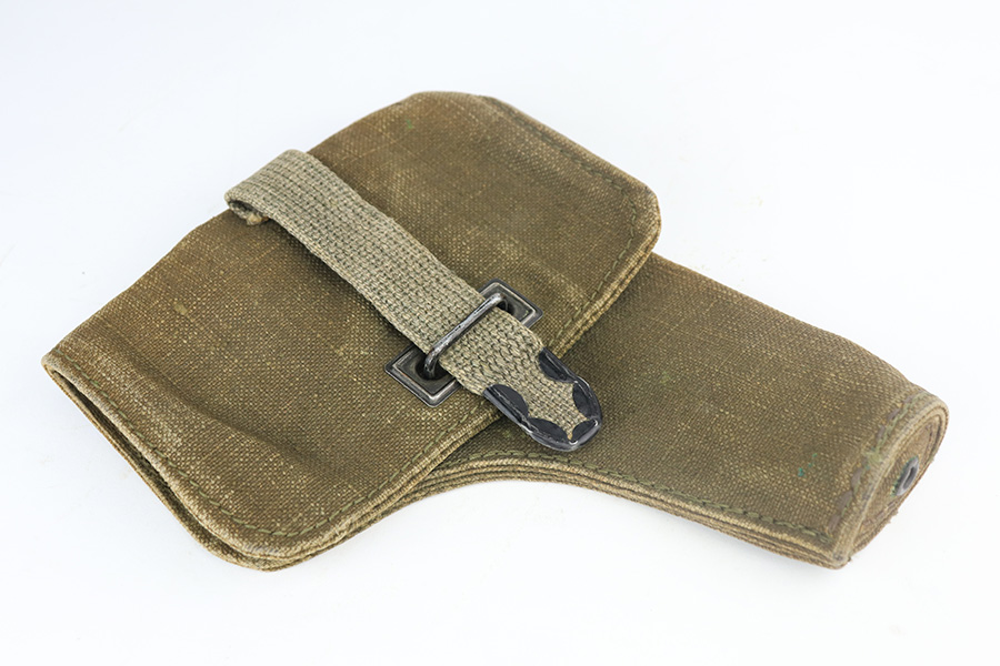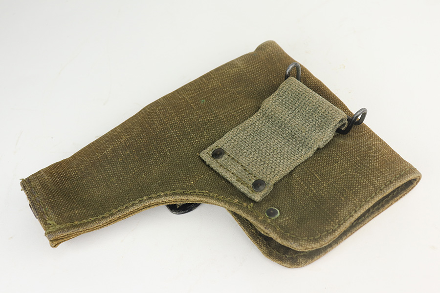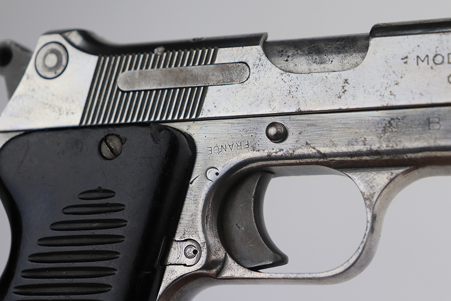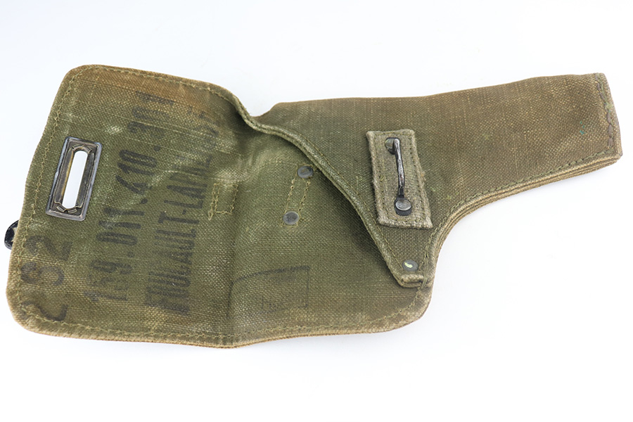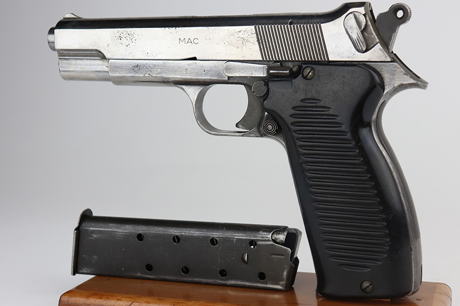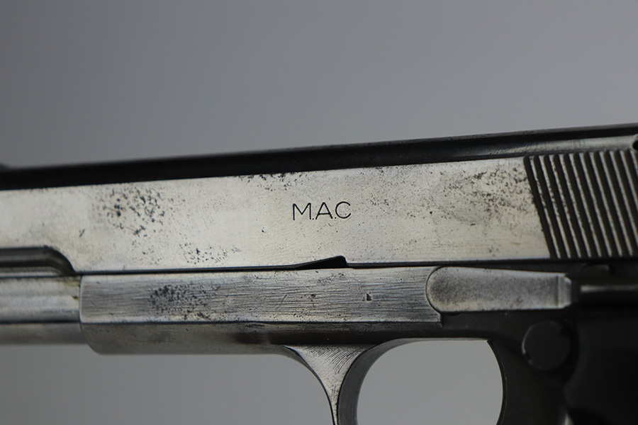 6/30/21 – This is a nice example of a French MAC Model 1950 rig, manufactured and issued to the French military in the 1950’s. This one has an early “B” prefix serial number – one of the first 20,000 made. These guns are rare and highly sought-after among collectors. It’s easy to see why – the gun has a really nice action and feels great in the hand. This one is all matching and has a “France” export mark on the right side of the frame. It has only retained about 10% of its original parkerized finish, mostly visible on the small parts and in the crevices. It appears that someone stripped the finish on most of the gun down to bare metal and polished it. There is spotty oxidation throughout. Comes with period-correct grips and a proper magazine. There are handling marks on the grips throughout and a few minor chips here and there. The rifling in the bore is a bit worn, and there is minor pitting throughout. Comes with a period-correct canvas holster.