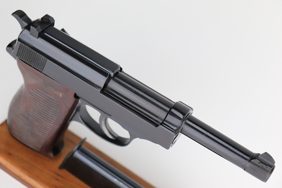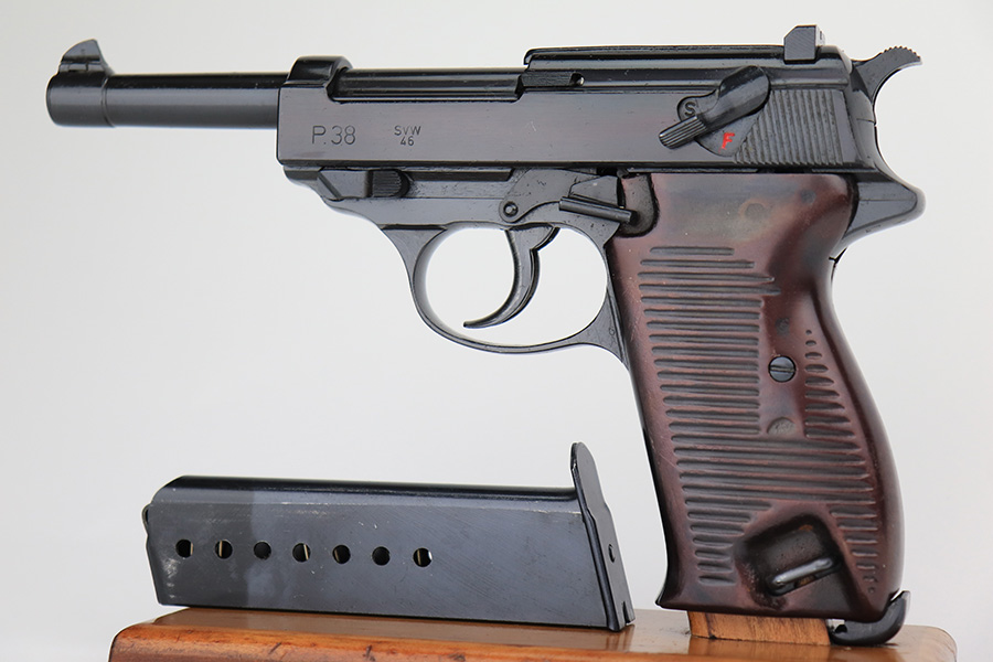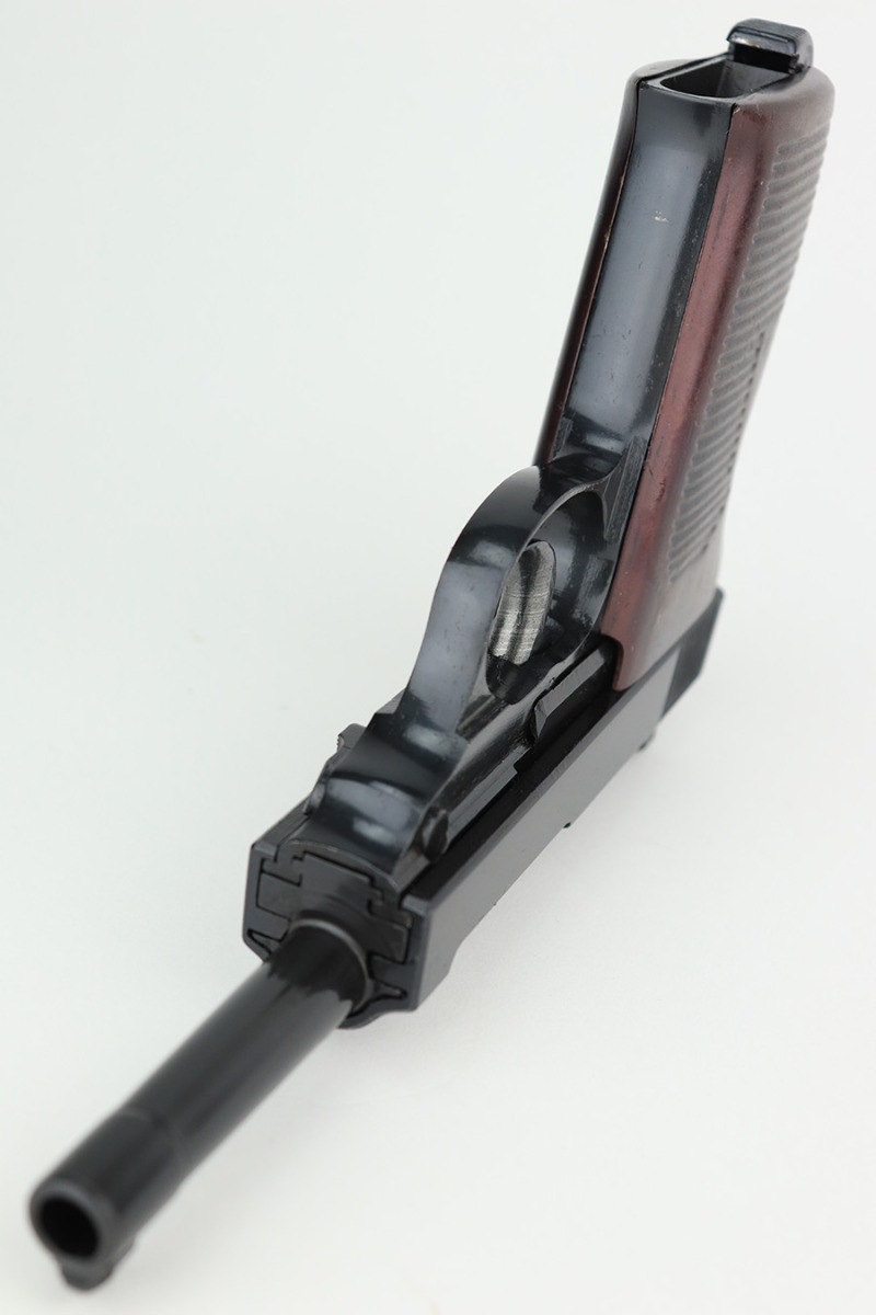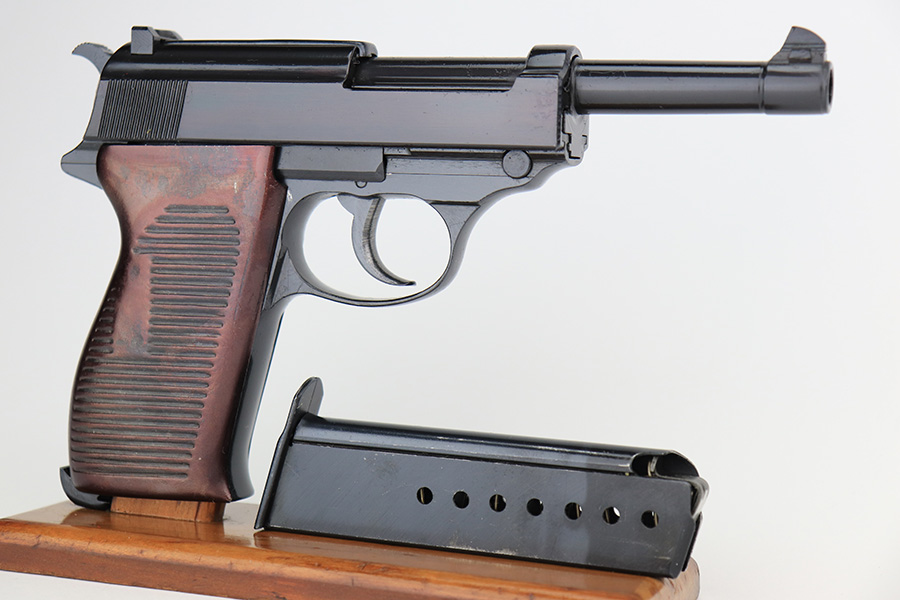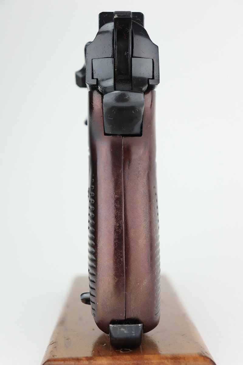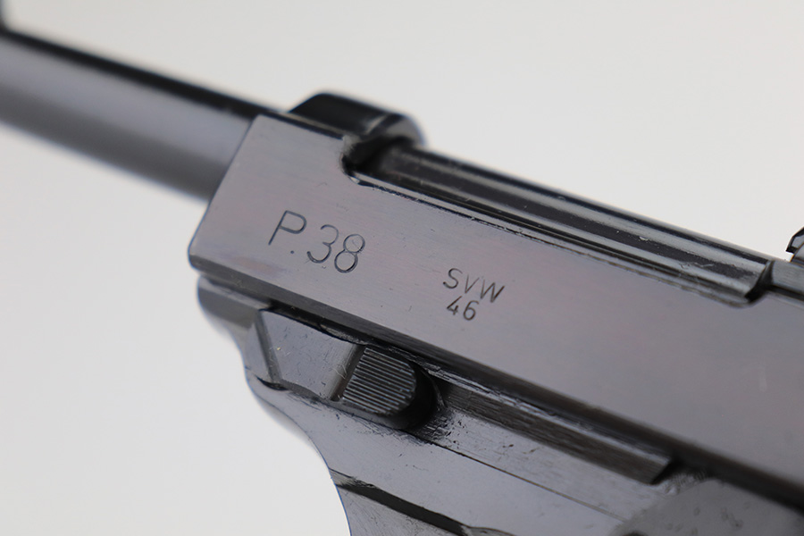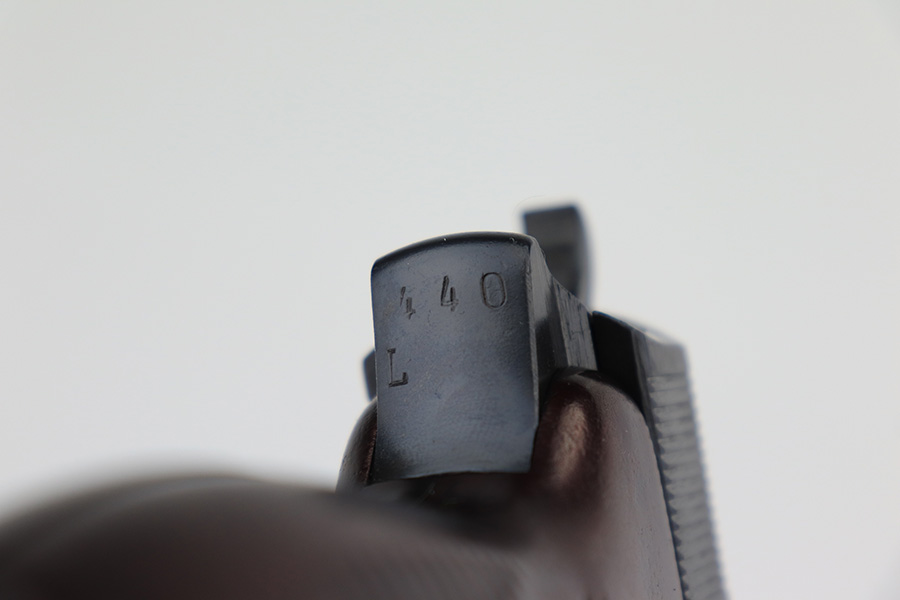 8/15/23 – This is an excellent example of a rare Mauser P.38 assembled by the French using leftover Nazi parts in 1946. This one is rare because it has an “L” block serial number labeled on the underside of the tang. The entire gun has been professionally restored, so the gun has a very nice look. There is essentially no bluing loss. The gun comes with desirable French “grey ghost” grips that were refinished as well, giving them a really nice plum color. Comes with an un-marked magazine (the mag fits a little tight inside the gun). The bore is excellent – shiny with strong rifling. De-cocker is functional.