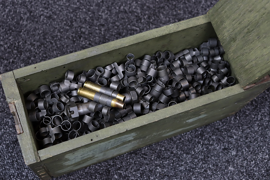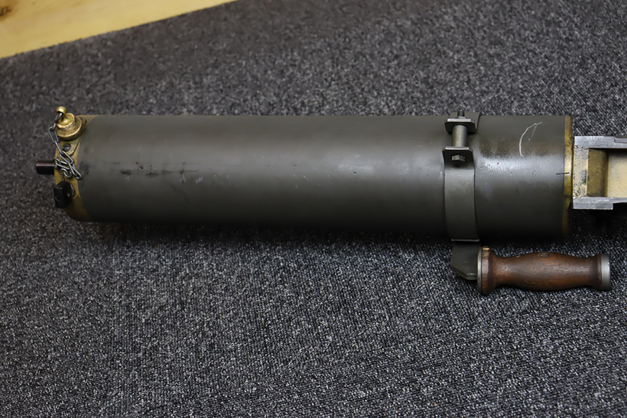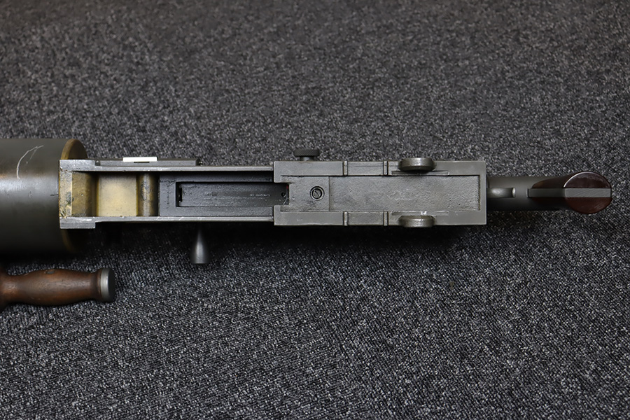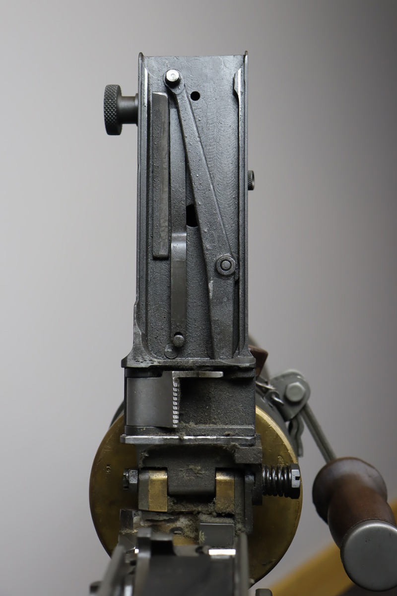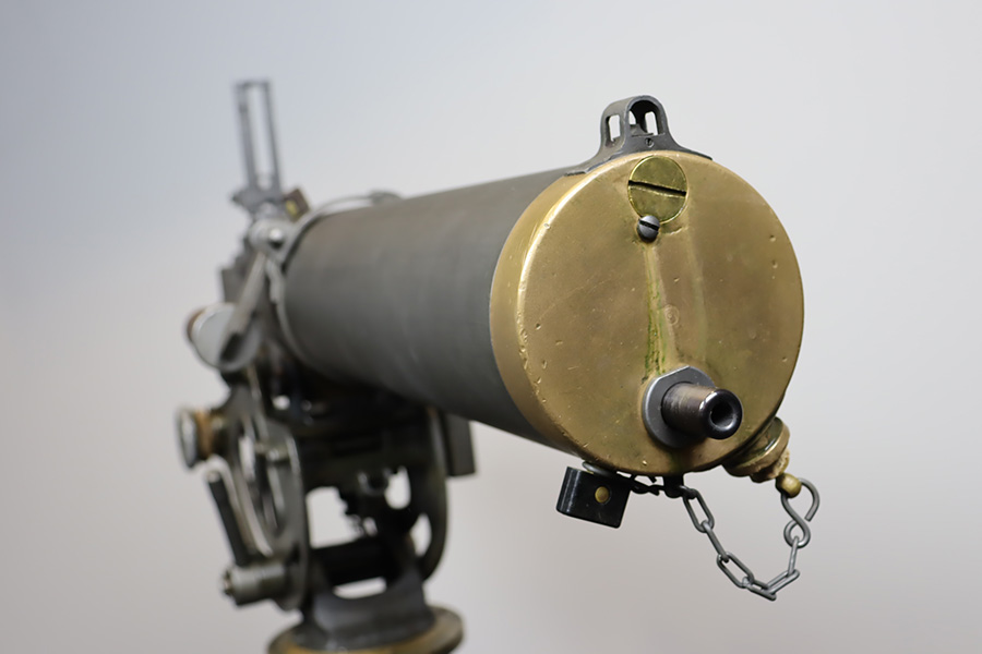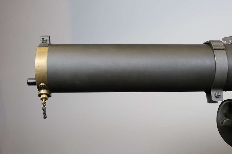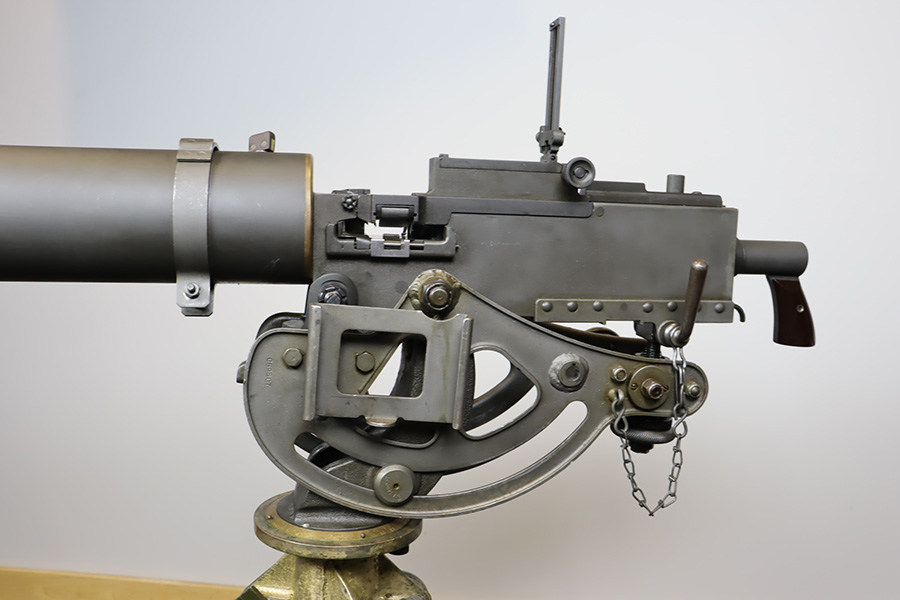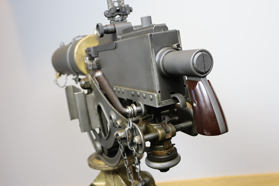 11/28/23 – This is an example of a very desirable early belt feed, medium machine gun as remanufactured by Inland Arms of Austin Texas (not to be confused with the GM Inland Division or the Inland Arms currently located in Dayton, Ohio). The 1917 series of machine guns were developed right at the end of WWI; however, they saw service in WWII, Korea and even in Vietnam. The difference between this the 1917 series and the later 1919 series is that the 1917 was fitted with a large water jacket around the barrel to help cool it during heavy sustained fire, while the 1919 was air-cooled. This was patterned after the Maxim MGs that also used a similar water cooling system. Both the 1917 and later 1919 designs were developed by John Browning, based on a square boxed riveted receiver that was so successful it actually became the forerunner to the later M2 50cal which is still in use after over 85 years. This particular example is in fantastic condition, and currently set up to operate with 8mm Mauser. The listing does include a total of five spare barrels, including one for .30-06 and another for .308. With the proper guides, the gun can be used interchangeably with all three calibers, and the seller likely has those guides available should the buyer wish to purchase them. There are many extras included with this listing, including an original 1917 tripod and cradle. There is also an original ammo pouch, five spare barrels, a spare barrel pouch, the water tank, two hoses, a loading device and a case with links/belts for the ammo. The tripod is marked for the M1917A1 and labeled ‘Lamson.1942 / R.L.B.”, with those initials also on the ammo pouch. The rifling remains strong in every barrel, but a few have some pitting in them while others are excellent throughout. The seller tells us this gun appeared to be in unfired condition when he bought it many years ago, and ran flawlessly for him. Fully transferrable.