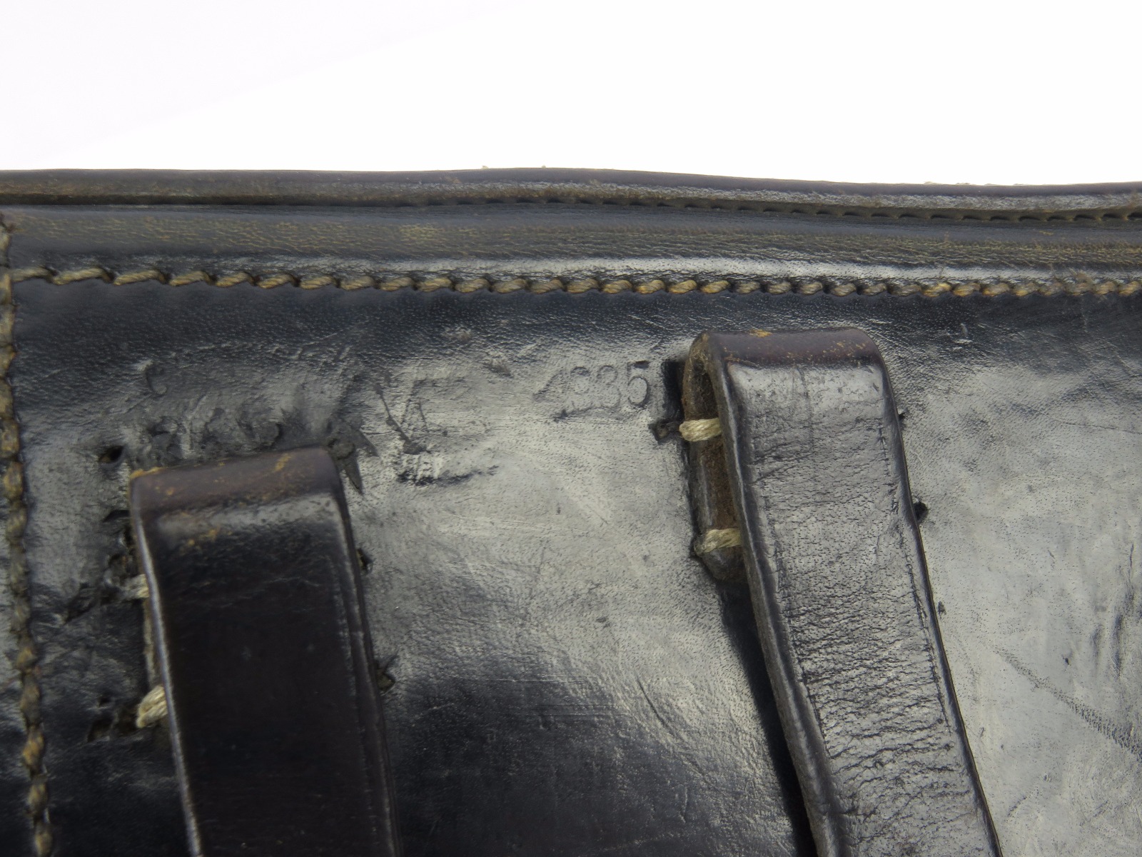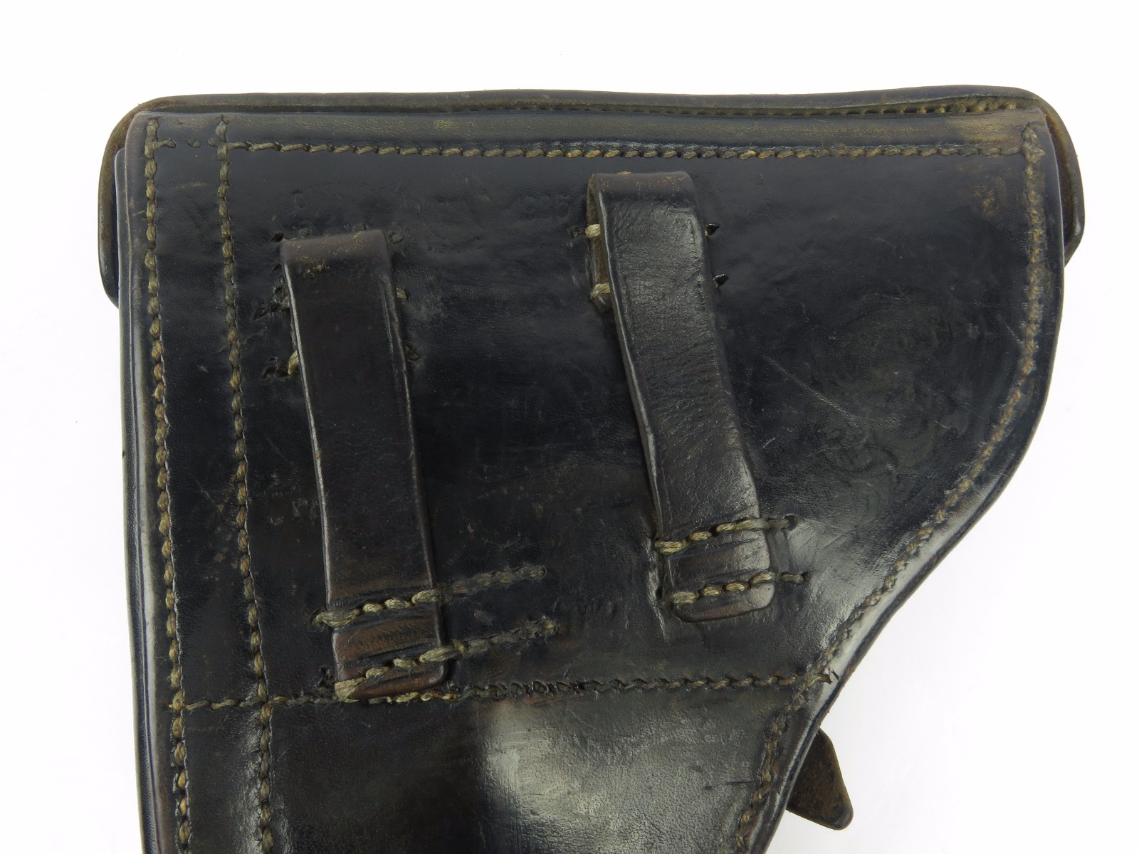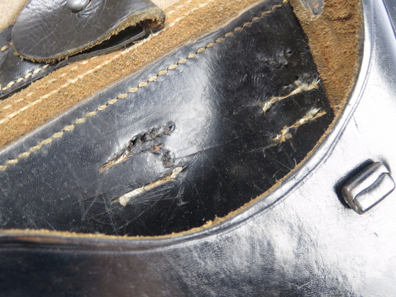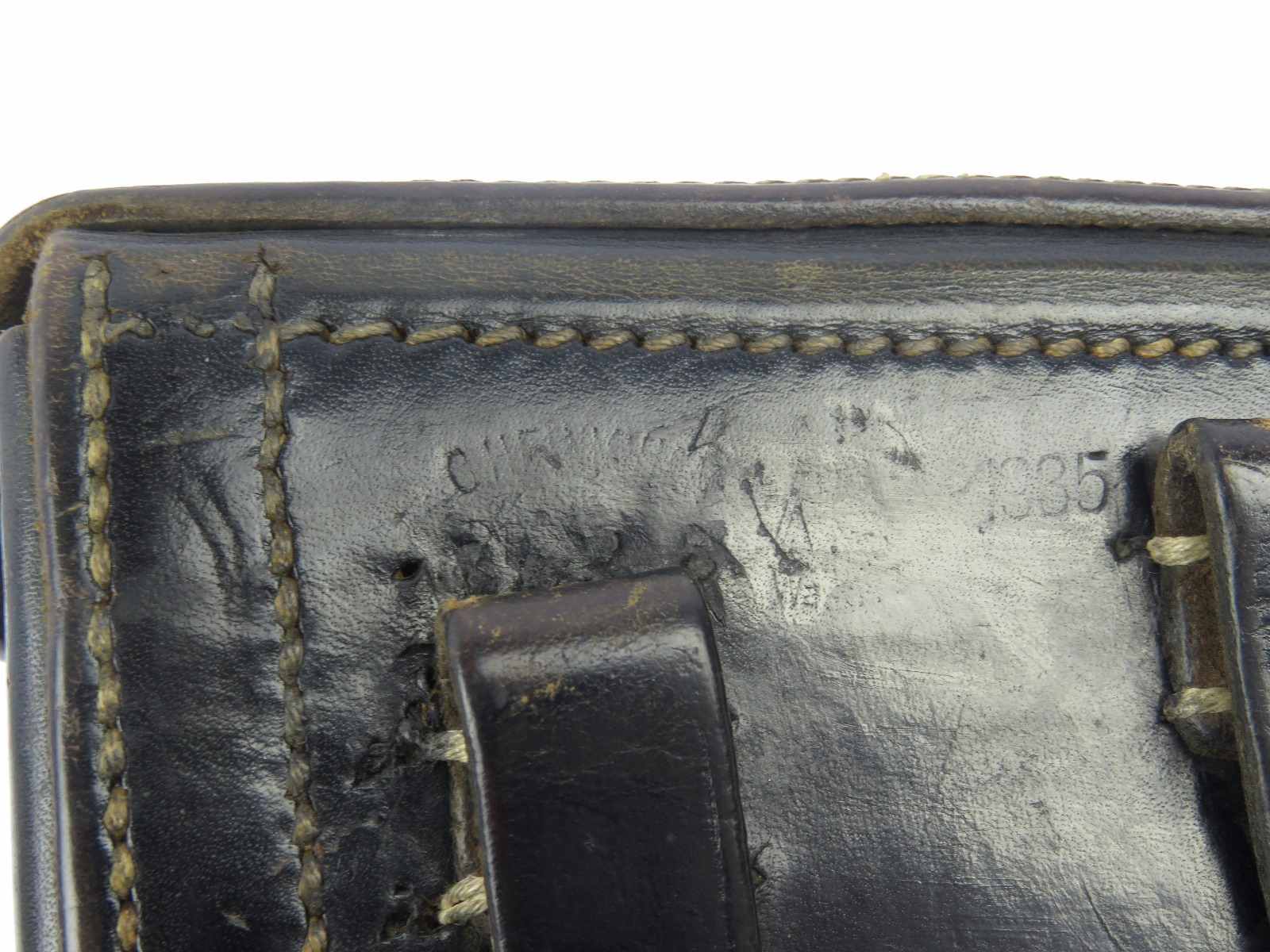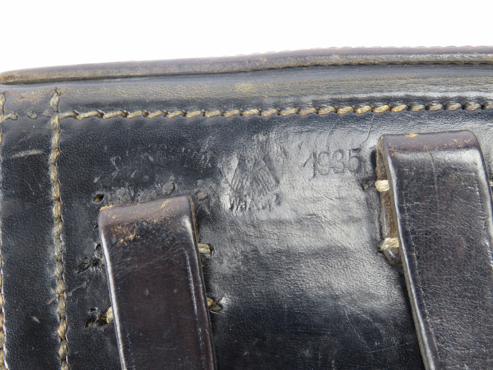 10/31/17 – The G Date (1935) Luger holster is the least common of all P.08 holsters from WW2. Most speculate this was due to the “secret production” of arms by Germany, and an abundance of 1934 K Date holsters. Regardless, the hardest year to find for Luger holsters is 1935. This holster is 1935 dated on the back leather with a droop eagle waffen proof and a faint maker stamp. The holster has firm leather in great condition overall. The only real issue with this holster is an extra line of stitching/adjustment made on the back left strap. The back right strap appears to have one or two stitches of replacement thread. Otherwise there are no major flaws. The exterior leather shows light signs of polish as you can almost see “stroke” marks or rub marks on the leather. This could be the original polish coming off, or signs of an attempt at restoration. Regardless, the leather is all original and in tact. There is very light surface wear on the top leather – as shown in photos. The stitching besides the small issues on the belt loops is all original and authentic. Very scarce holster and nearly impossible to find in this condition! Guaranteed original.