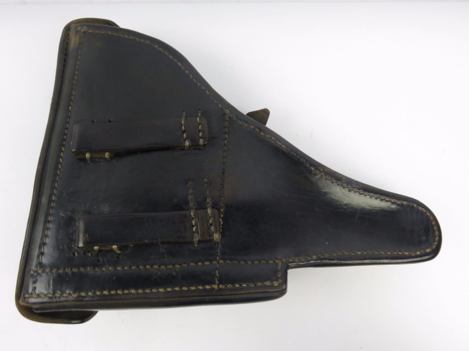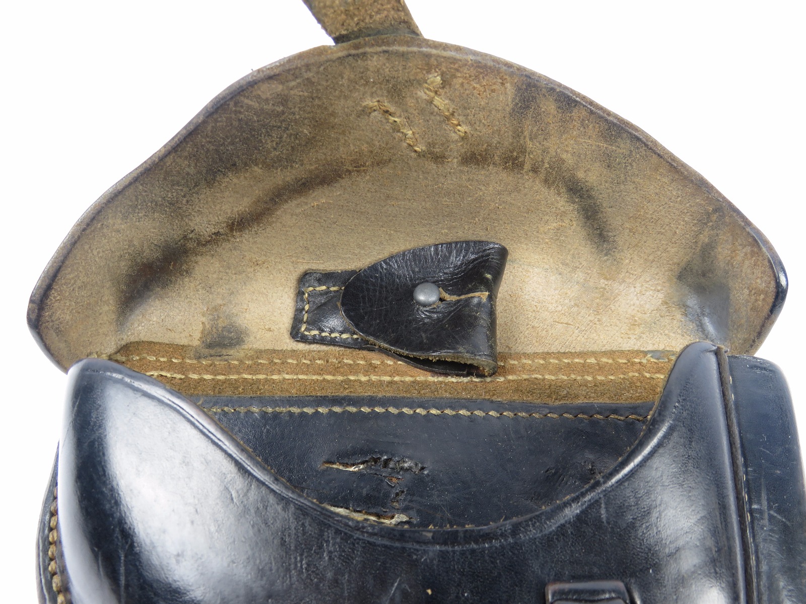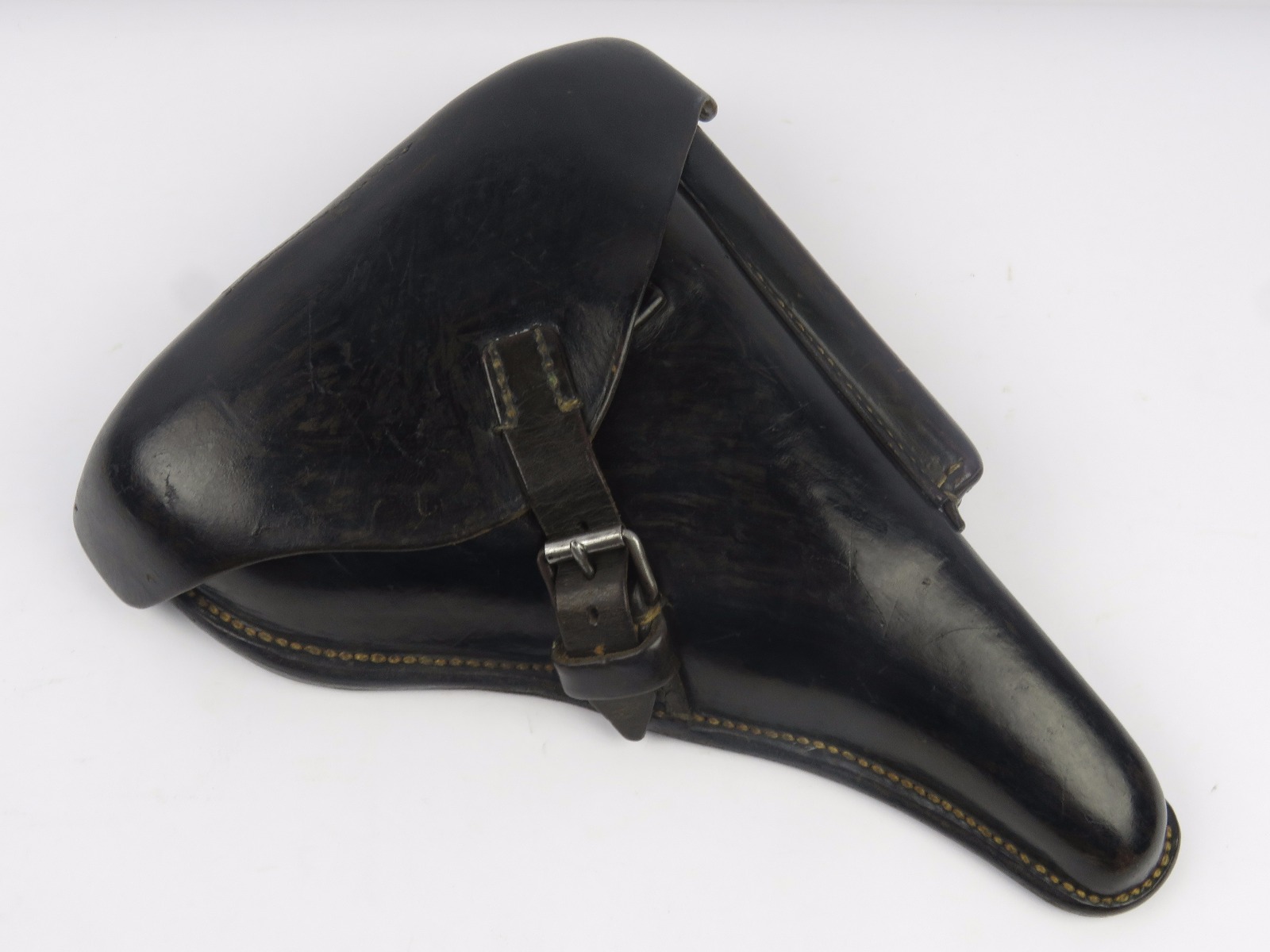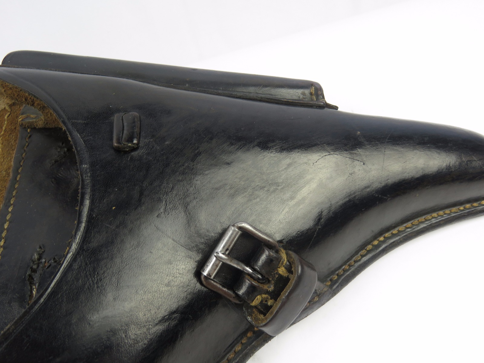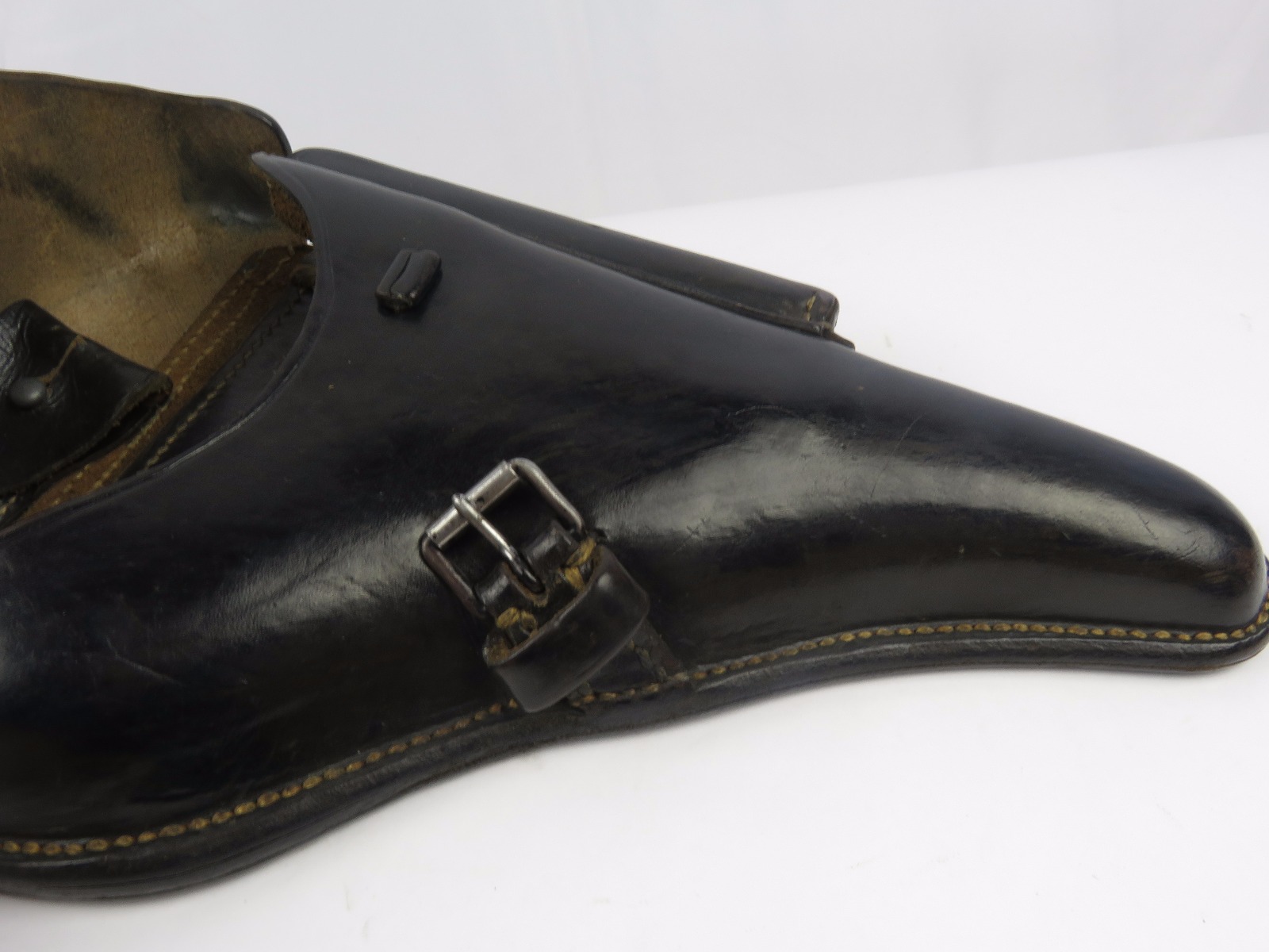 10/31/17 – The G Date (1935) Luger holster is the least common of all P.08 holsters from WW2. Most speculate this was due to the “secret production” of arms by Germany, and an abundance of 1934 K Date holsters. Regardless, the hardest year to find for Luger holsters is 1935. This holster is 1935 dated on the back leather with a droop eagle waffen proof and a faint maker stamp. The holster has firm leather in great condition overall. The only real issue with this holster is an extra line of stitching/adjustment made on the back left strap. The back right strap appears to have one or two stitches of replacement thread. Otherwise there are no major flaws. The exterior leather shows light signs of polish as you can almost see “stroke” marks or rub marks on the leather. This could be the original polish coming off, or signs of an attempt at restoration. Regardless, the leather is all original and in tact. There is very light surface wear on the top leather – as shown in photos. The stitching besides the small issues on the belt loops is all original and authentic. Very scarce holster and nearly impossible to find in this condition! Guaranteed original.