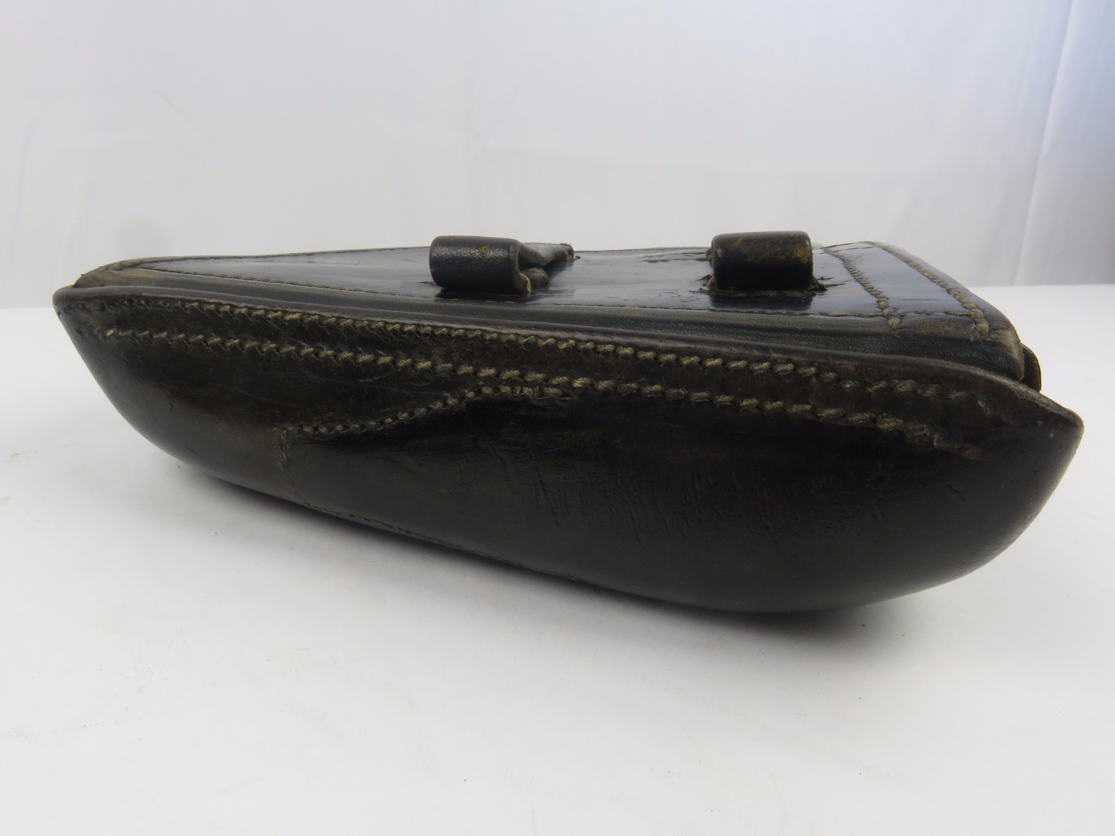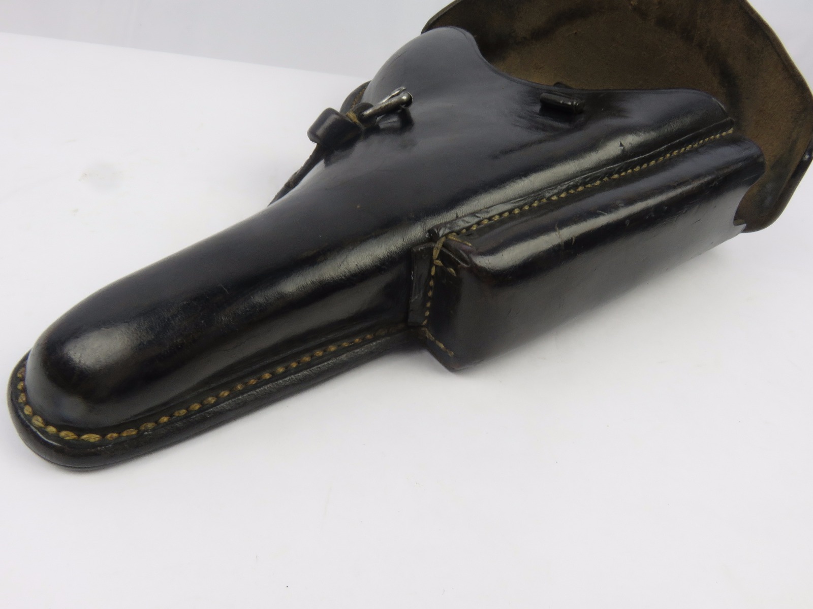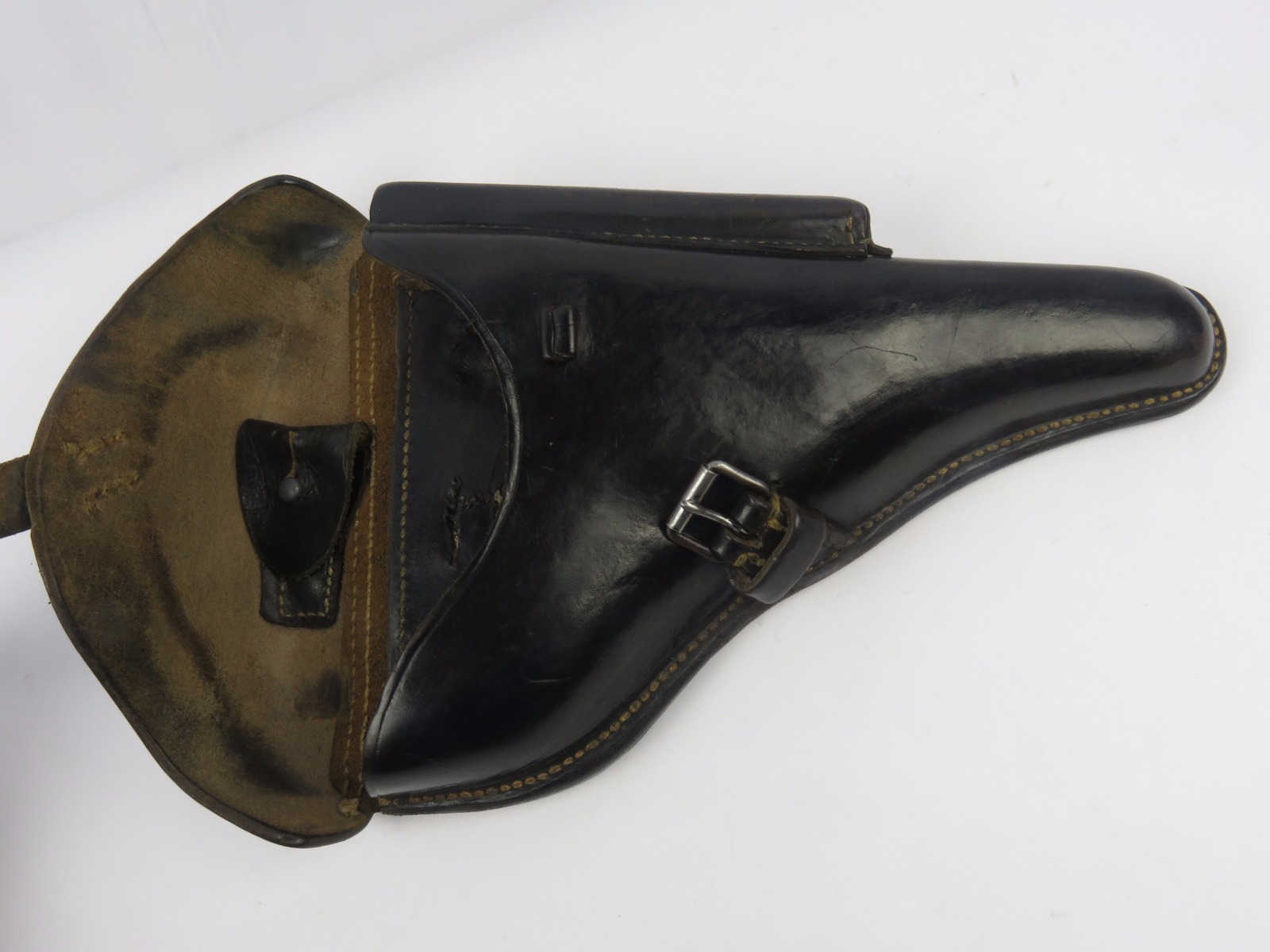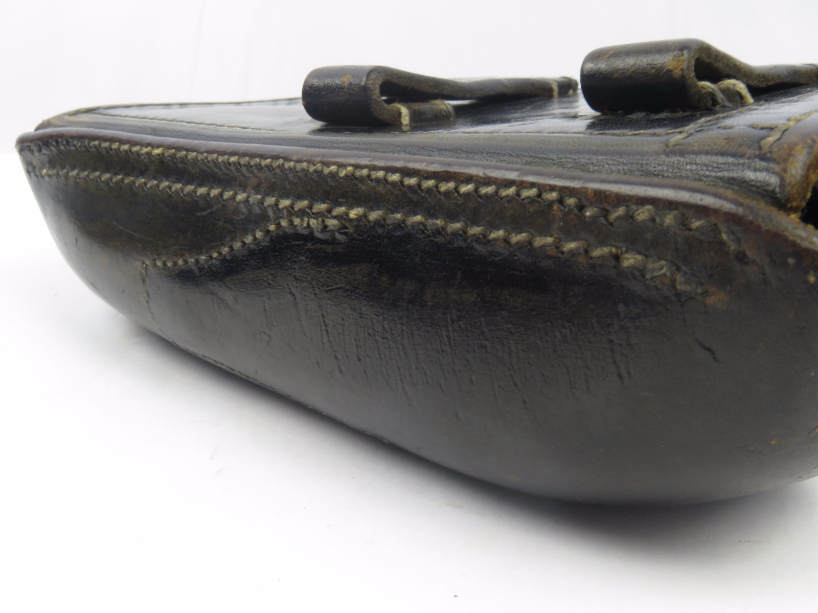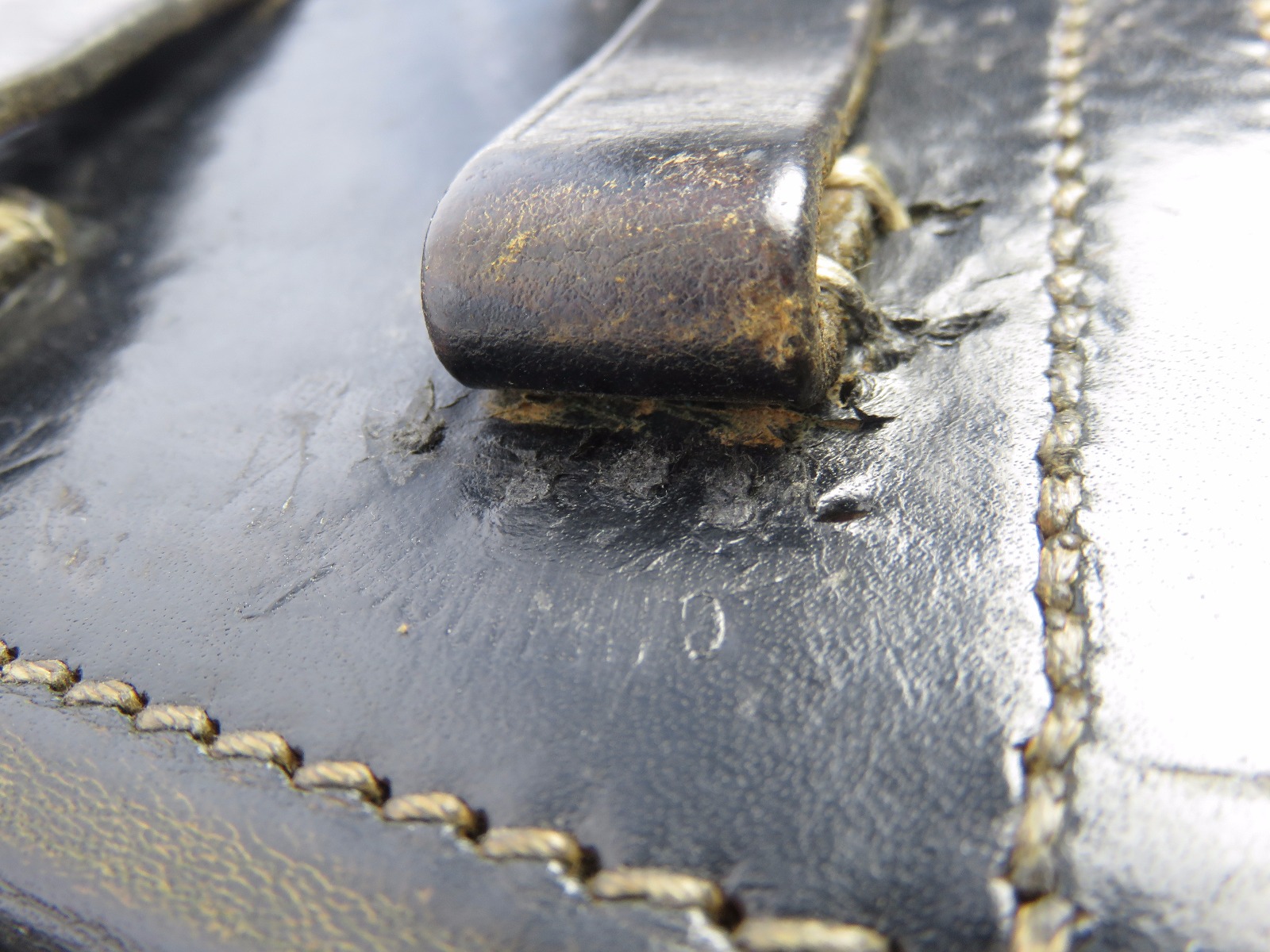10/31/17 – The G Date (1935) Luger holster is the least common of all P.08 holsters from WW2. Most speculate this was due to the “secret production” of arms by Germany, and an abundance of 1934 K Date holsters. Regardless, the hardest year to find for Luger holsters is 1935. This holster is 1935 dated on the back leather with a droop eagle waffen proof and a faint maker stamp. The holster has firm leather in great condition overall. The only real issue with this holster is an extra line of stitching/adjustment made on the back left strap. The back right strap appears to have one or two stitches of replacement thread. Otherwise there are no major flaws. The exterior leather shows light signs of polish as you can almost see “stroke” marks or rub marks on the leather. This could be the original polish coming off, or signs of an attempt at restoration. Regardless, the leather is all original and in tact. There is very light surface wear on the top leather – as shown in photos. The stitching besides the small issues on the belt loops is all original and authentic. Very scarce holster and nearly impossible to find in this condition! Guaranteed original.