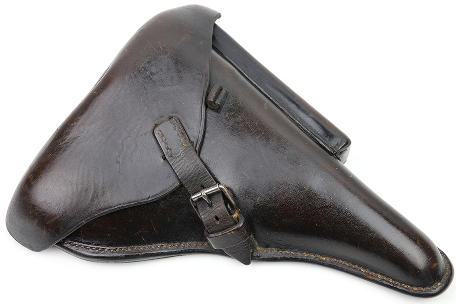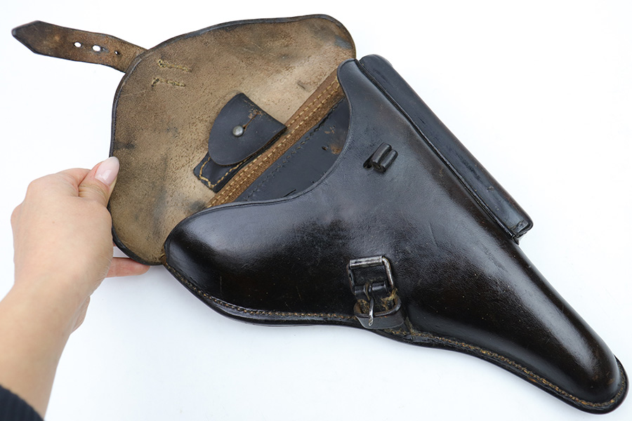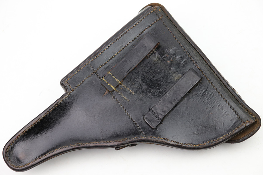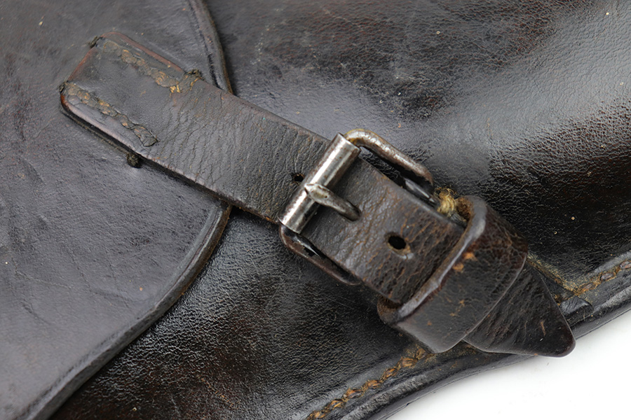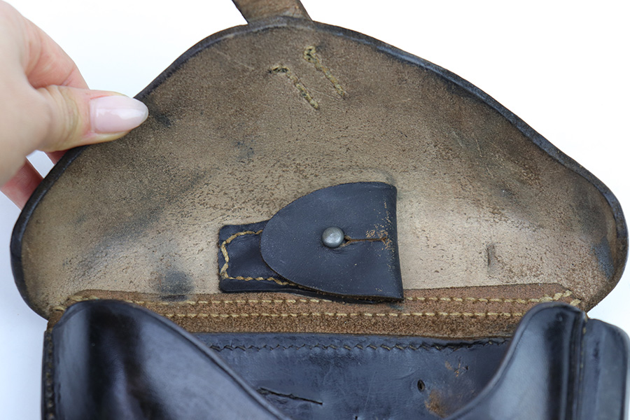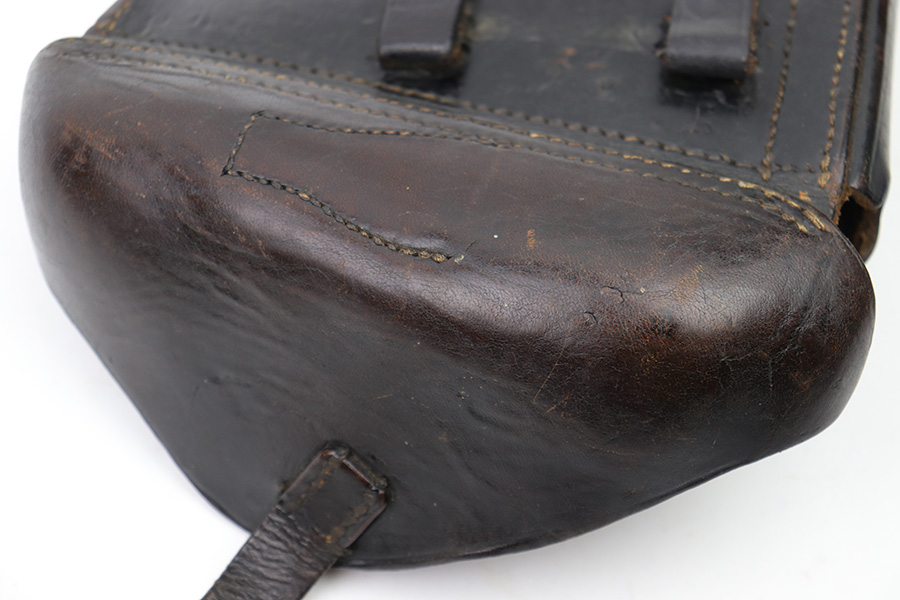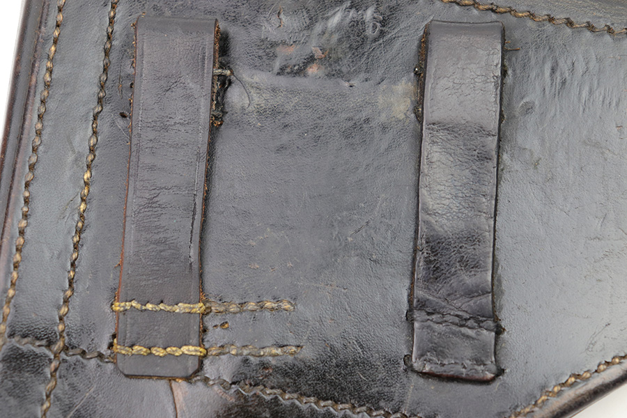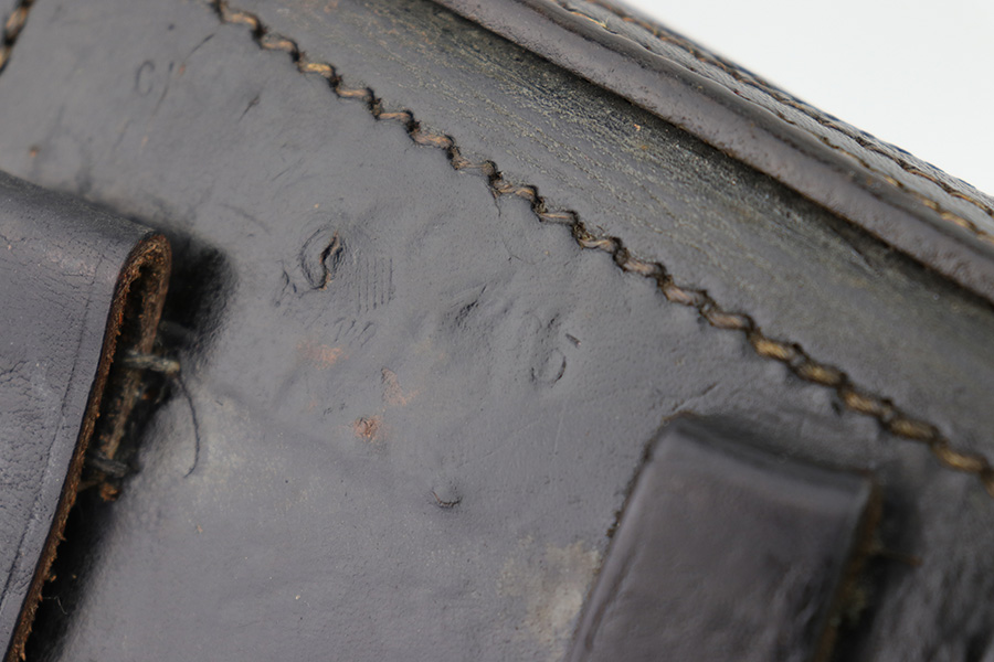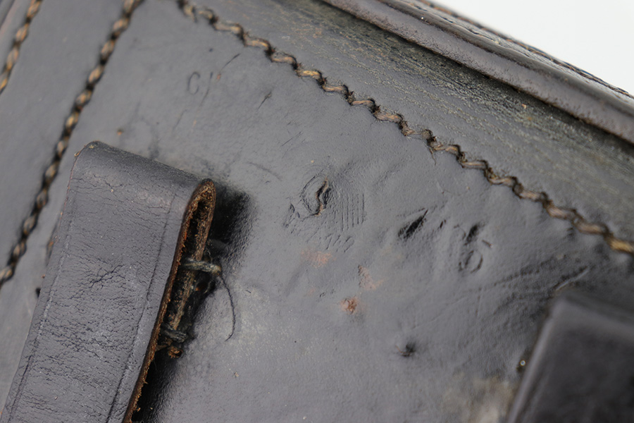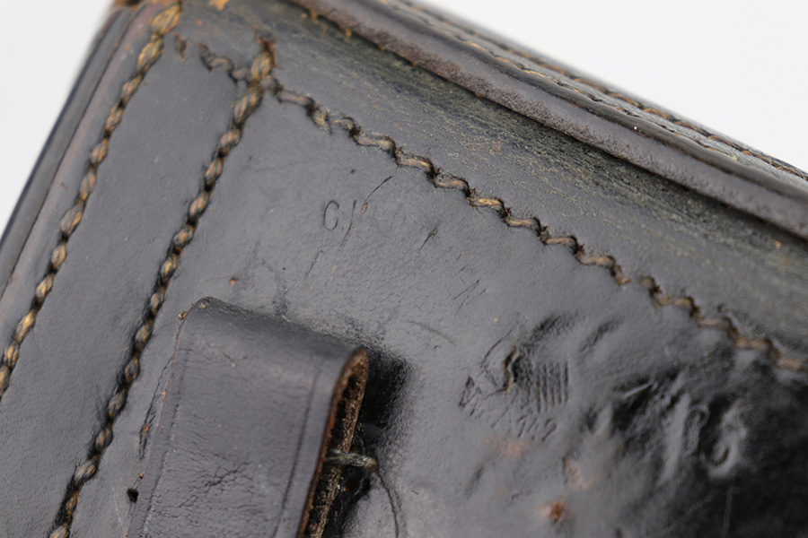 3/28/23 – This is an original 1935 “G Date” Luger holster from WW2. The holster is stamped on the back leather with a maker stamp by “C.Heinichen”, WaA142 military proof, and 1935 date. The date is hard to read, but the “5” is clearly visible, as well as the tops of each preceding number. This is by far the most rare variation WW2 military luger holster, as not many holsters were made during 1935. This example is in great condition except for the poorly struck stamps on the back leather and some repaired stitching on the back-left belt loop, as shown. The rest of the stitching is original and intact. The leather has mild pliability and great shape overall. There’s some light surface wrinkling on the lid and closure strap. Clean interior leather.