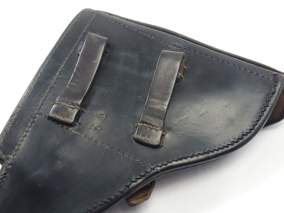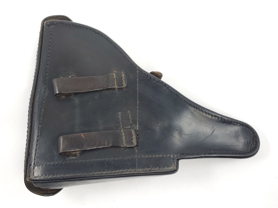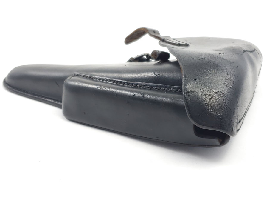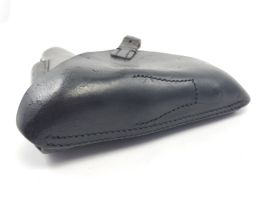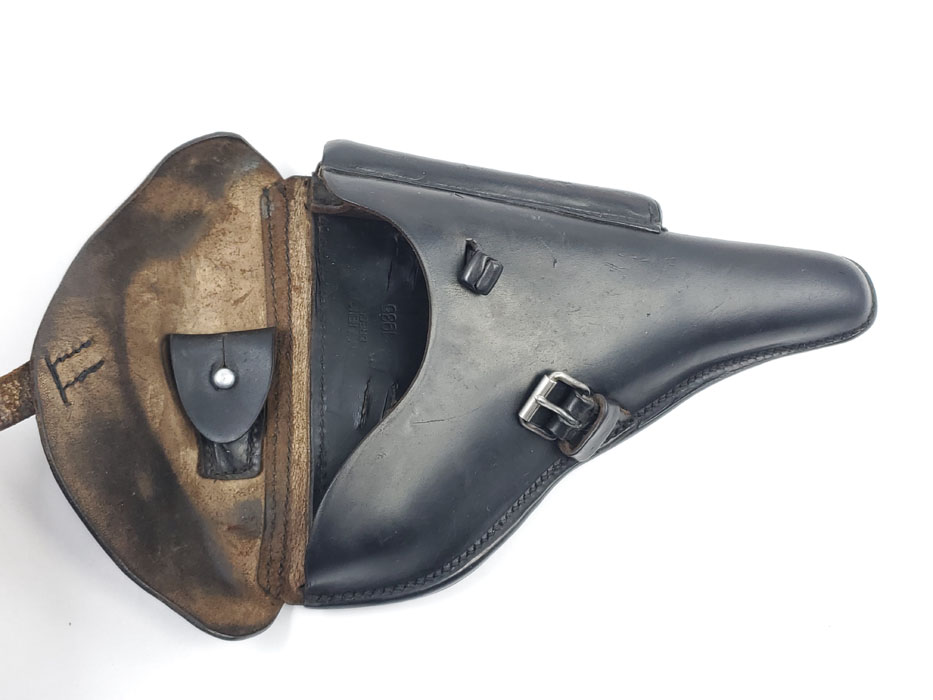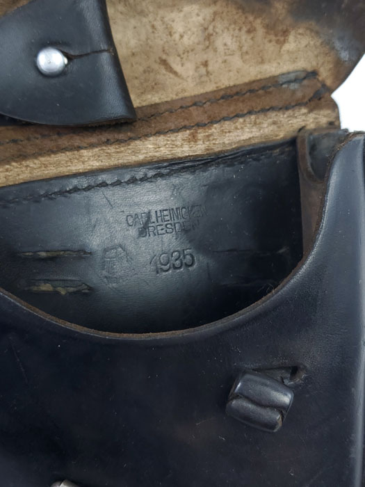 3/25/20 – This is an extremely hard to find 1935 dated Luger holster. By far the most scarce year to find for a P.08. Some theorize it’s because they made way too many in 1934, but regardless there are far less 1935 dated holsters than any other year. This holster is very well stamped on the interior leather with a maker marking, date, and military proof. The black leather has normal pliability and no excessive wear. Overall in near-excellent condition. No notable stitching flaws. An extremely rare find.