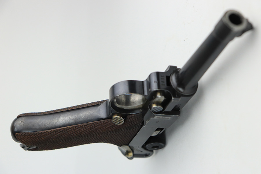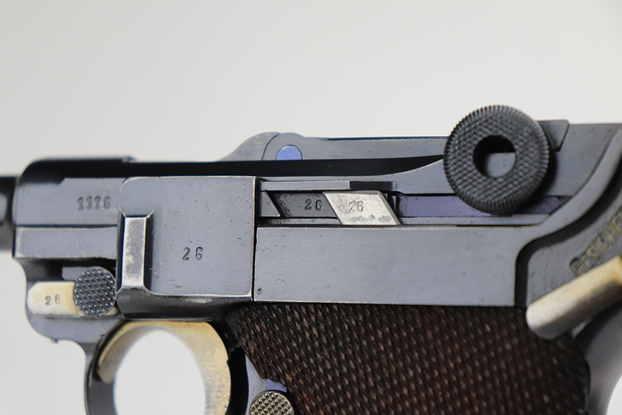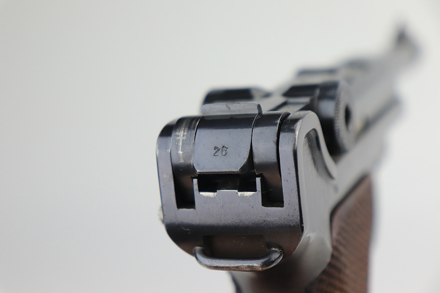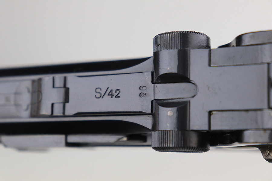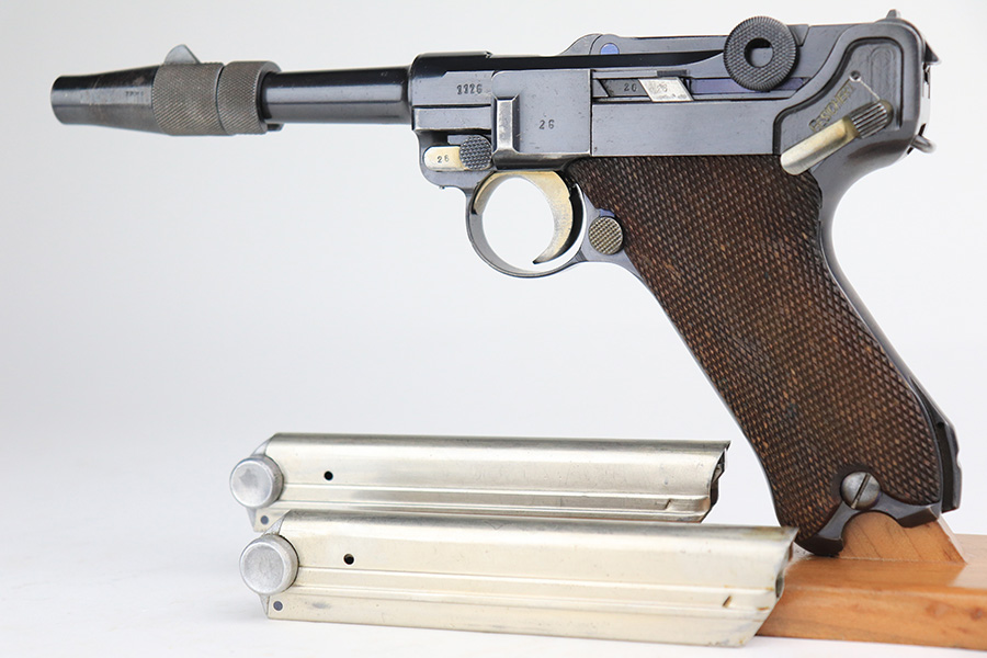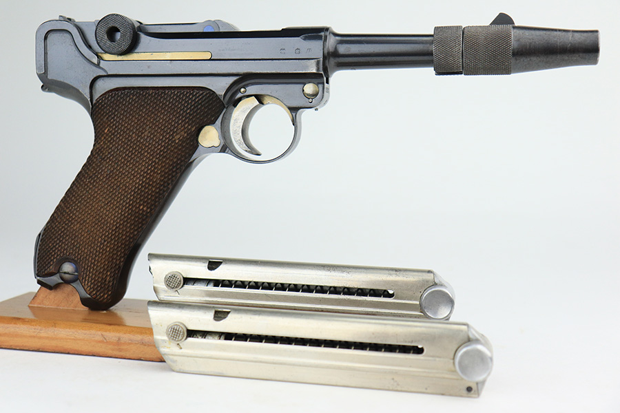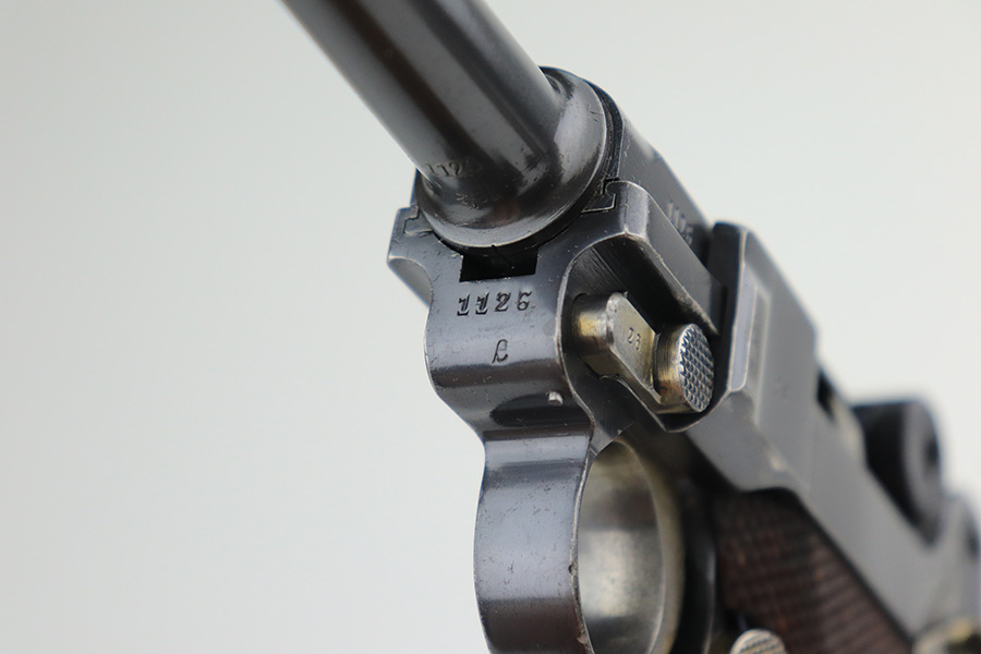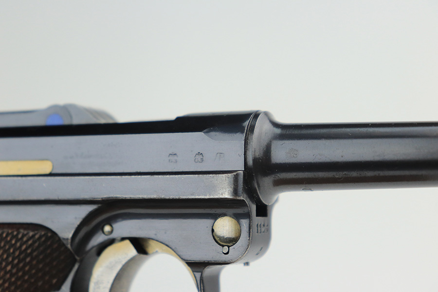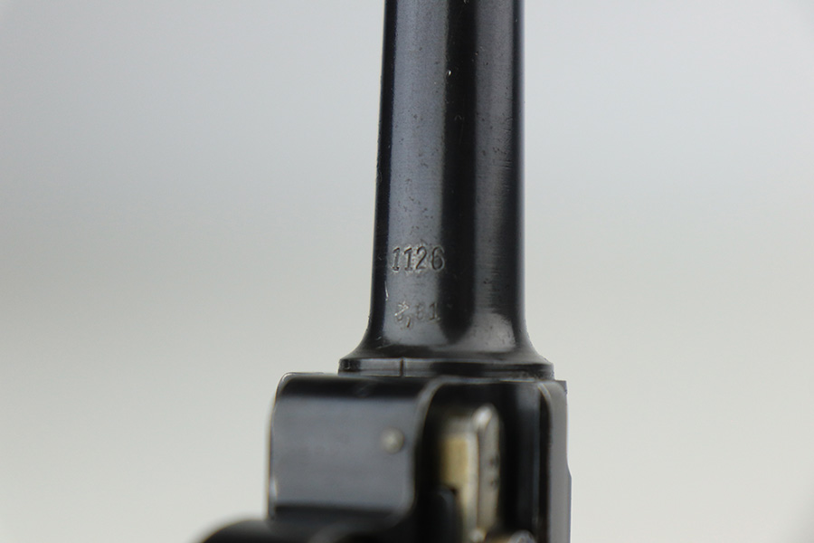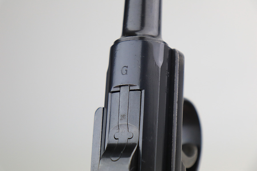 12/3/21 – This is a rare, complete G Date Mauser Luger rig with holster, muzzle thread protector, spare magazine, tool and one of the original, matching magazines. The pistol has about 90% of the original blue remaining, with an excellent profile view. Minor holster wear on right side rail and sideplate, but majority of the finish loss is on the grip straps. About 90% of the original straw remains. All matching numbers throughout, including the grips and one magazine. Spare magazine is a period mismatch. The grips show a little bit of handling wear but in great shape overall. Bore is generally clean with strong rifling. The rig includes an original E/63 tool, and a rare muzzle protector. It’s completed by the even more rare, original G Date holster. It’s 1935 dated and shows some age and handling wear but no major issues.