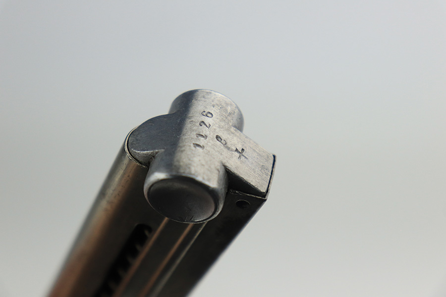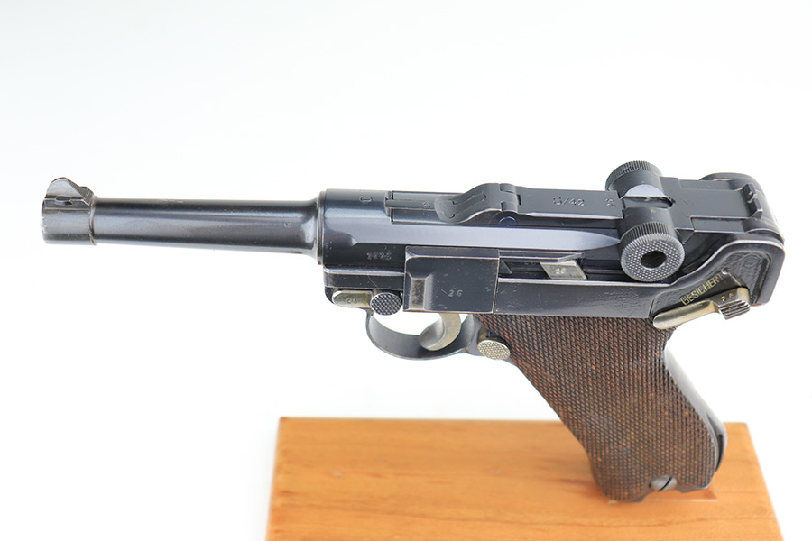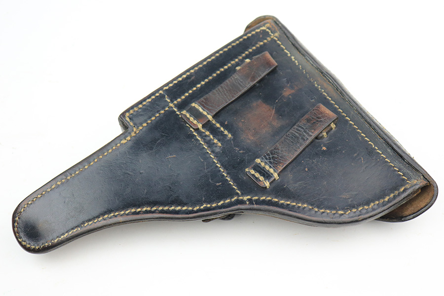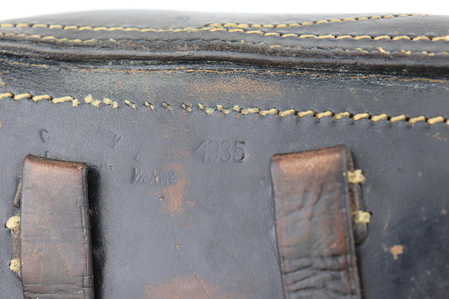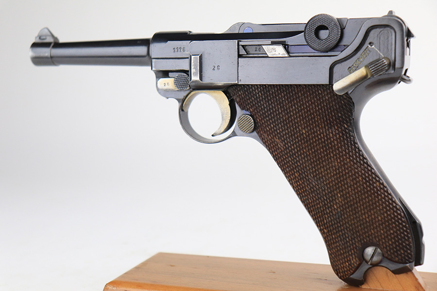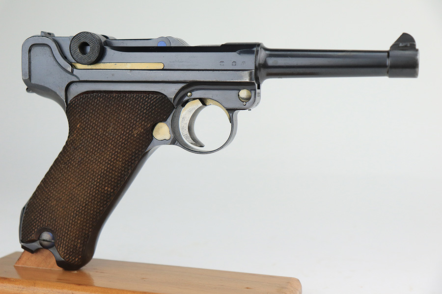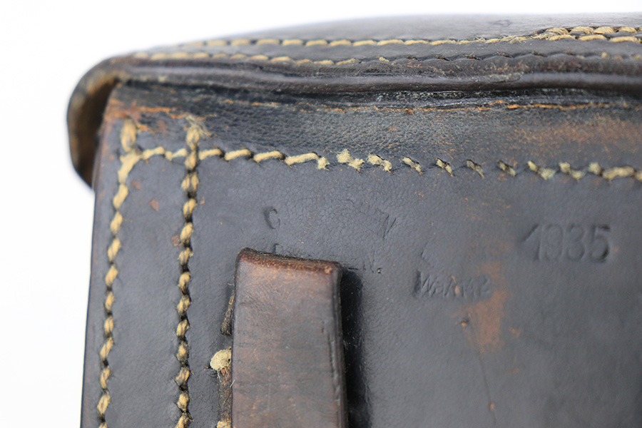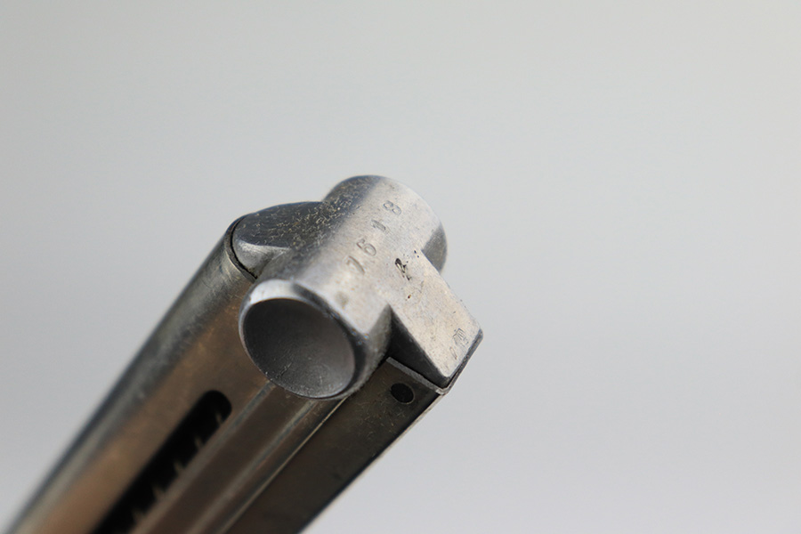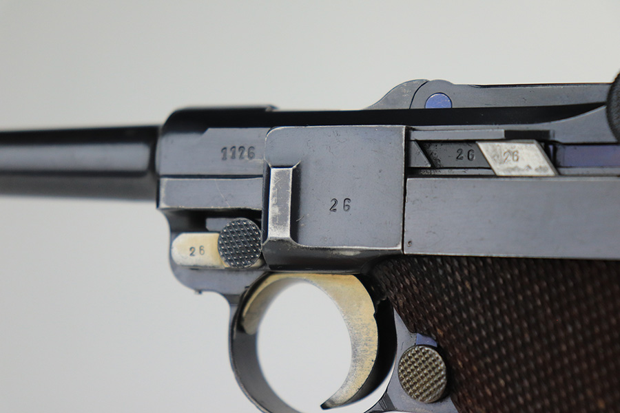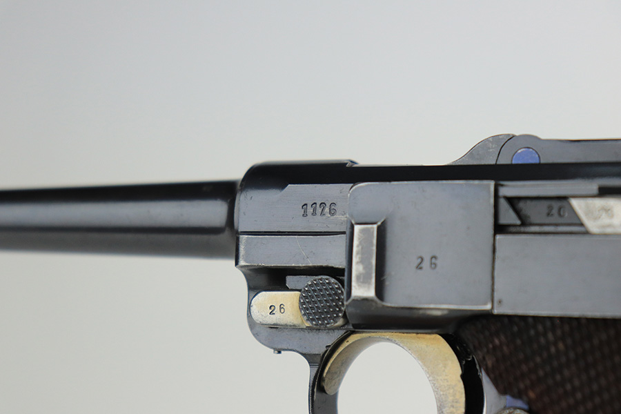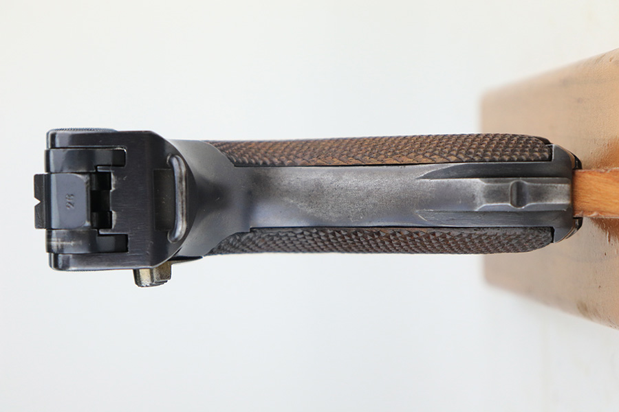 12/3/21 – This is a rare, complete G Date Mauser Luger rig with holster, muzzle thread protector, spare magazine, tool and one of the original, matching magazines. The pistol has about 90% of the original blue remaining, with an excellent profile view. Minor holster wear on right side rail and sideplate, but majority of the finish loss is on the grip straps. About 90% of the original straw remains. All matching numbers throughout, including the grips and one magazine. Spare magazine is a period mismatch. The grips show a little bit of handling wear but in great shape overall. Bore is generally clean with strong rifling. The rig includes an original E/63 tool, and a rare muzzle protector. It’s completed by the even more rare, original G Date holster. It’s 1935 dated and shows some age and handling wear but no major issues.