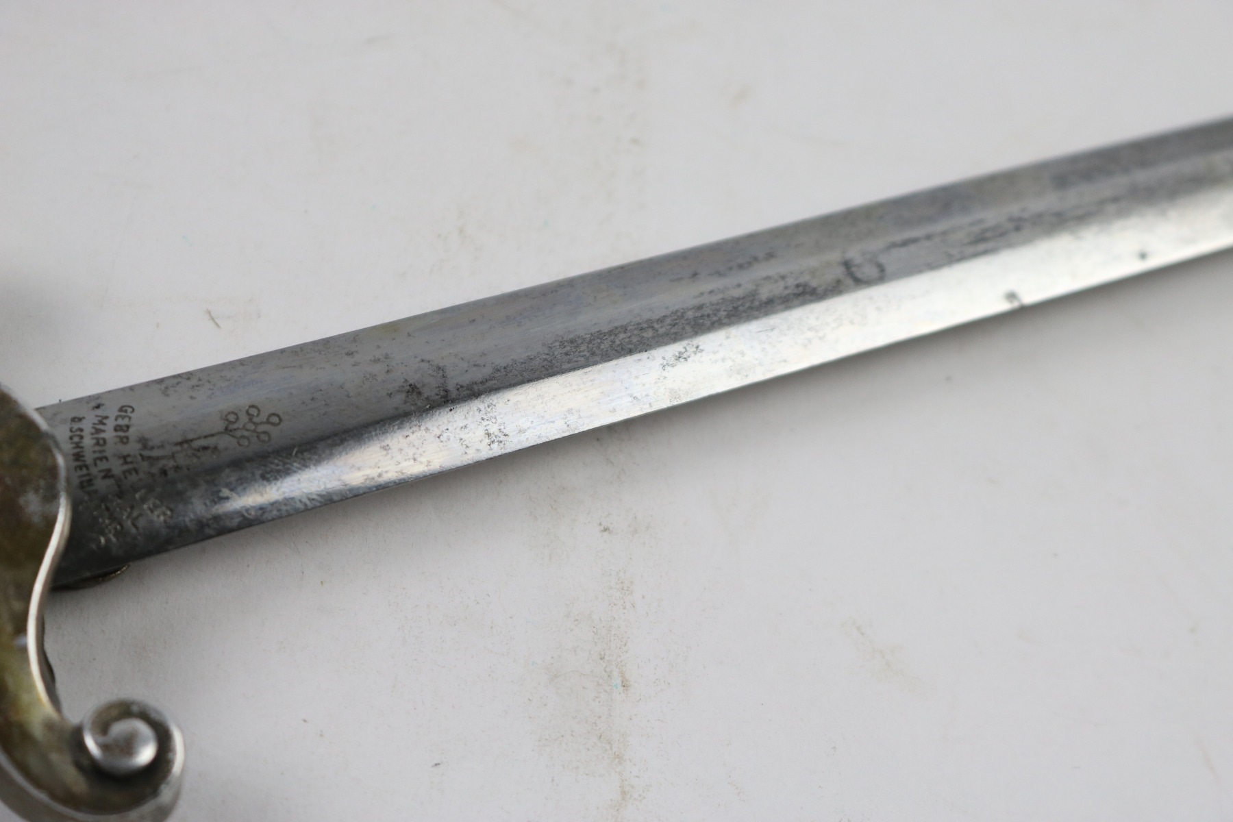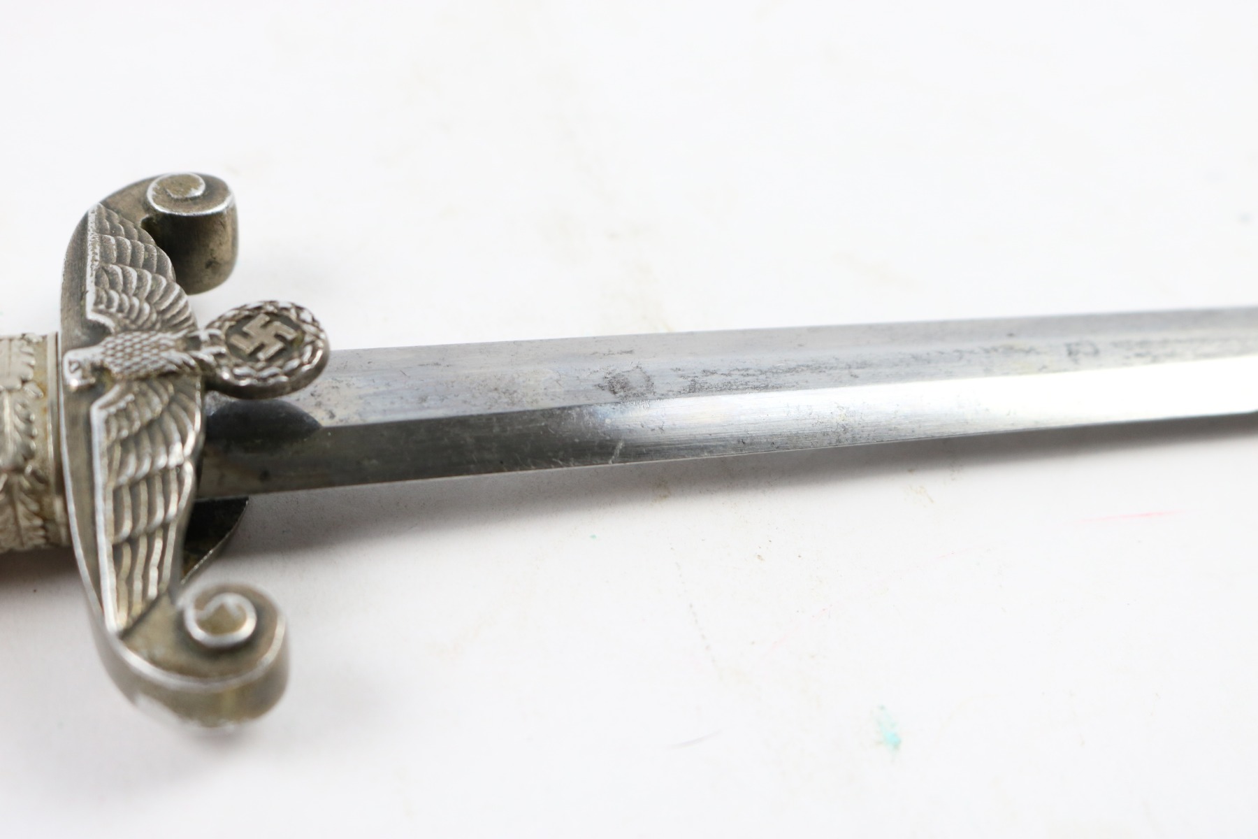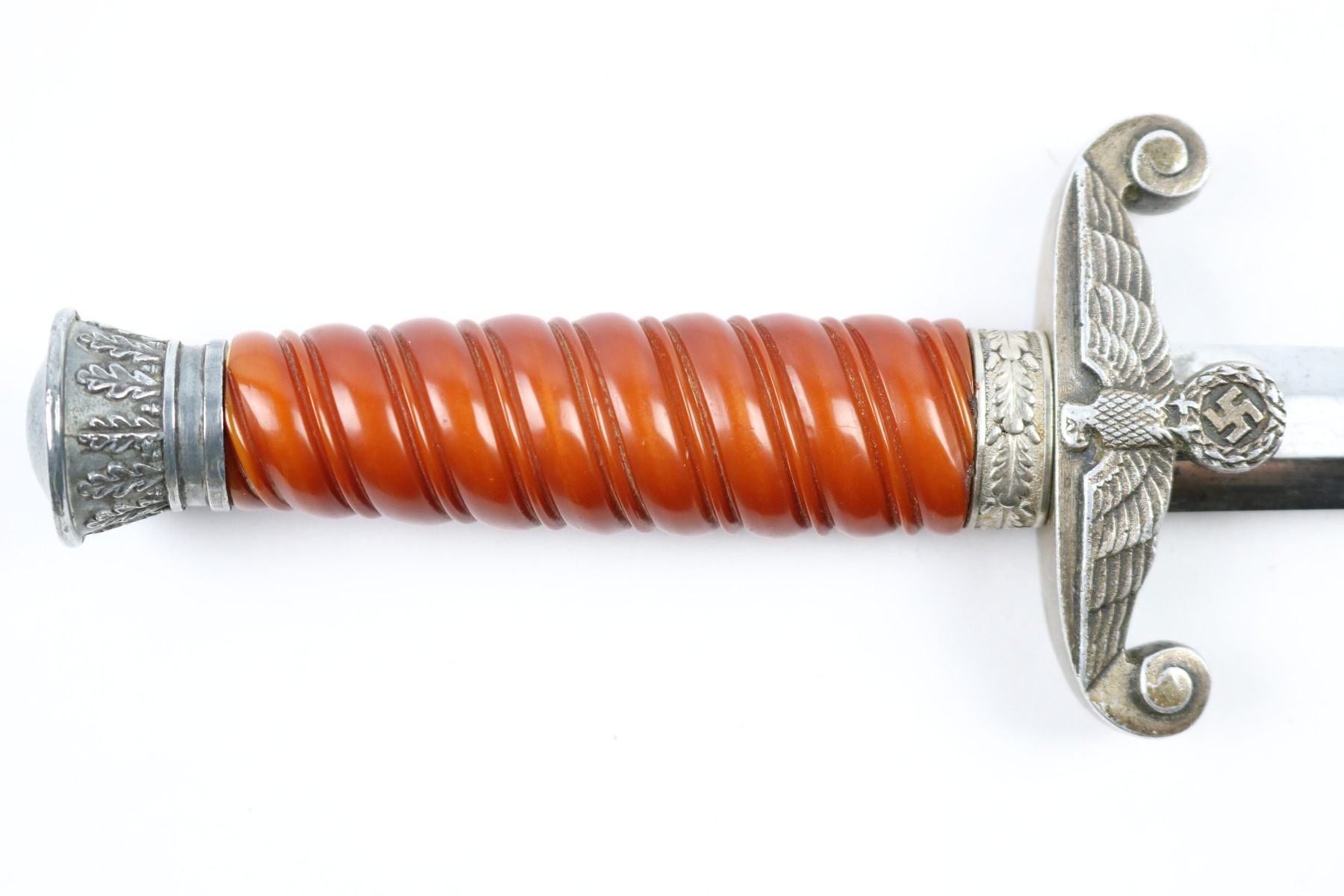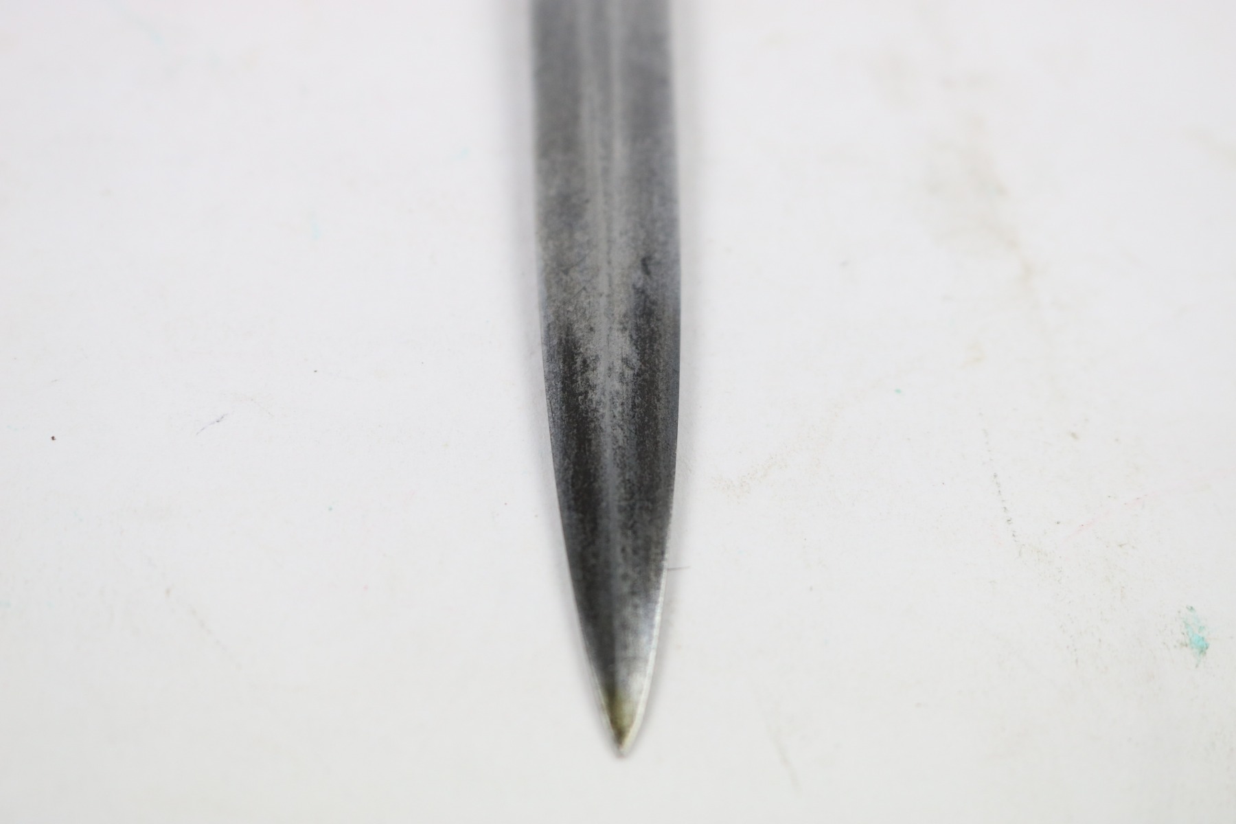 5/18/18 – This is an original WW2 nazi army dagger. The dagger has an extremely rare maker, Gebr. Heller Marienthal – a logo with a child holding balloons. The blade has some light speckled wear on either side, mostly towards the tip of the blade. Theres some light discoloration and scabbard wear as well, but overall in great shape. The handle has no cracks or chips. The hand guard is slightly loose, but I believe this can be tightened and is a common flaw. The scabbard is excellent and original. Guaranteed all original and authentic.