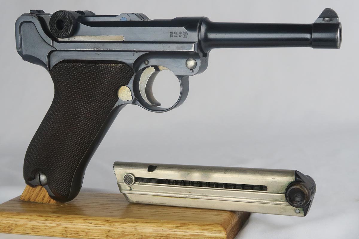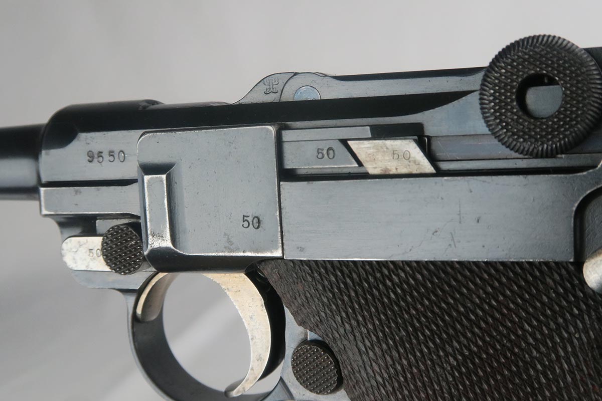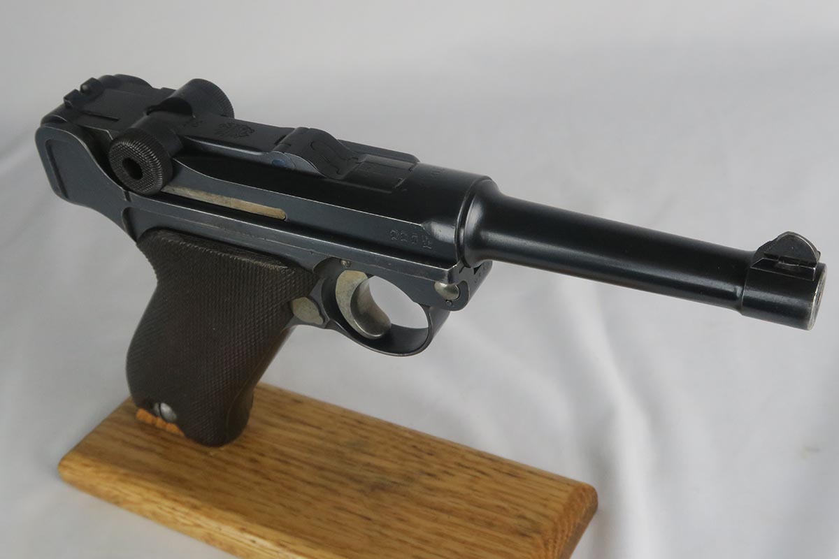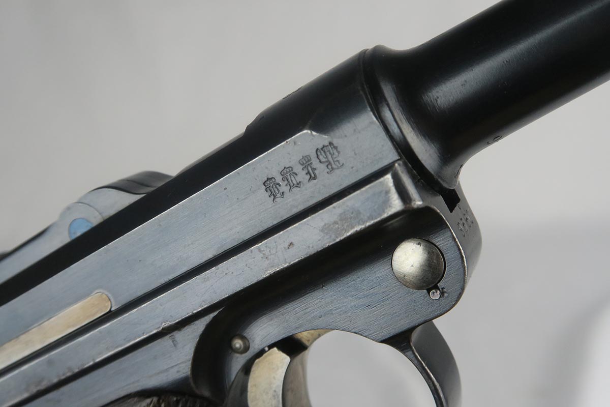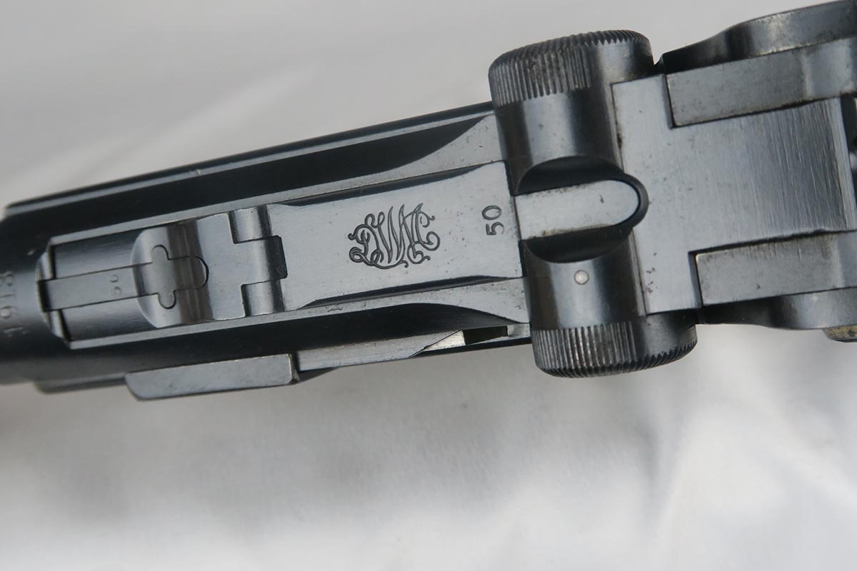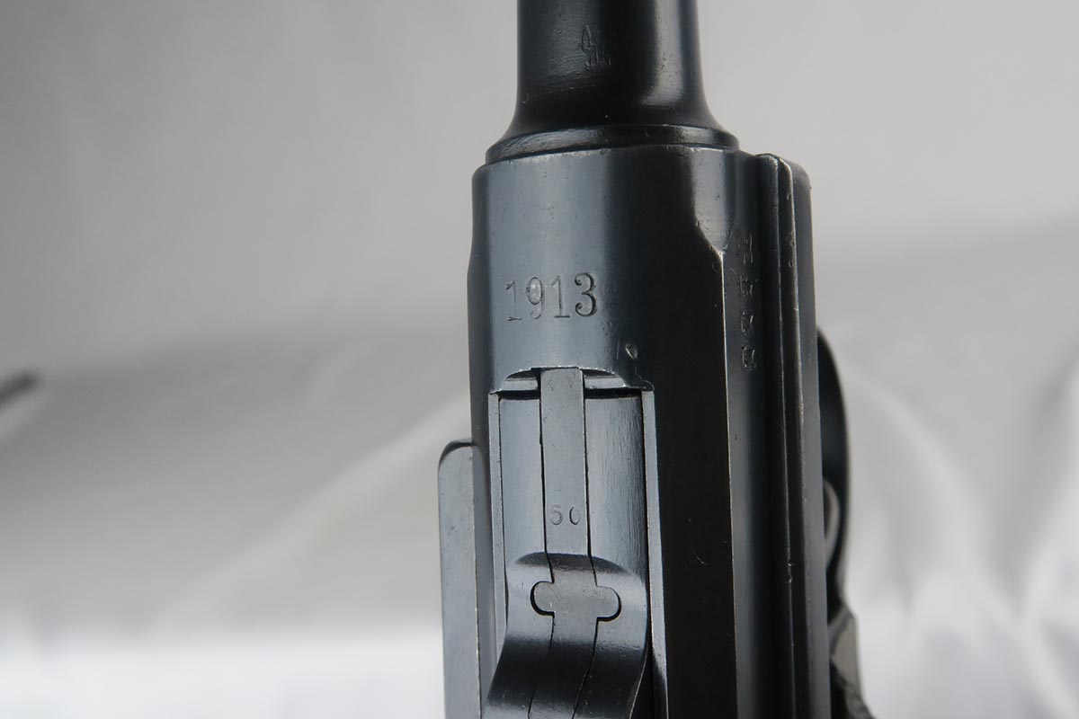 11/7/17 – This is a scarce and excellent DWM military luger from 1913, when only 20,000 were produced.  All original and correct, these pistols were generally used throughout the entire Great War, so it’s very difficult to find one in this condition. This early variation has NO hold open and no lug stock, which is correct and is what makes this variation so unique and rare.   Original finish is about 97% with some finish loss on the muzzle and sideplate.   Halos on the serial under the barrel.  The grips are matching numbered to the pistol.  The magazine is period correct but numbered to another gun in what appears to be some sort of police style.  Excellent bore.