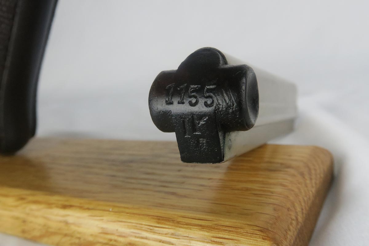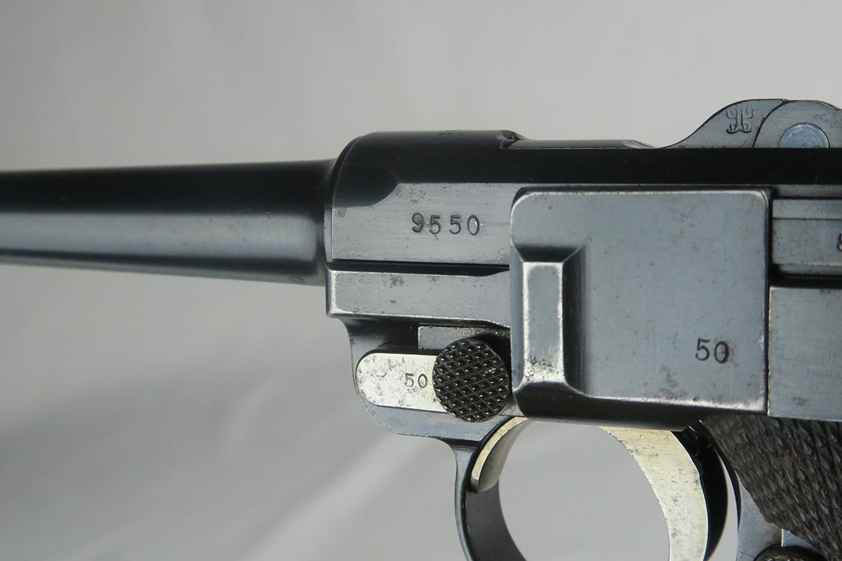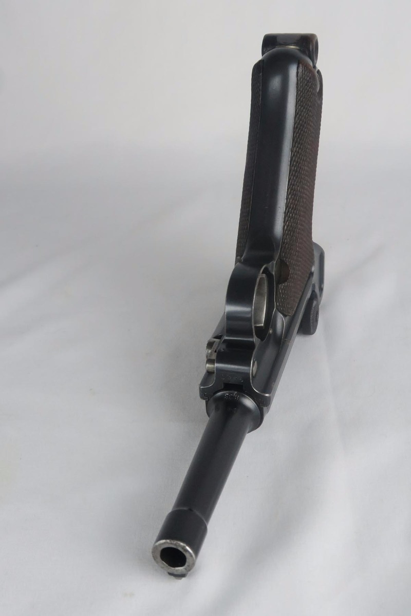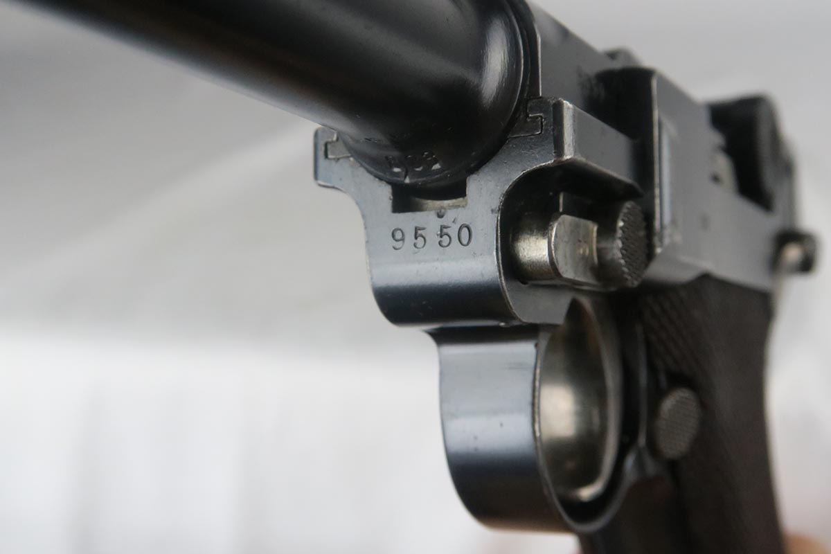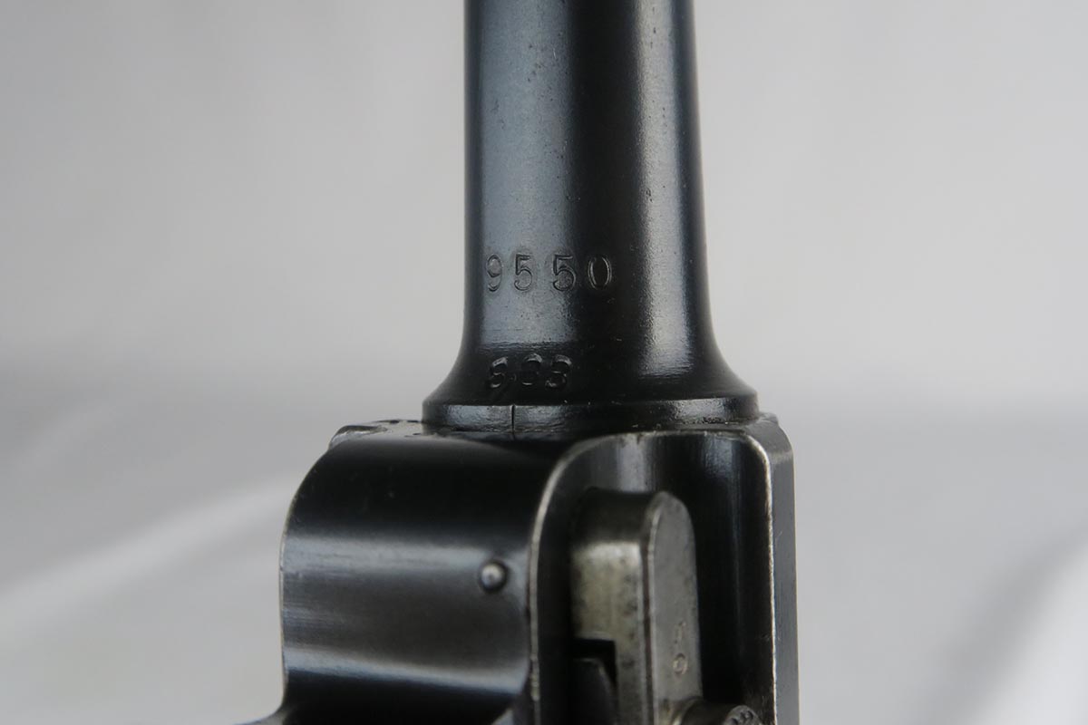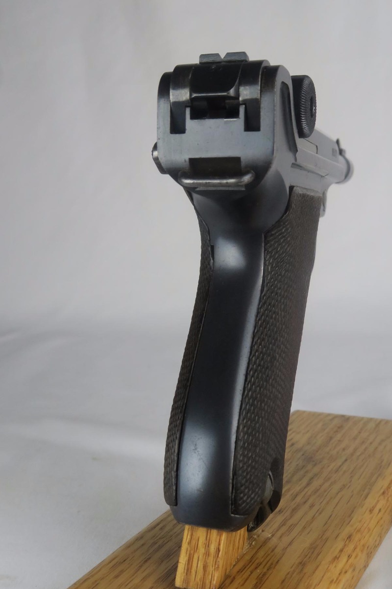 11/7/17 – This is a scarce and excellent DWM military luger from 1913, when only 20,000 were produced.  All original and correct, these pistols were generally used throughout the entire Great War, so it’s very difficult to find one in this condition. This early variation has NO hold open and no lug stock, which is correct and is what makes this variation so unique and rare.   Original finish is about 97% with some finish loss on the muzzle and sideplate.   Halos on the serial under the barrel.  The grips are matching numbered to the pistol.  The magazine is period correct but numbered to another gun in what appears to be some sort of police style.  Excellent bore.