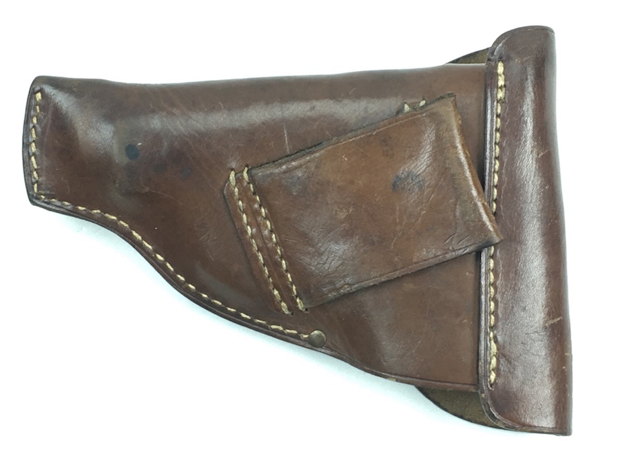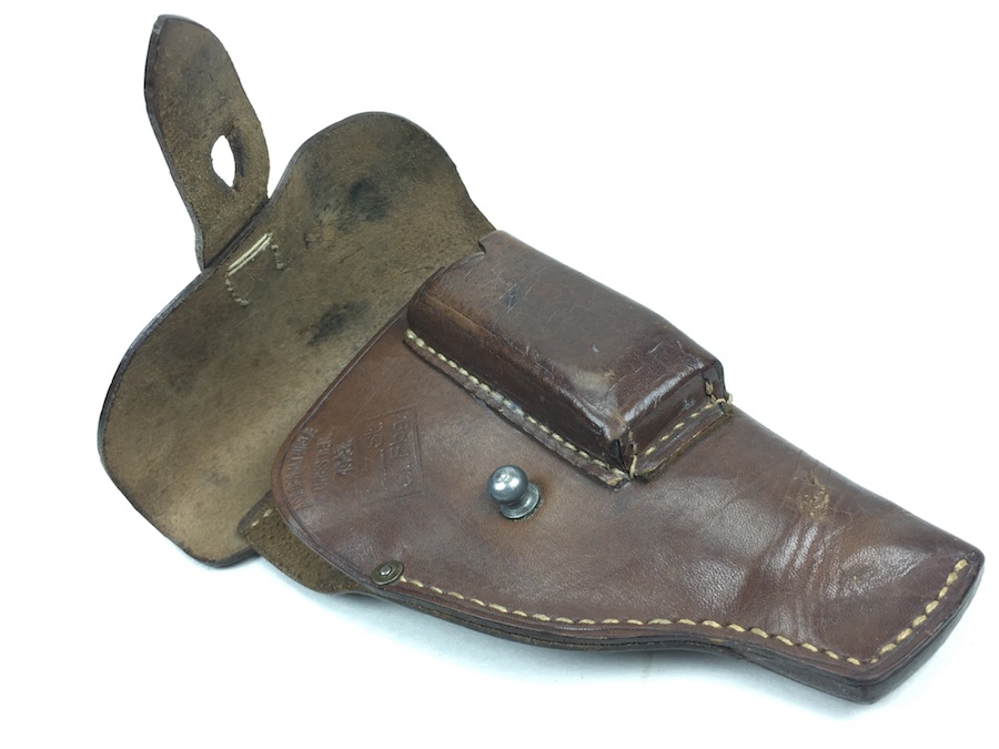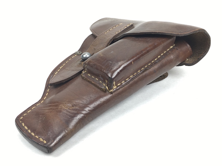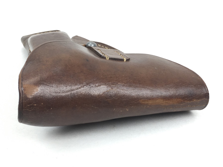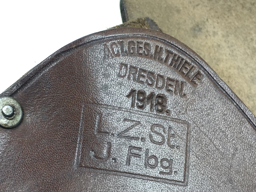 6/21/19 – Excellent and original condition from WWI. Beautiful brown leather with strong, intact stitching. Rare maker logo stamped under closure flap. “Act. Get. H. Thiele, Dresden 1918”. Very hard to find these “L.Z. St., ” stamped holsters. This make stamp is mostly found on WWI Luger or Reichsrevolver holsters. Very rarely seen on .32 cal or .25 caliber holsters. Typically used for a Walther Model 4, Sauer Model 13, Mauser model 1914, Beholla or Menta pistols.