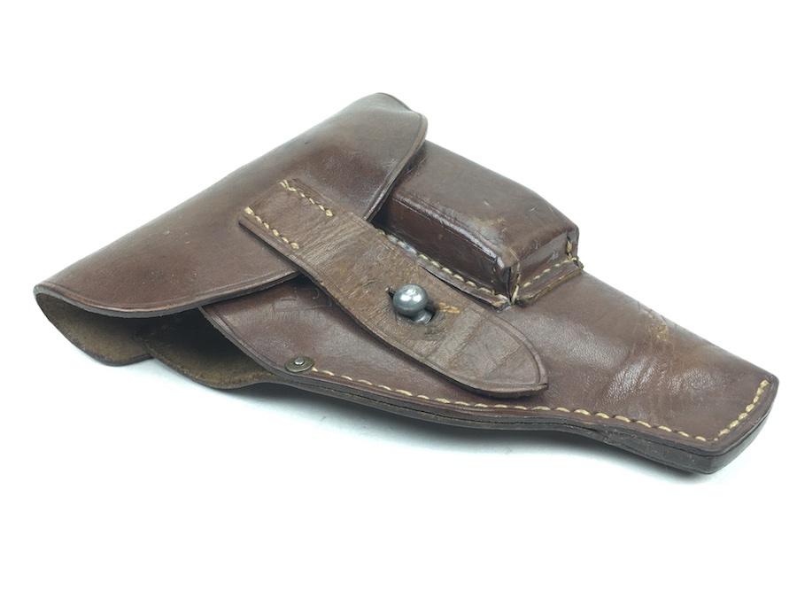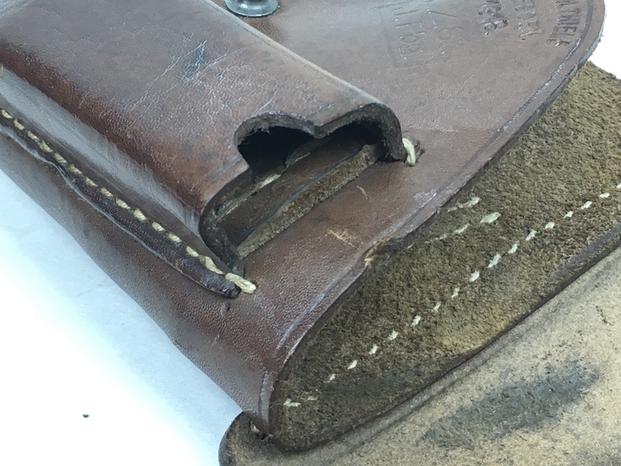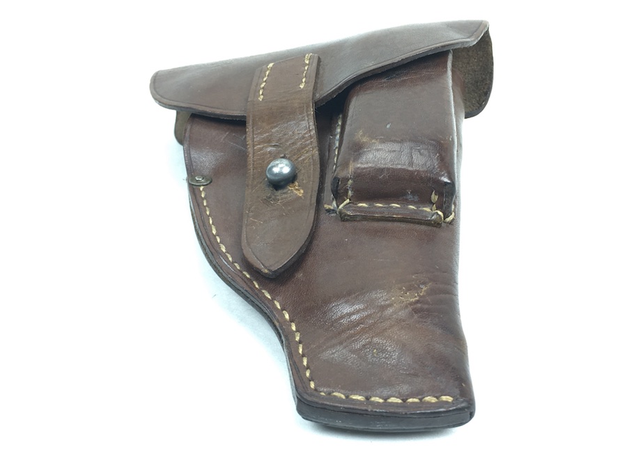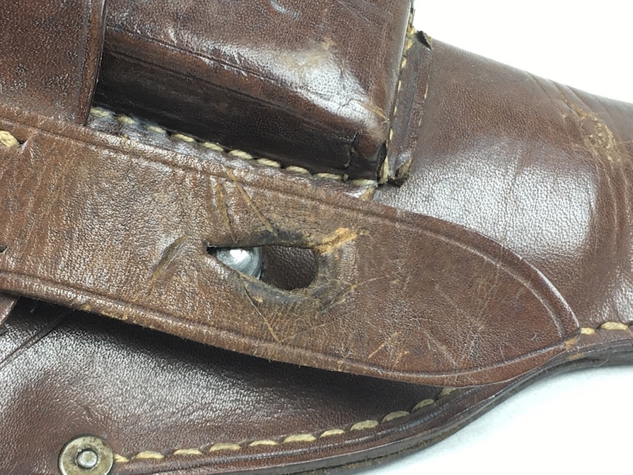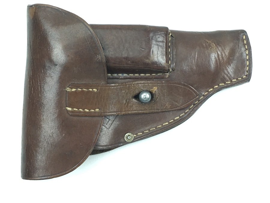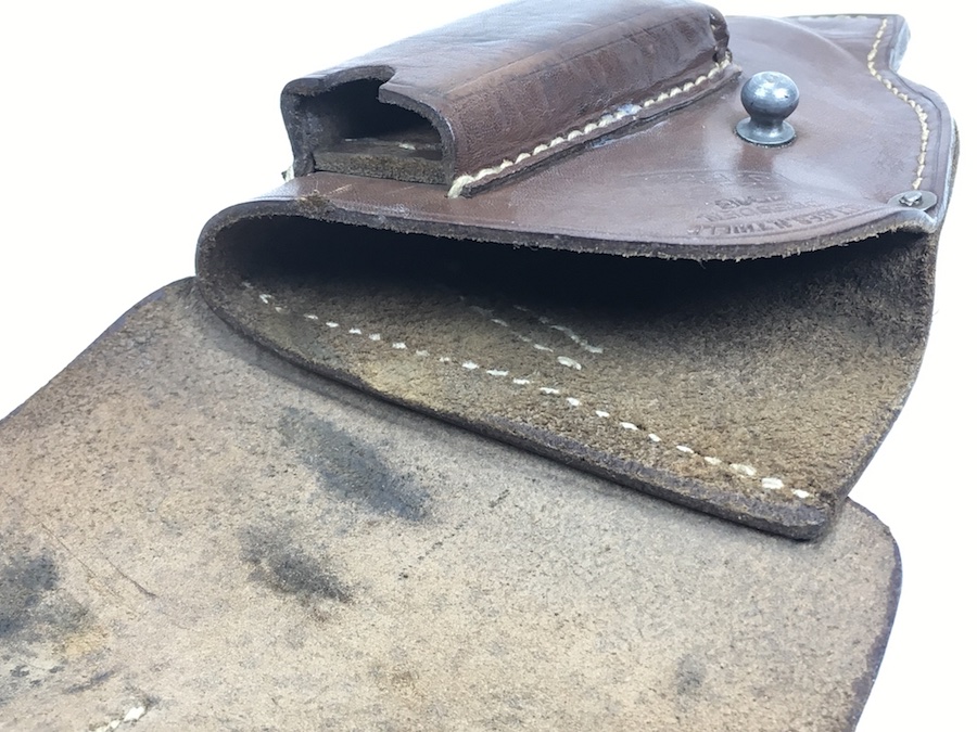 6/21/19 – Excellent and original condition from WWI. Beautiful brown leather with strong, intact stitching. Rare maker logo stamped under closure flap. “Act. Get. H. Thiele, Dresden 1918”. Very hard to find these “L.Z. St., ” stamped holsters. This make stamp is mostly found on WWI Luger or Reichsrevolver holsters. Very rarely seen on .32 cal or .25 caliber holsters. Typically used for a Walther Model 4, Sauer Model 13, Mauser model 1914, Beholla or Menta pistols.