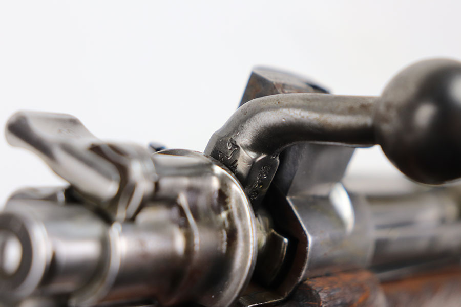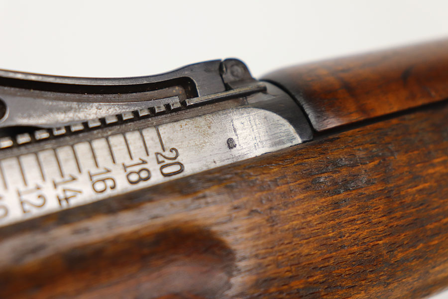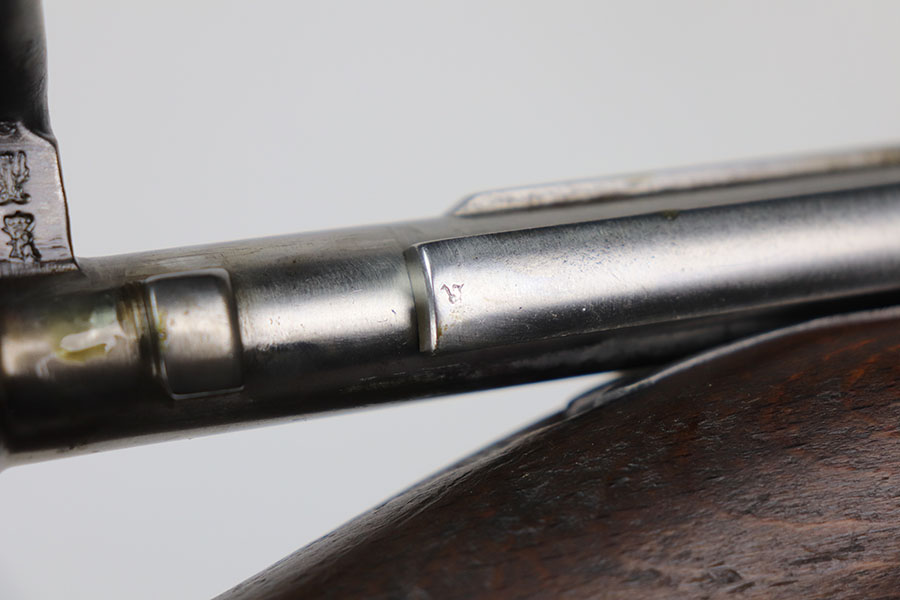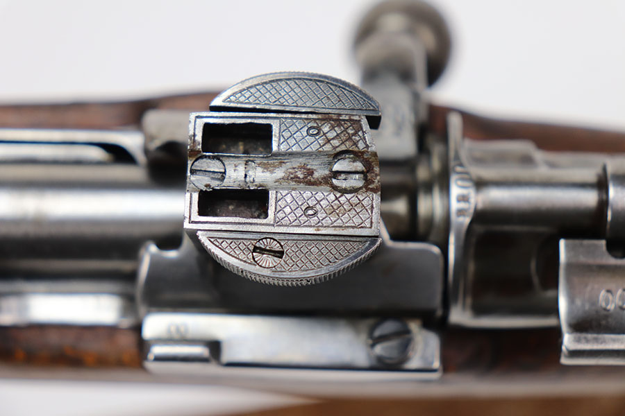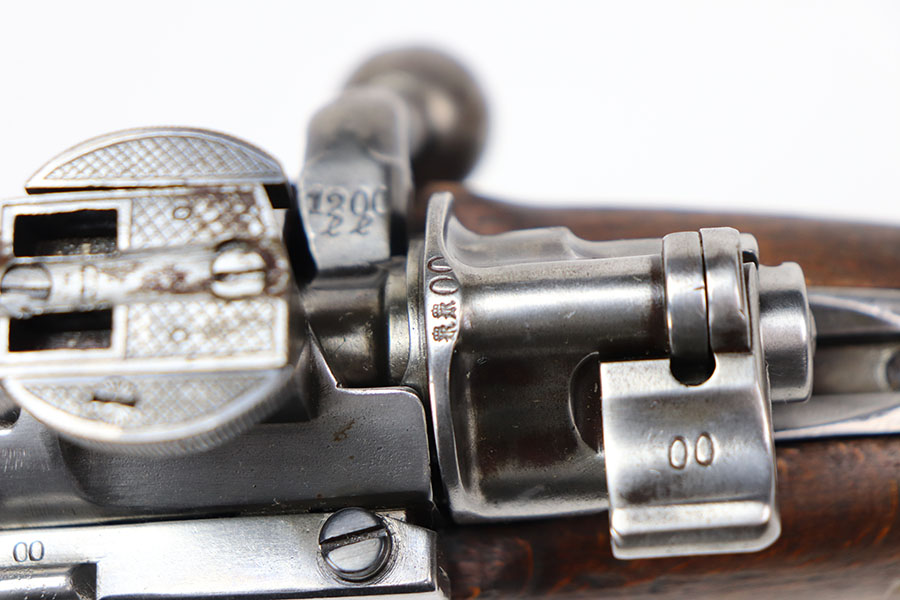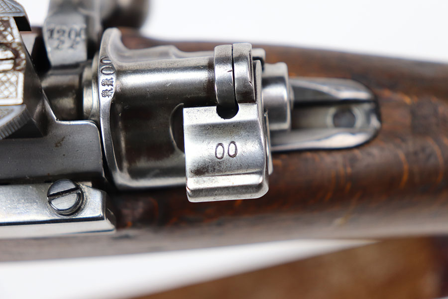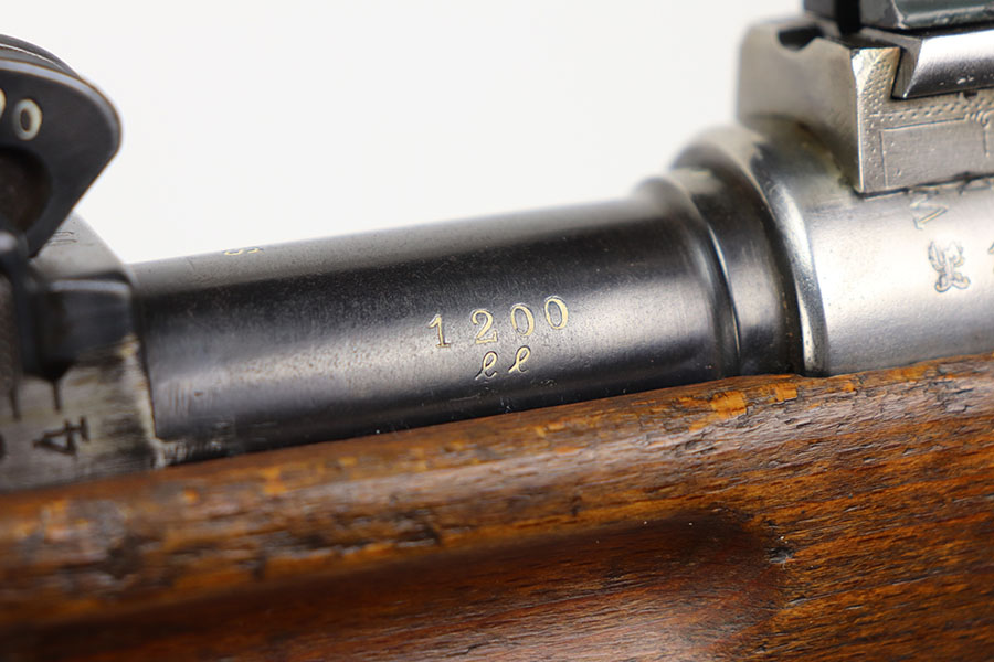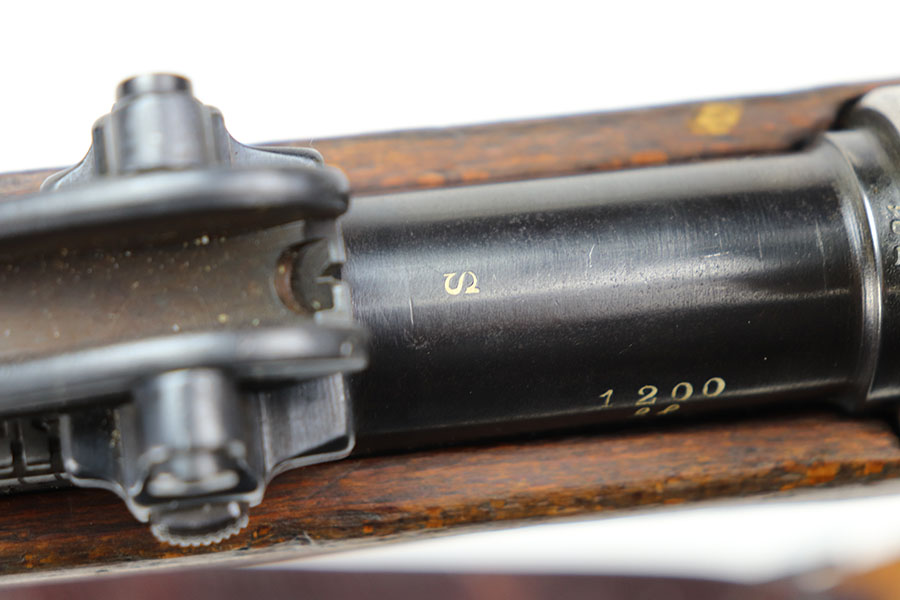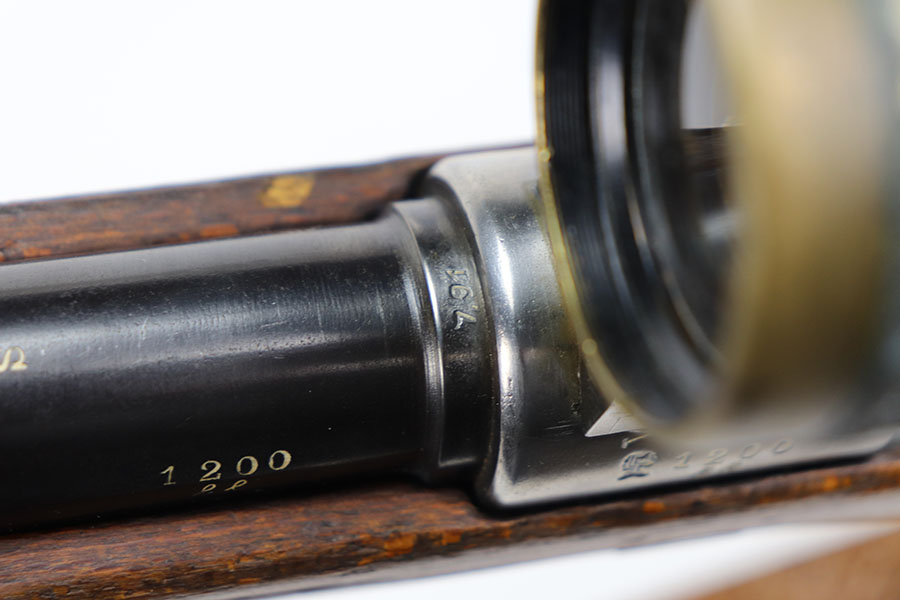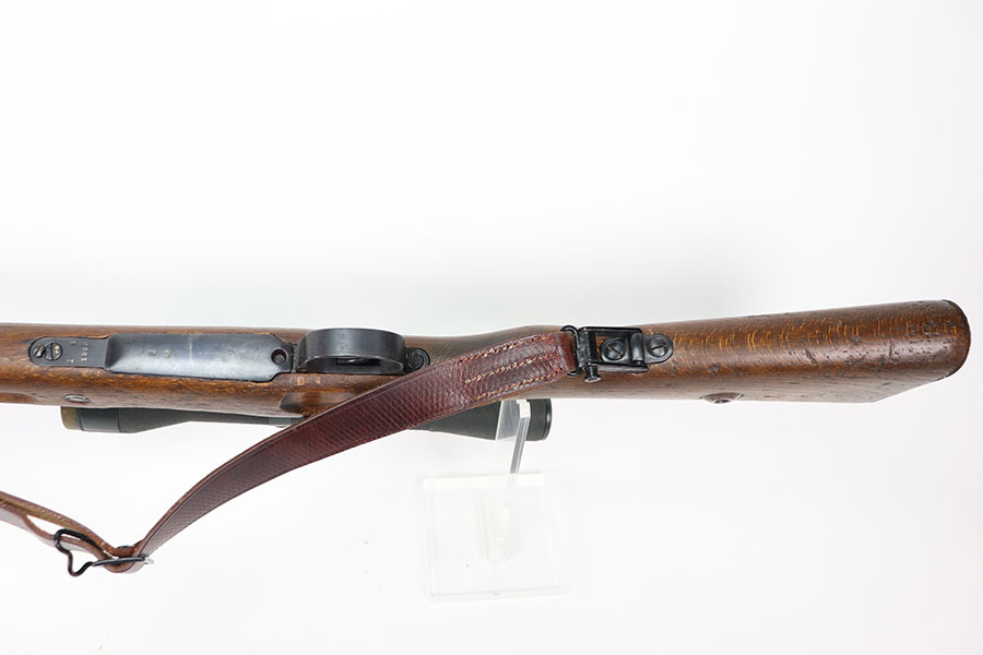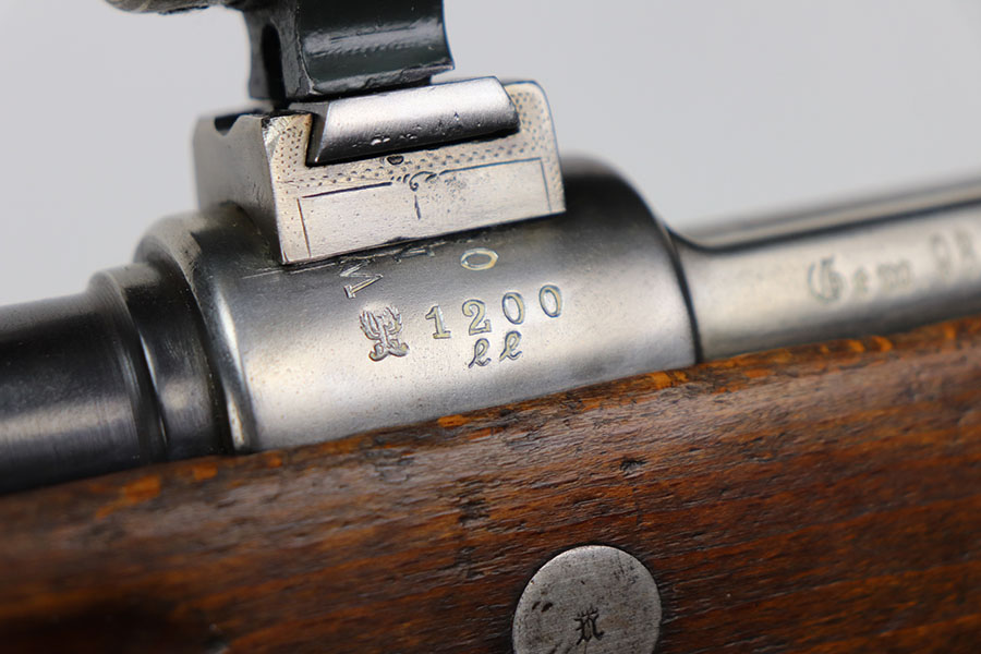 3/23/23 – This is a rare and super cool Gewehr 98 sniper rifle that was made during WWI at the Waffenfabrik Mauser A-G Oberndorf factory. It’s a terrific example of a WWI German Gewehr rifle that was converted into a sniper rifle. These WWI rifles all started out as standard service rifles and were modified/converted to sniper configuration by the addition of a set of double claw scope bases and scope. The primary difference of these WWI GEW snipers is the scope manufacturer and type of scope bases used; either the scope bases/claws were both mounted directly on top of the receiver or the rear base/set were off-set to the left side of the rear receiver, as in this case. The top of the receiver is covered by the front scope base, so we can’t identify the year of manufacture but can make out enough to identify the “Waffenfabrik Mauser A-G Oberndorf” marking. The rifle is all matching and original, serialized down to the mounts, adjustable sight, buttplate, etc. Receiver correctly in the white as this part was never blued. The stock has some dings and nicks but sharp Imperial proofs remain. Scarce Helios 5A scope with nice, clear optics. It’s also marked ‘Scharfstelling’ on the opposite side. We believe the only after market piece is the sling, which is certainly aged but we don’t believe is WWI original. Bore has strong rifling but some frost throughout.