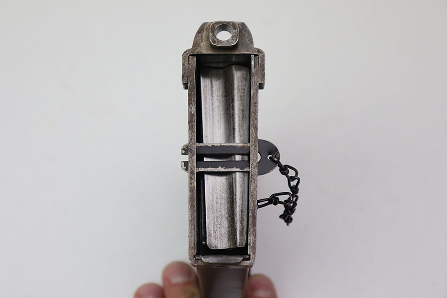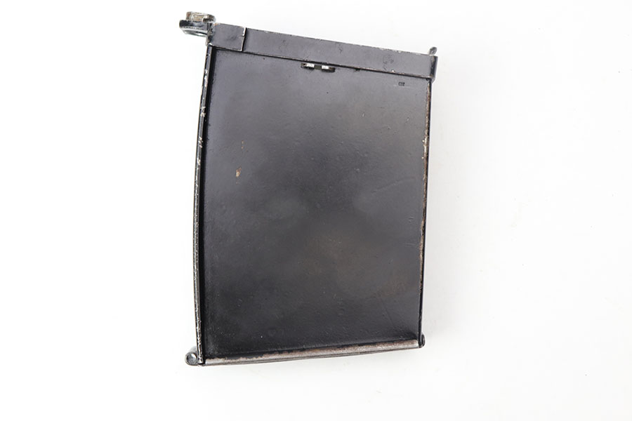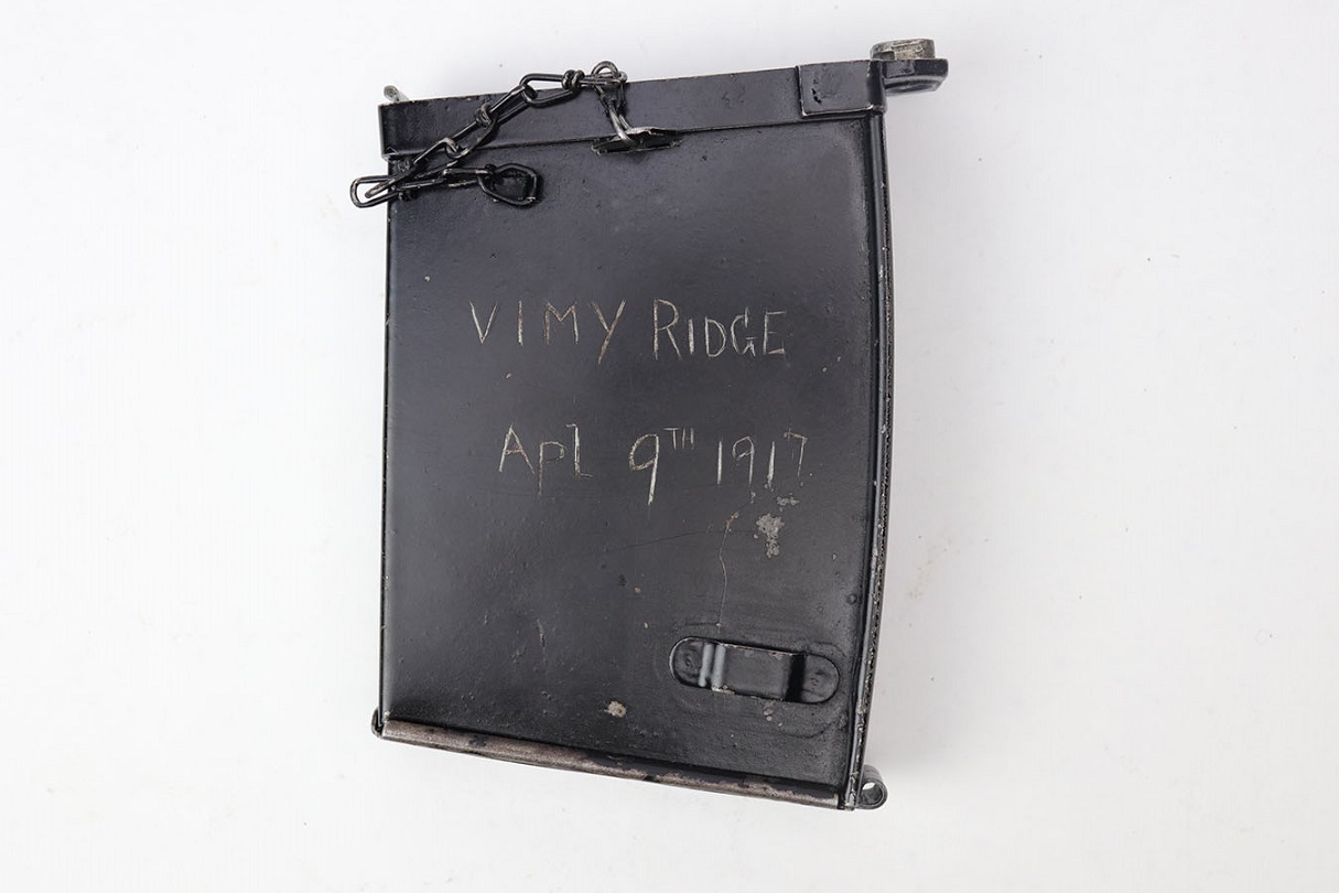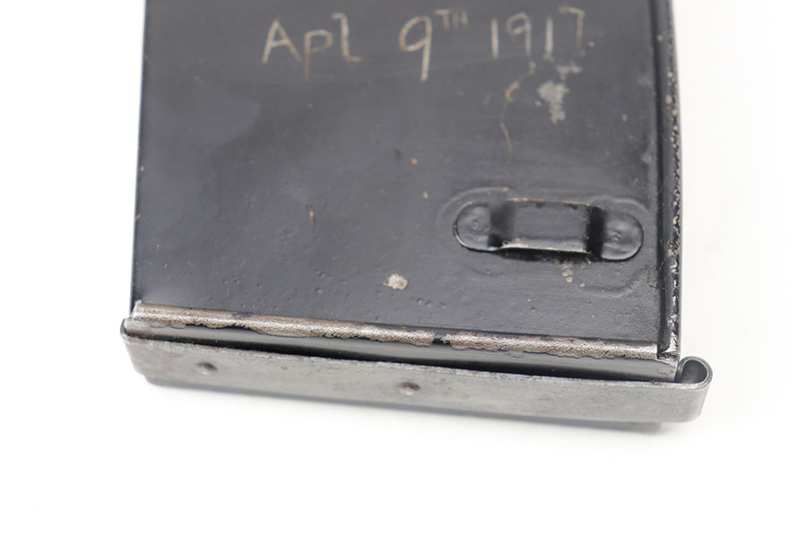 8/14/20 – This is an extremely rare, original Gewehr 98 rifle magazine attachment from WW1. This 25 round fixed magazine allowed shooters involved in trench warfare the ability to fire much more before needing to reload. This magazine has a hand-scratched dedication to the battle on Vimy Ridge, and is dated April 9th, 1917. The exterior black painted finish is excellent with minimal finish loss. Most of the loss is on the underside / base of the magazine. The original chain is complete and in tact as well. The spring is strong and fully functional.