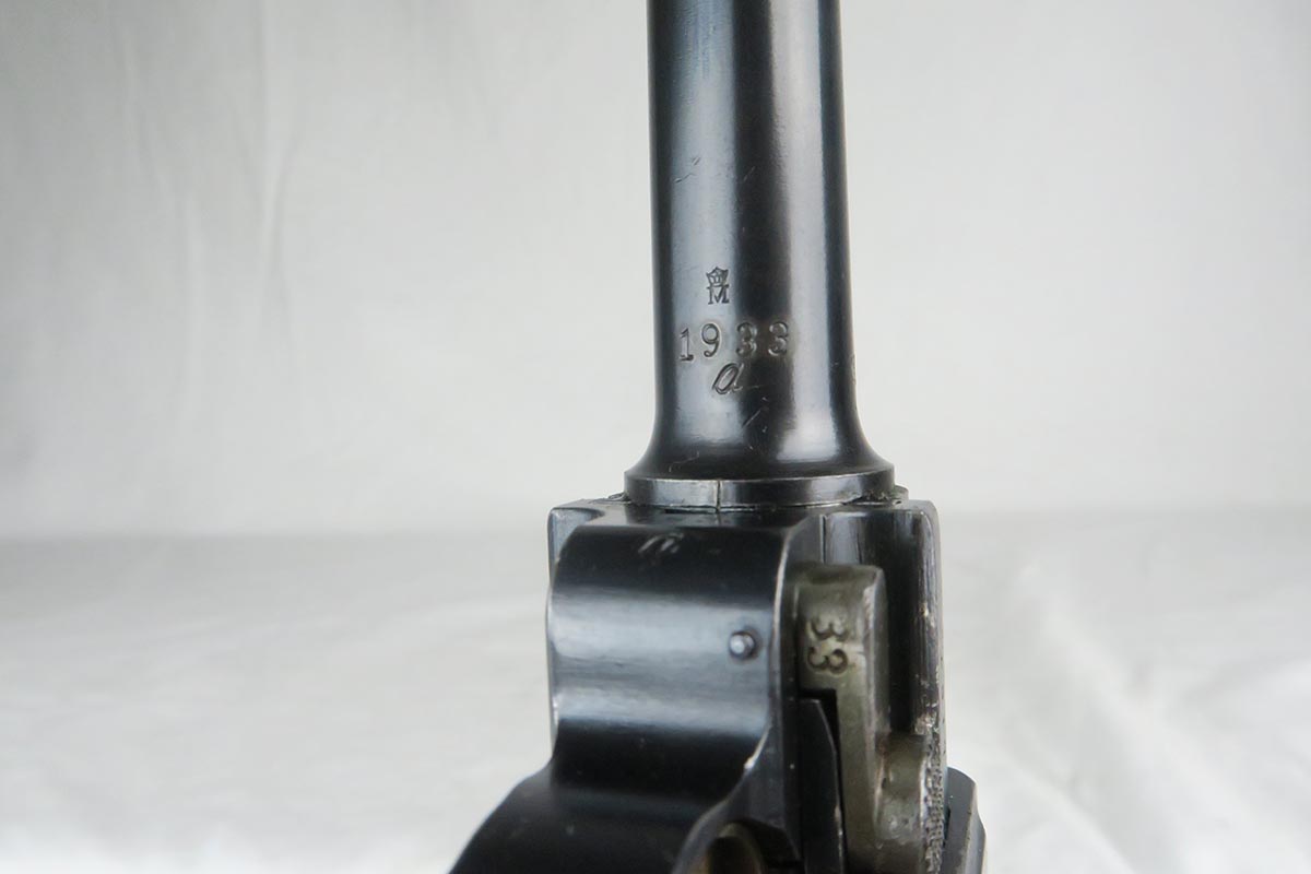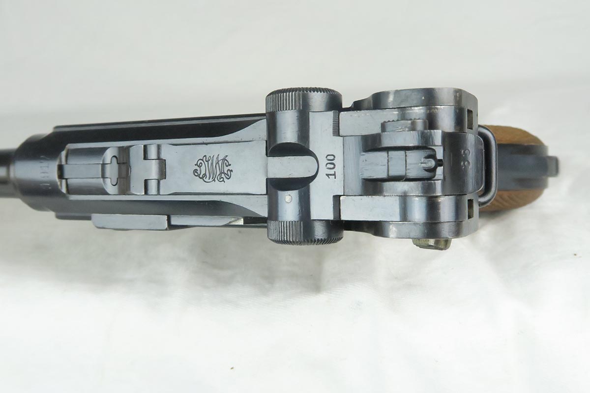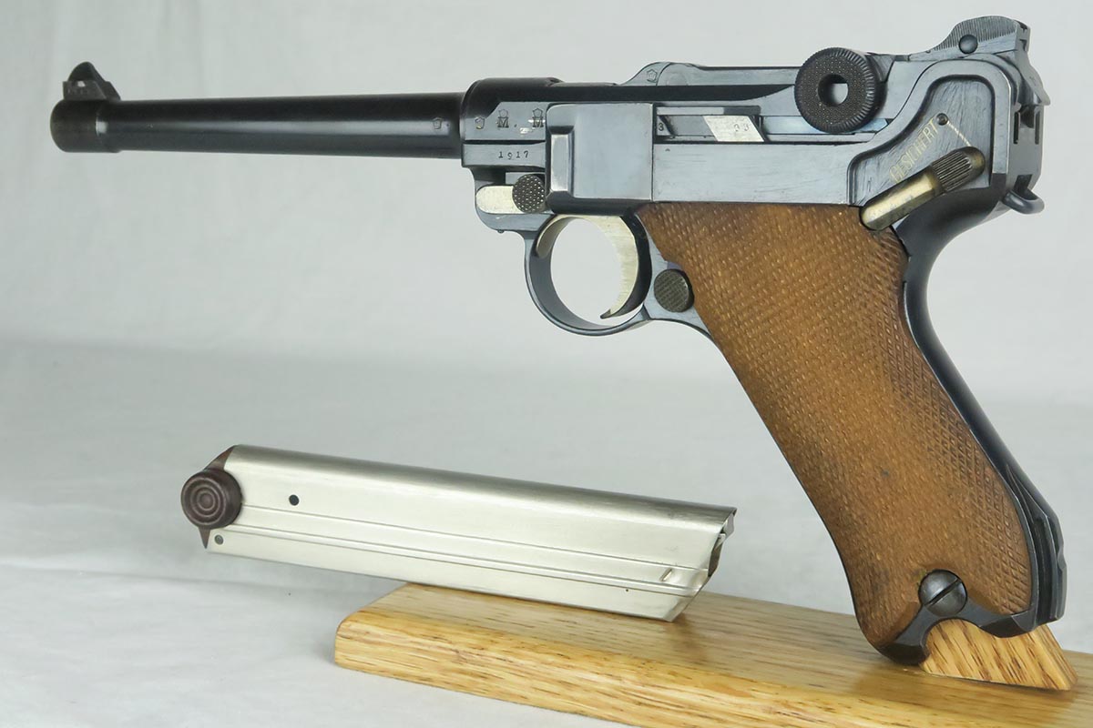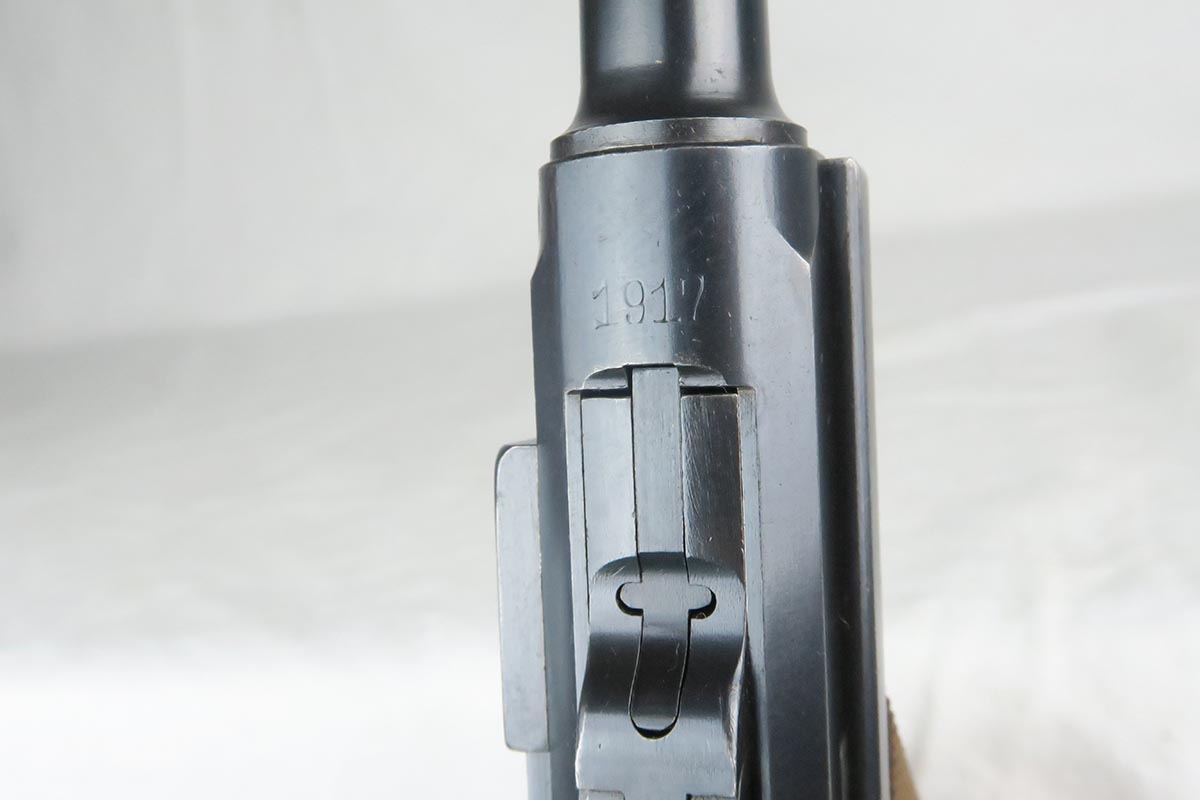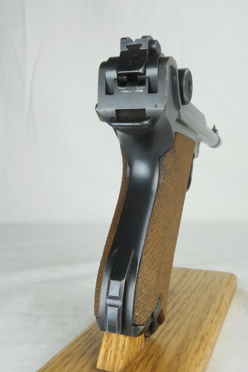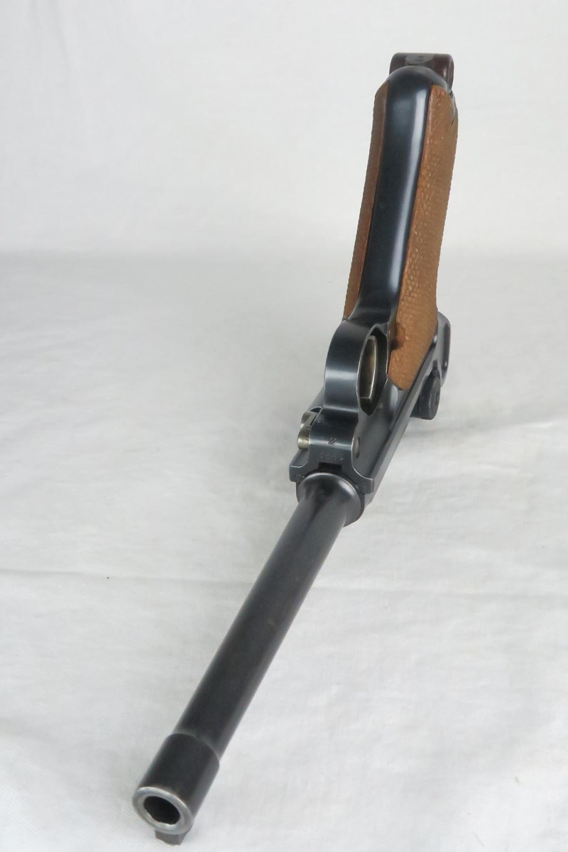 12/19/17 – This is a gorgeous WW1 era Navy luger, and would be extremely difficult to upgrade.  All matching serial numbers including the grips but not the magazine.  The magazine, however, is an original Navy magazine and would be appropriate for this pistol.   Original finish is about 98% with just a bit of wear on the sideplate hump and bottom of the front strap.  The serial under barrel has halos, indicating original finish.  The bore is shiny and strong.  This gun was not used or fired much at all.  Checkering on the grips are sharp and the grips are numbered to the gun.  Guaranteed to be all original and authentic.