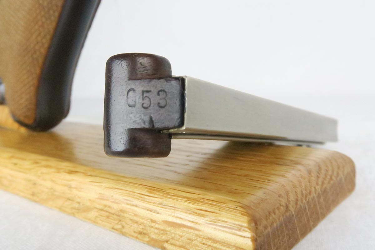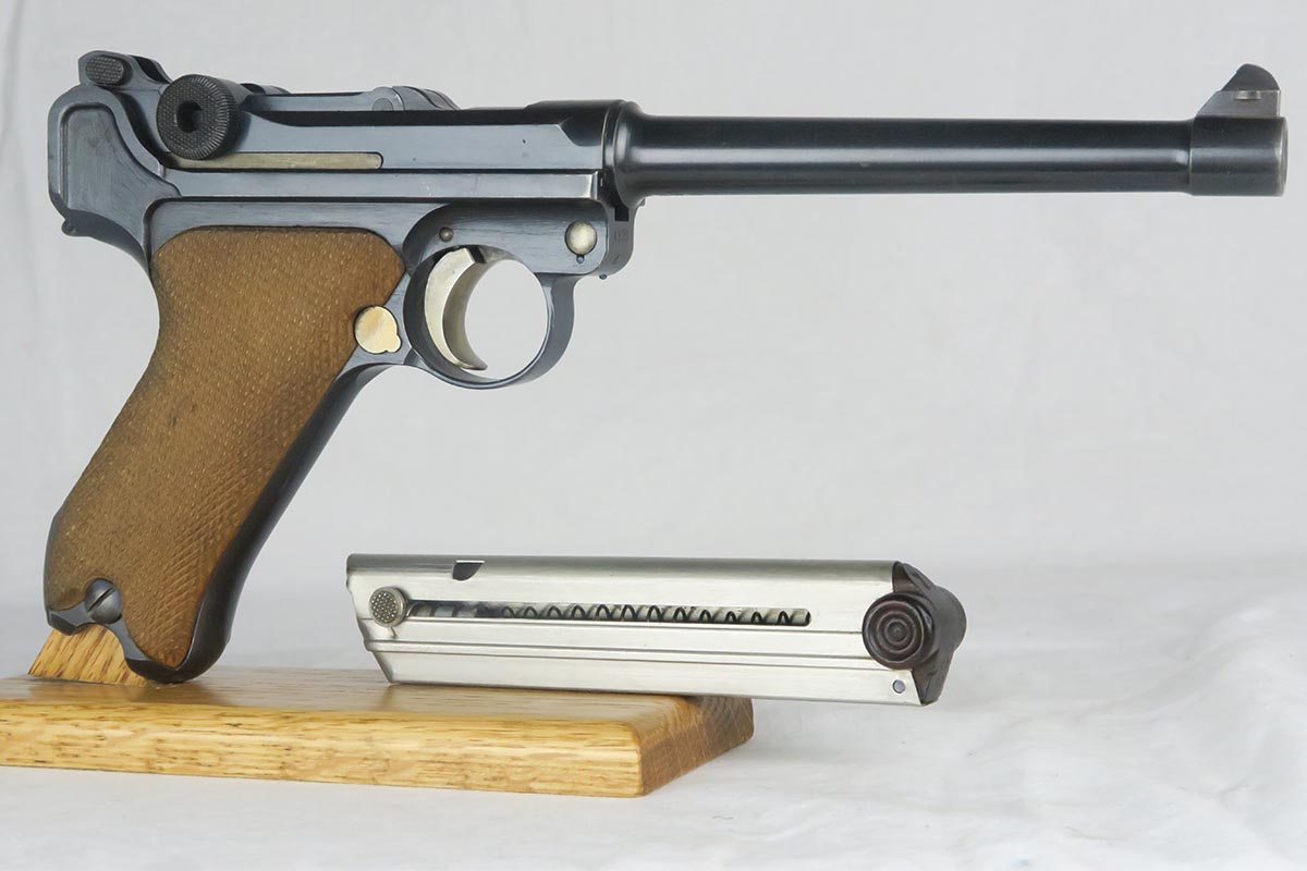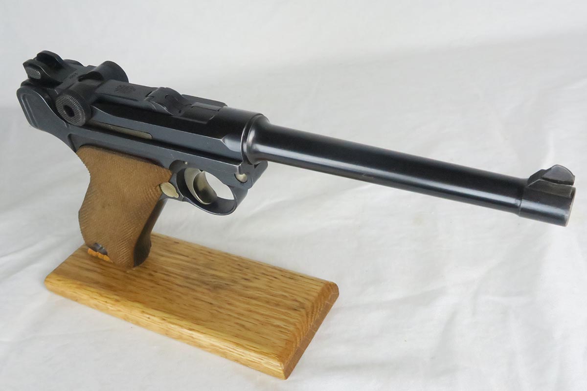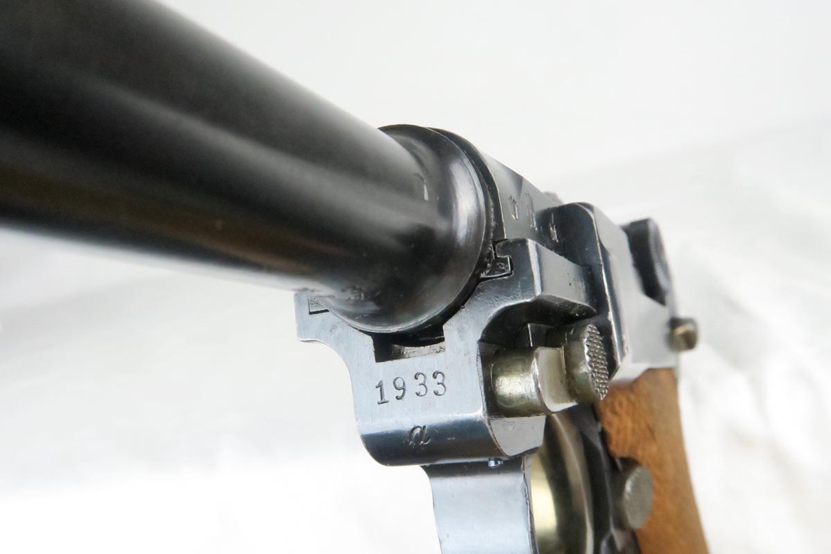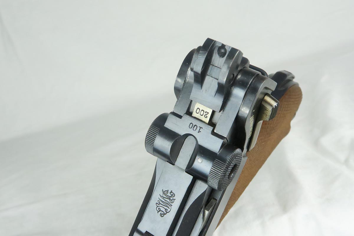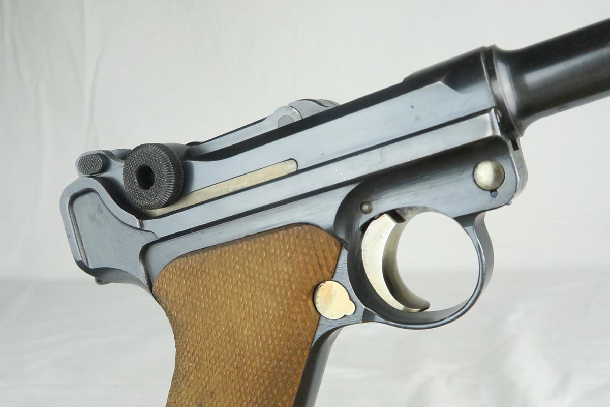 12/19/17 – This is a gorgeous WW1 era Navy luger, and would be extremely difficult to upgrade.  All matching serial numbers including the grips but not the magazine.  The magazine, however, is an original Navy magazine and would be appropriate for this pistol.   Original finish is about 98% with just a bit of wear on the sideplate hump and bottom of the front strap.  The serial under barrel has halos, indicating original finish.  The bore is shiny and strong.  This gun was not used or fired much at all.  Checkering on the grips are sharp and the grips are numbered to the gun.  Guaranteed to be all original and authentic.