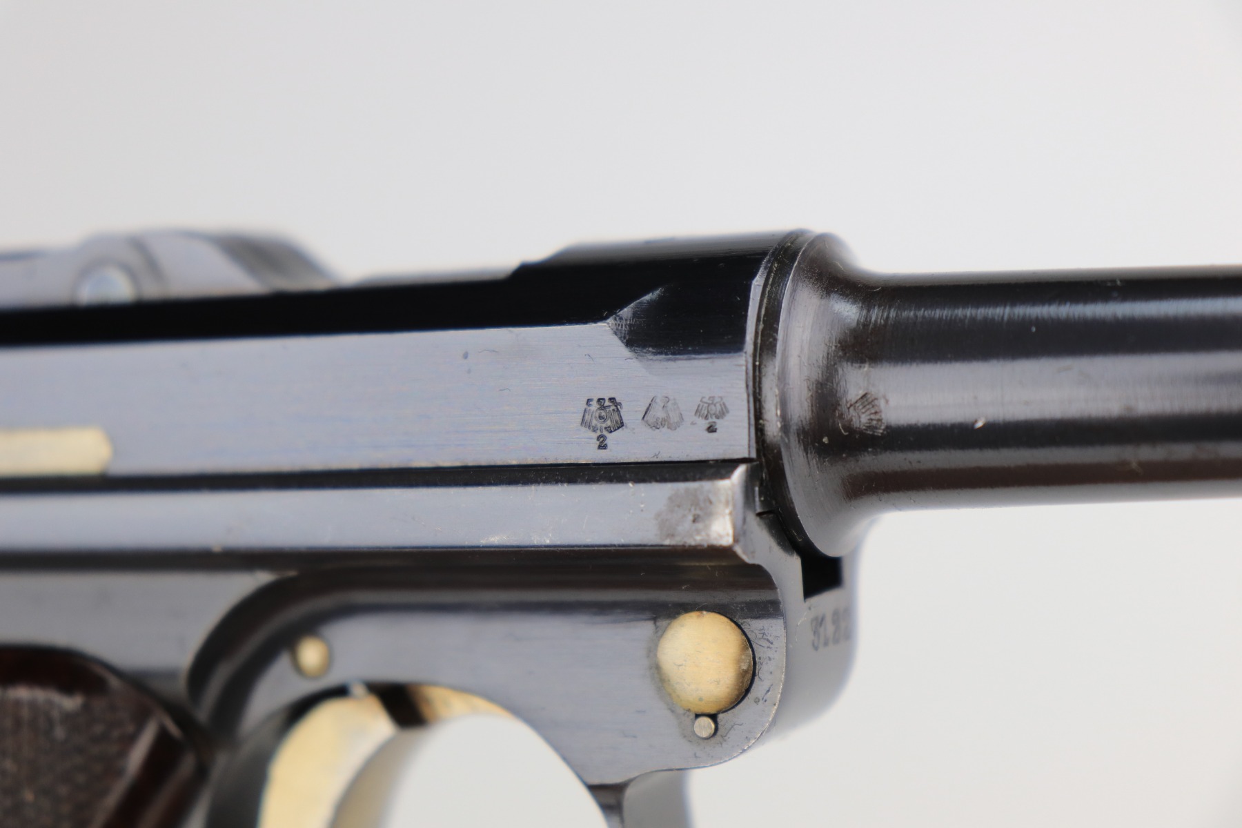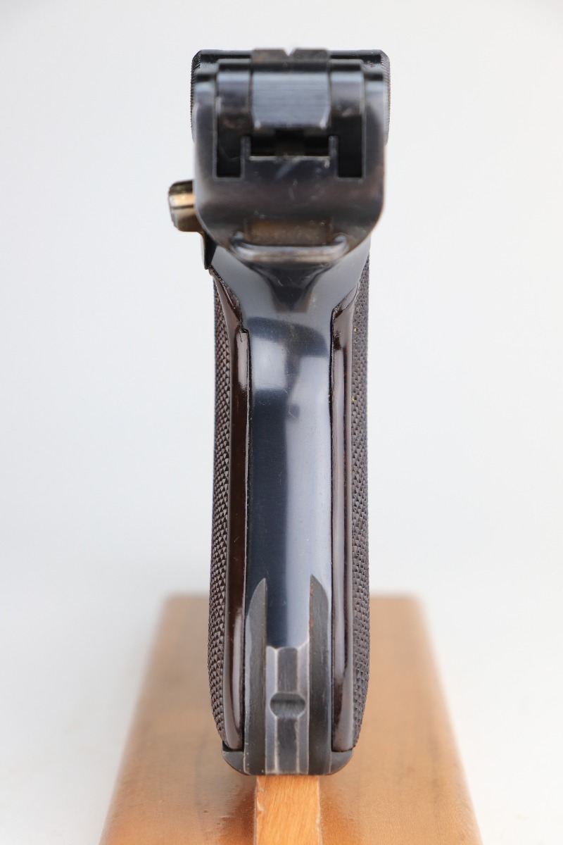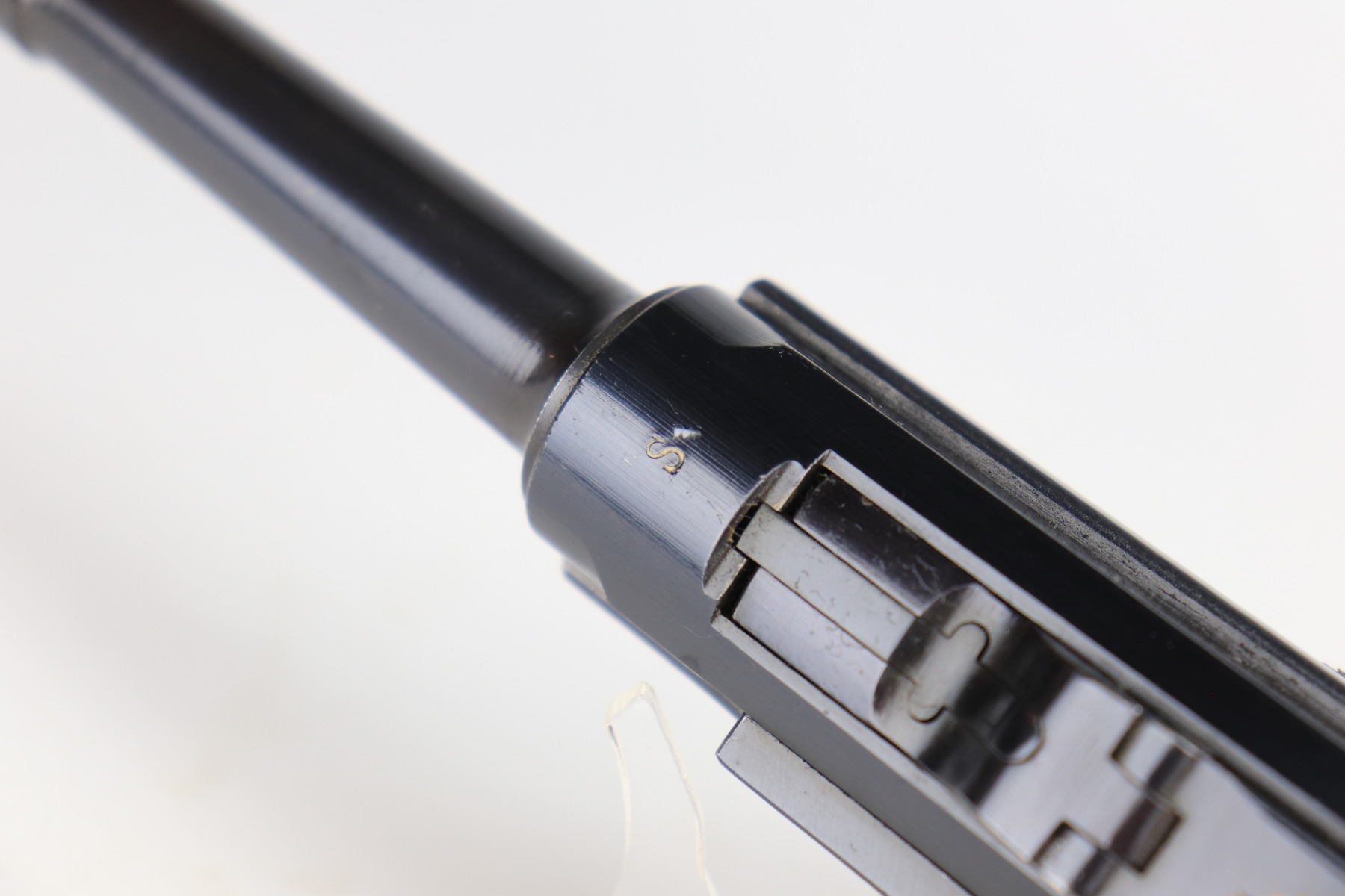1/11/21 – This is a minty example of a rare S-Code Krieghoff Luger issued to the Luftwaffe in 1936. There were only about 3,600 of this variation produced. This one is matching and has the proper “Eagle L 2” proofs. It has retained about 99% of its original bluing. There is just a hint of wear on the high edges and a few extremely light handling marks here and there. One tiny area of very light freckling on the right side of the slide. It comes with gorgeous Krieghoff bakelite grips and a mismatched Krieghoff magazine. The bore is excellent – shiny with strong rifling.