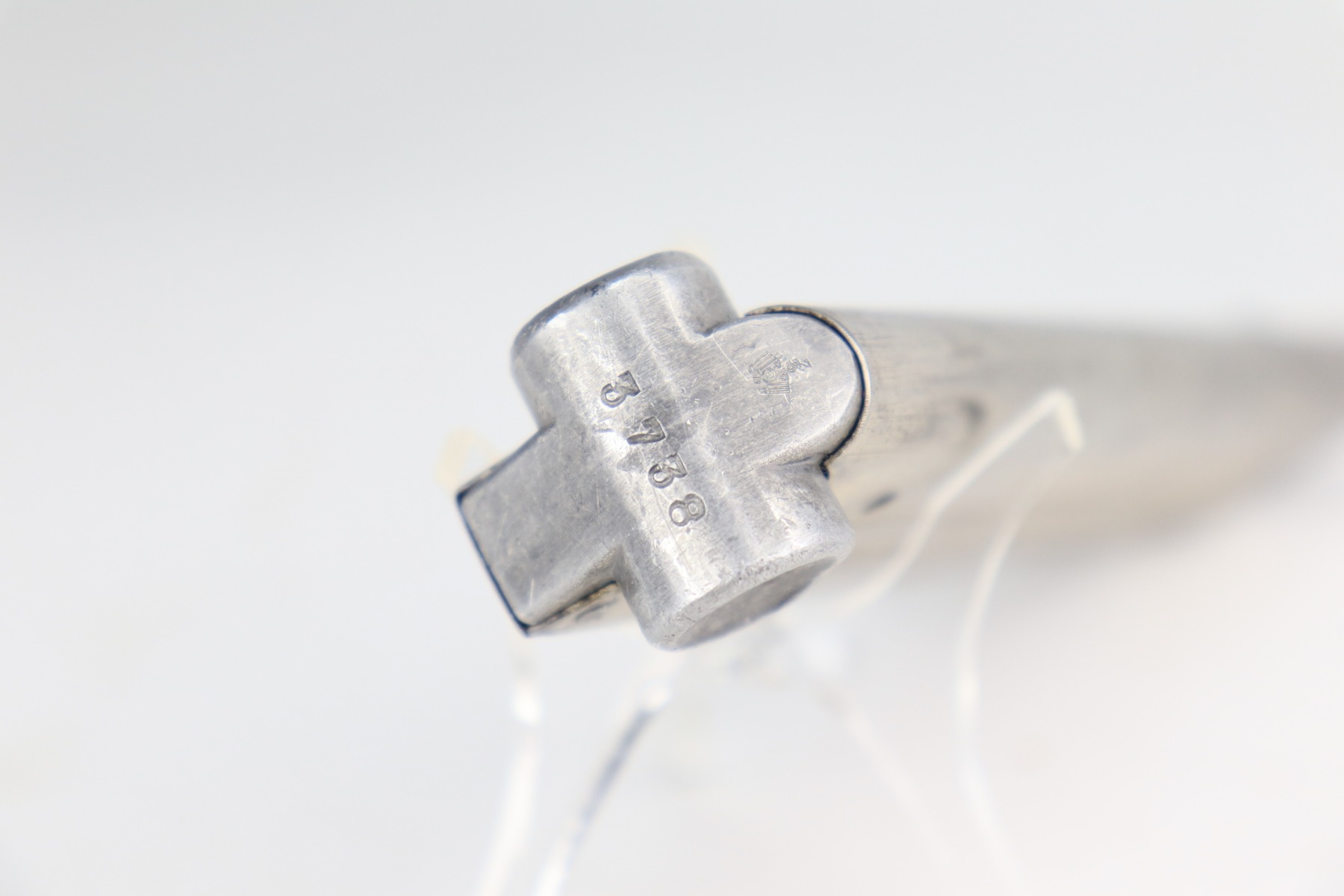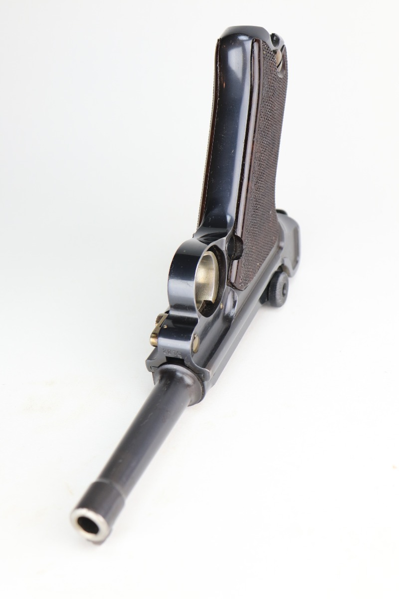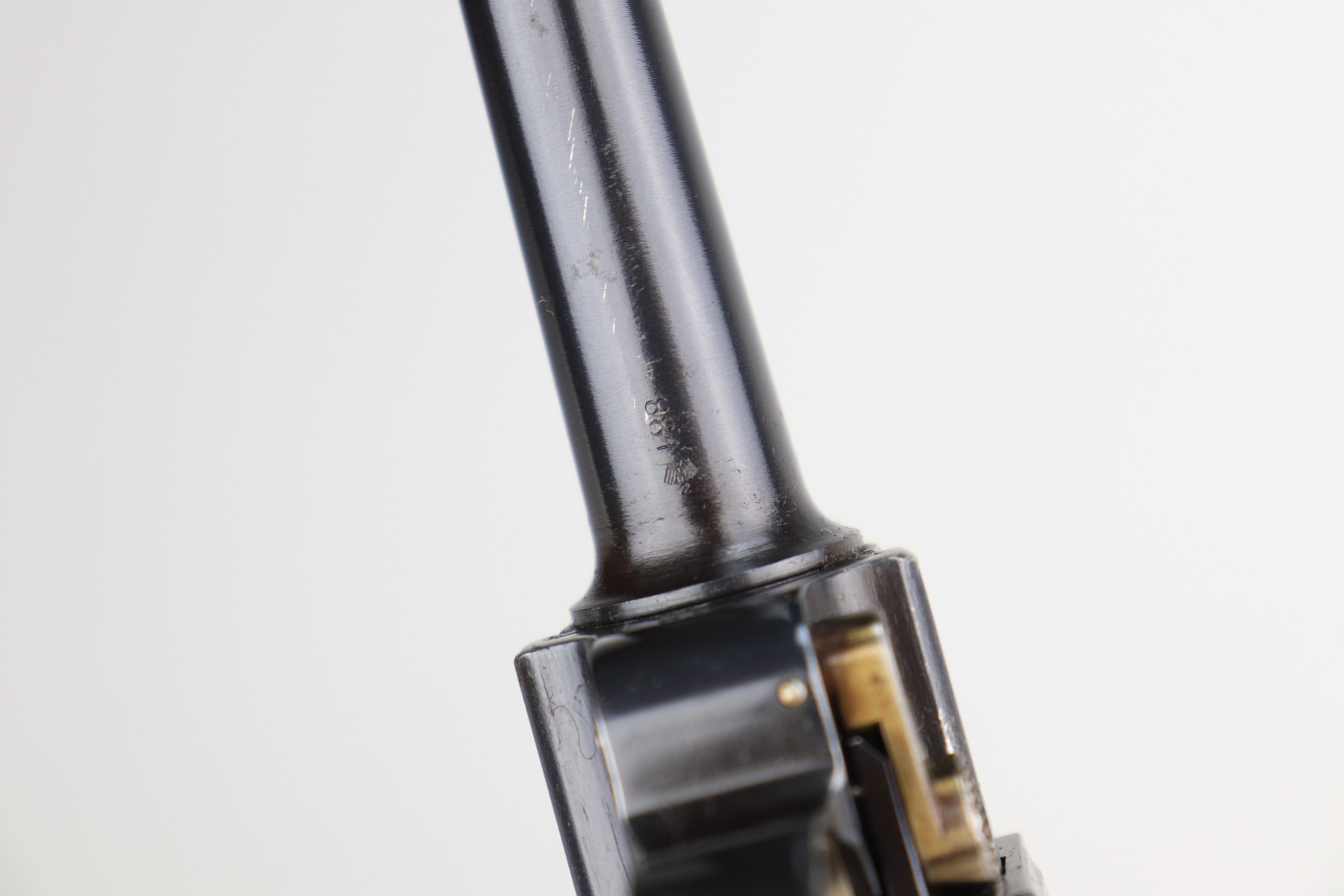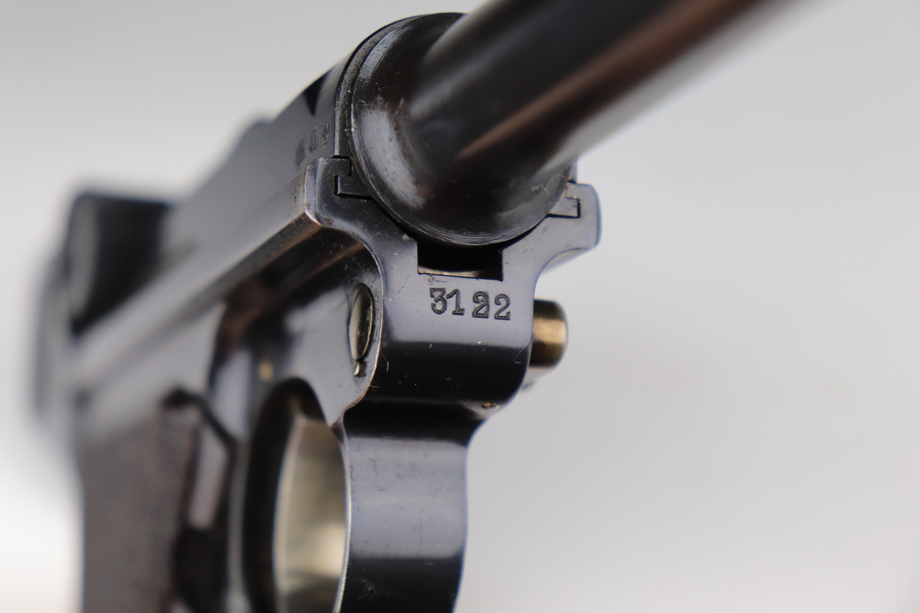 1/11/21 – This is a minty example of a rare S-Code Krieghoff Luger issued to the Luftwaffe in 1936. There were only about 3,600 of this variation produced. This one is matching and has the proper “Eagle L 2” proofs. It has retained about 99% of its original bluing. There is just a hint of wear on the high edges and a few extremely light handling marks here and there. One tiny area of very light freckling on the right side of the slide. It comes with gorgeous Krieghoff bakelite grips and a mismatched Krieghoff magazine. The bore is excellent – shiny with strong rifling.