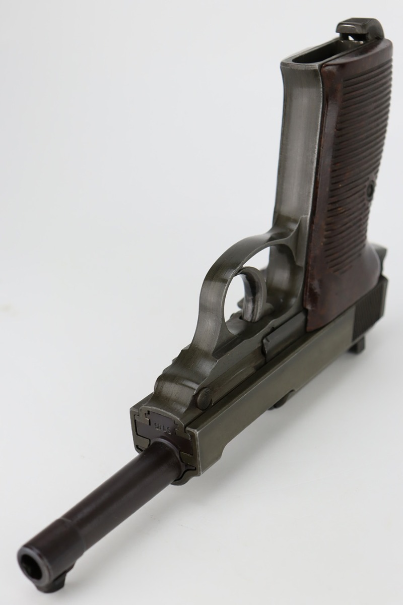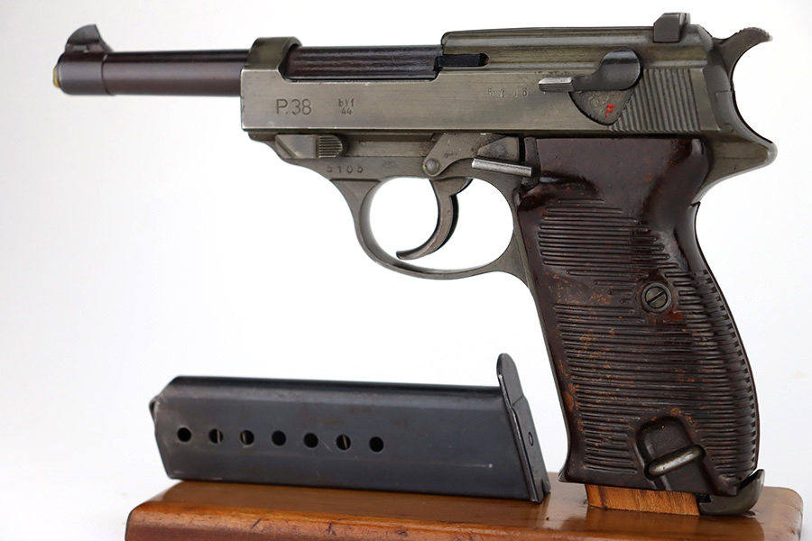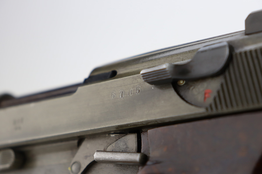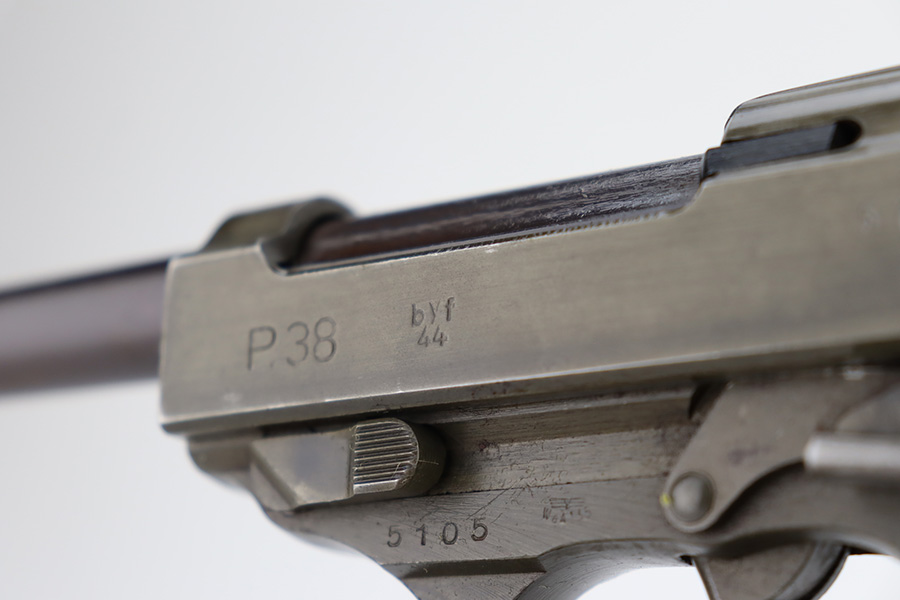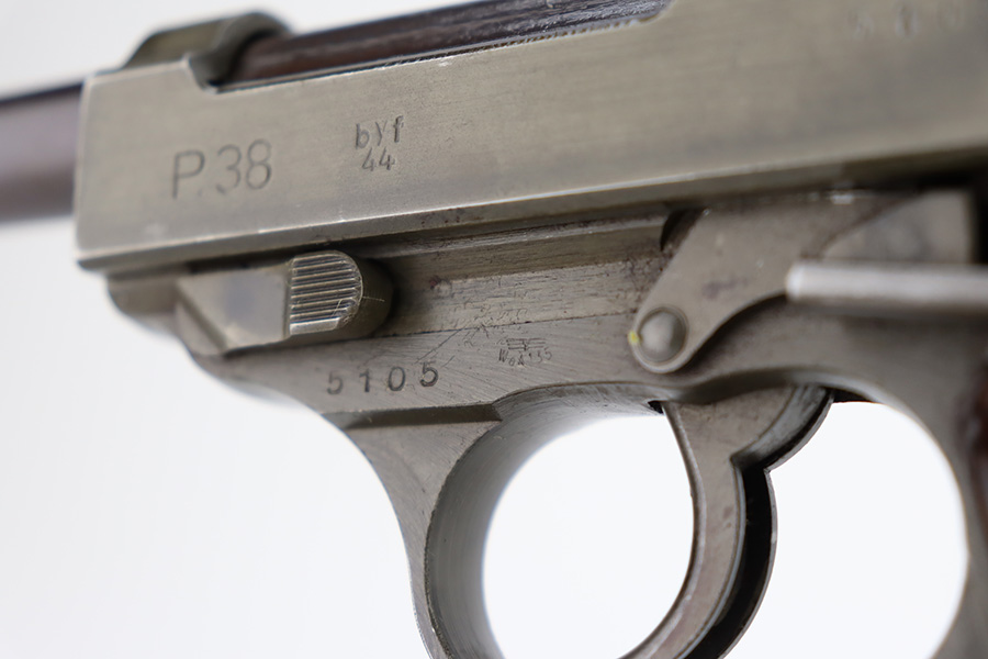 12/11/23 – This is an absolutely gorgeous example of a rare Nazi Police Mauser P.38 with Eagle/F inspector mark. It’s one of only 1,500 such examples produced, and is just absolutely exceptional. It’s all matching and shows essentially no signs of wear. Fitted with excellent reddish bakelite grips and comes with one period-correct jvd magazine. The bore is stone-mint. De-cocker is functional.