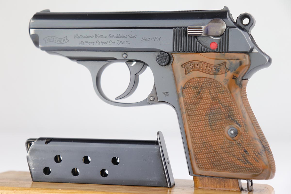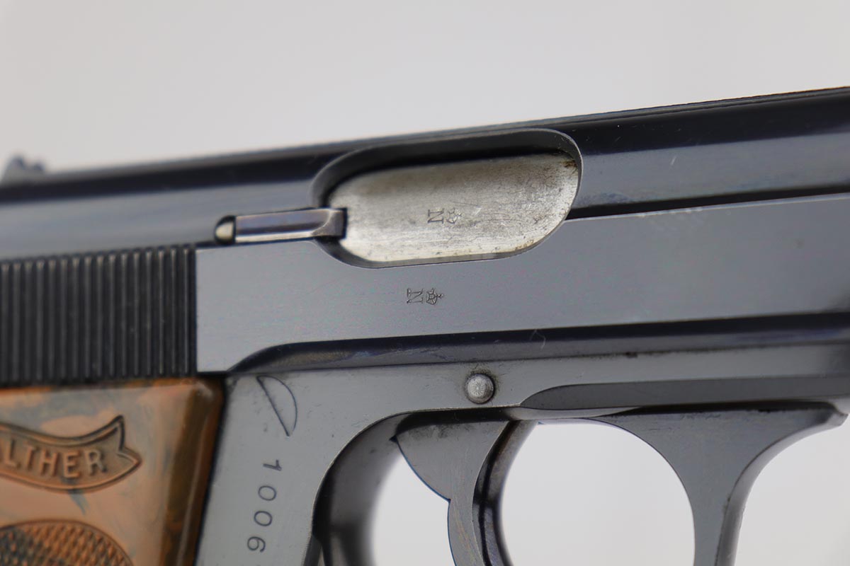 4/19/19 – This is an excellent and hard to find Police Walther PPK, one of the earliest made! The million serial places this pistol in 1938, when PPKs first began being issued to the German Police. These early pistols, of which there were an estimated 5,500 issued, feature Crown/N proofs and a high-polish finish. This particular pistol has about 98% of its original bluing, due to some muzzle wear on both sides of the slide. The grip and magazine are both in excellent condition with no issues to mention, and the bore is mint.