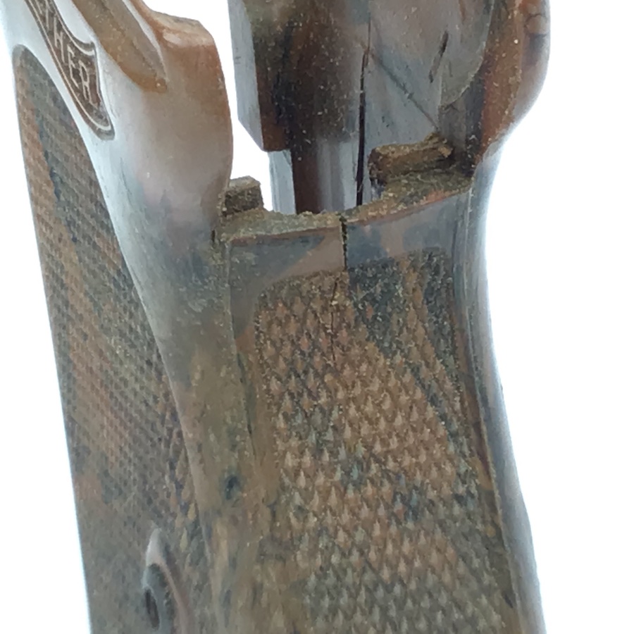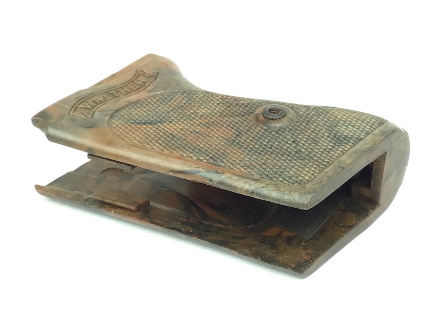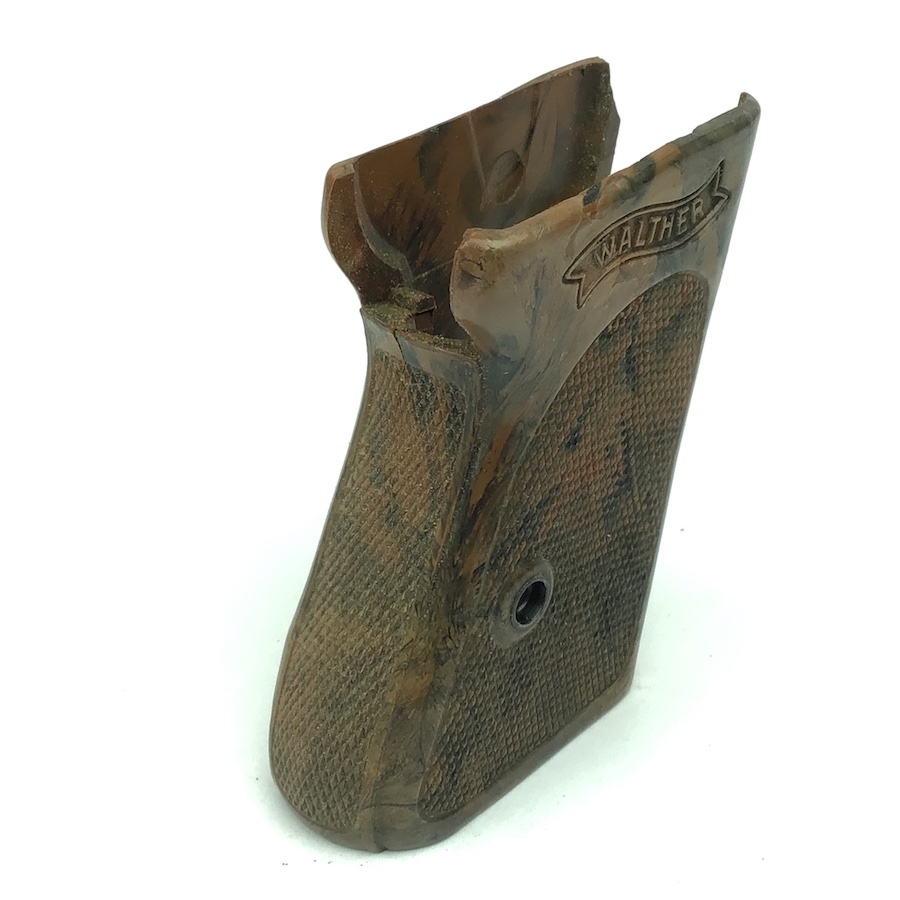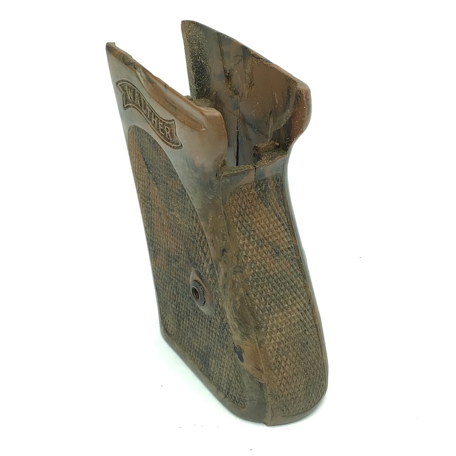 9/21/21 – This is an original, rare variation Gray colored bakelite PPK grip. The grip is excellent except for a minor crack at the top of the spine. No screw included.
