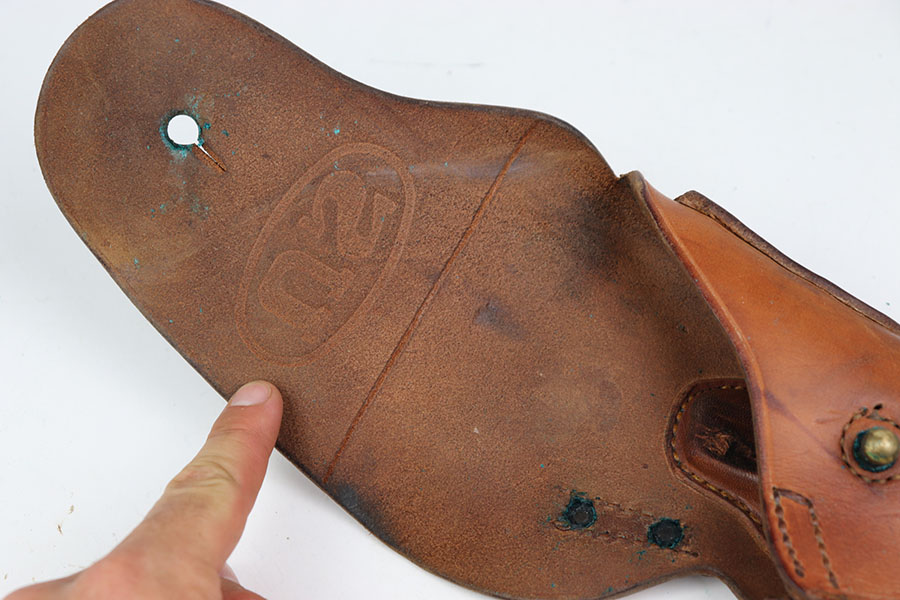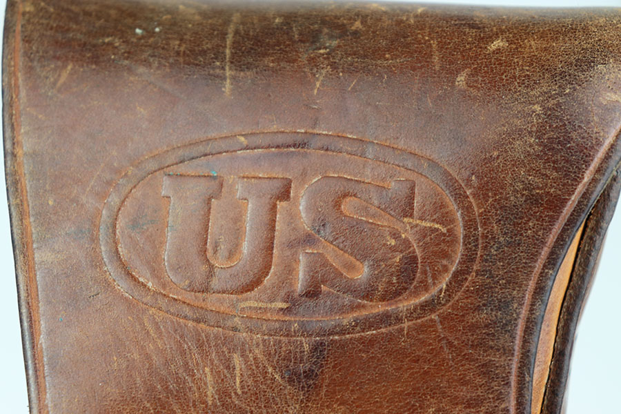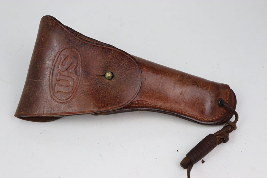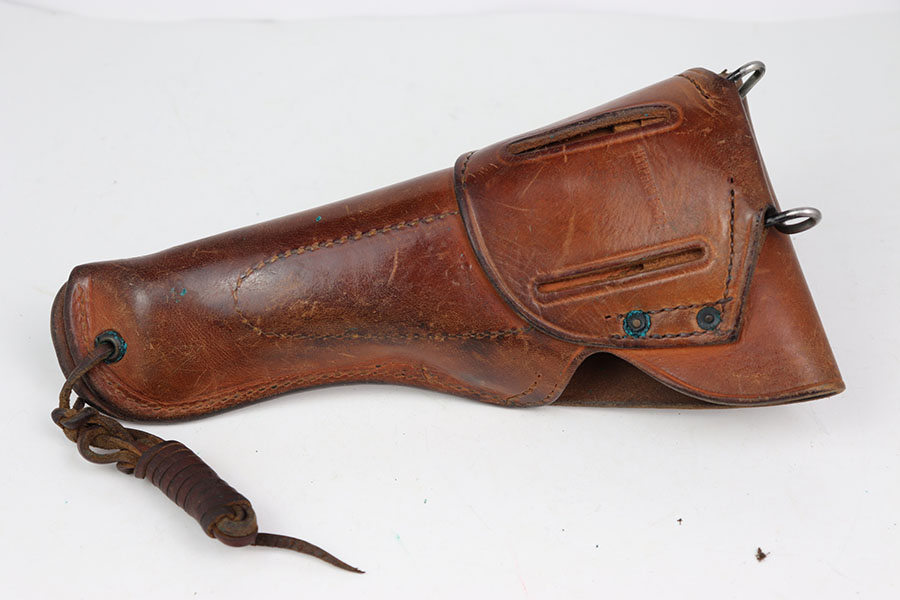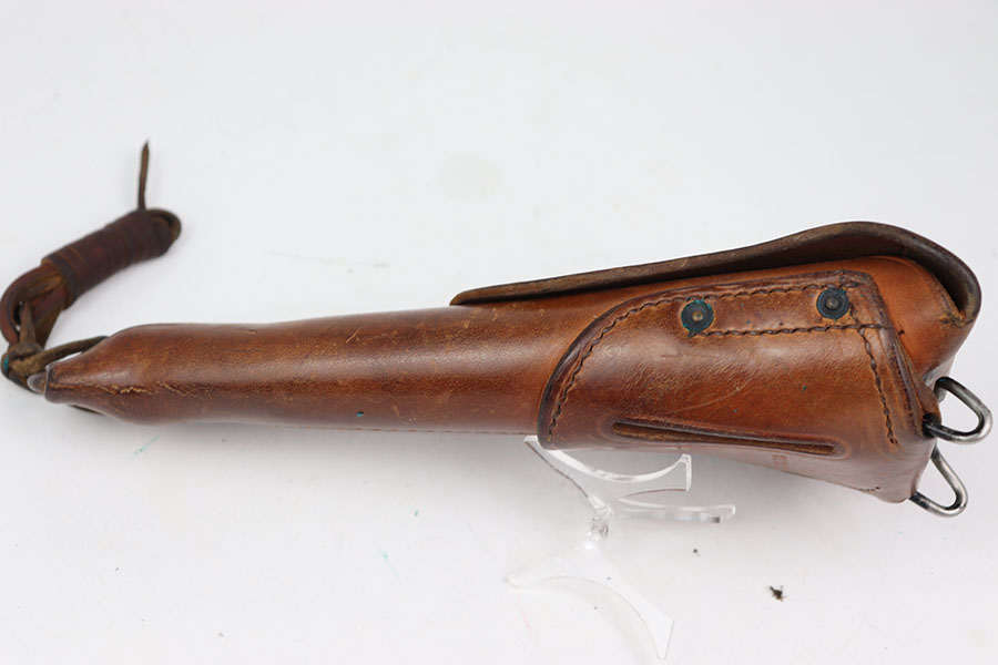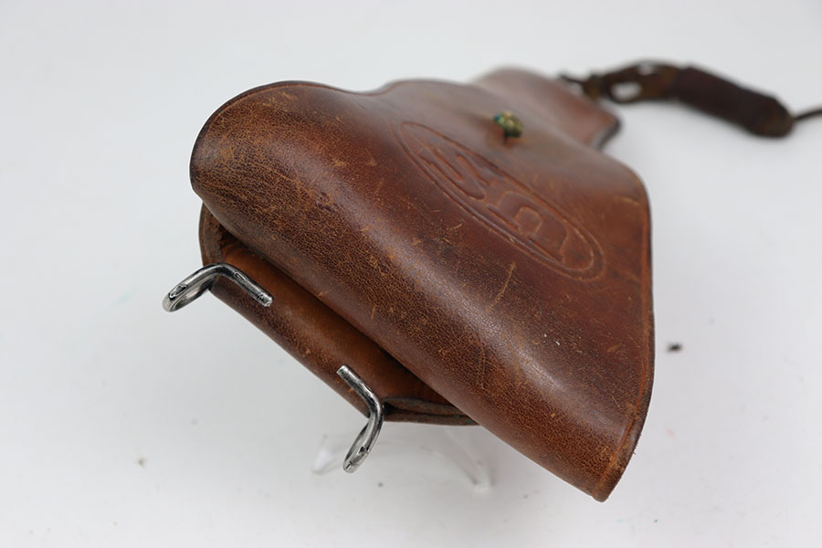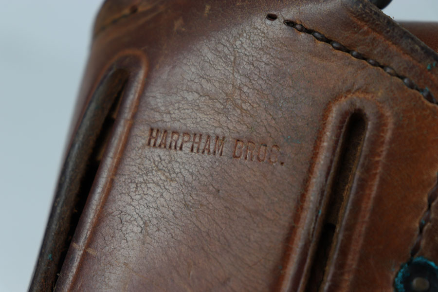 6/26/24 – This is an original M1916 holster made by Harpham Bros. This maker is a scarce WW2 producer of the M1916 holster for the M1911 pistol. The holster is in great condition with some mild surface wrinkling on the front and top leather. There’s some very mild scuffs and wrinkling on the back leather as well but overall the leather is in great shape with minimal pliability. Clean interior leather. No notable stitching flaws. Maker stamped on the back leather and US stamped on the front. Comes with original leather lanyard.