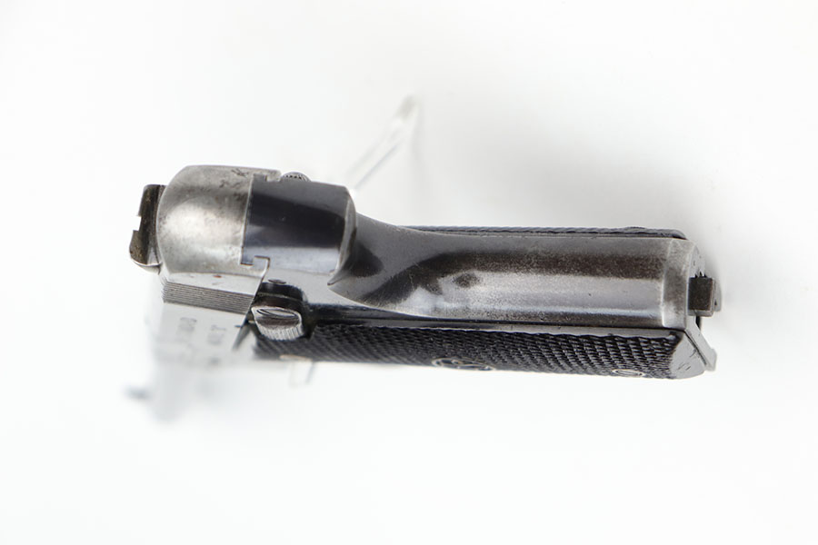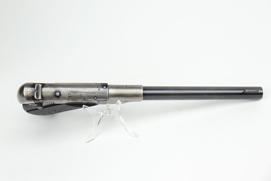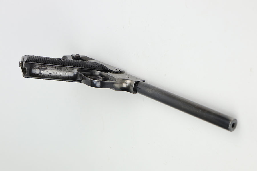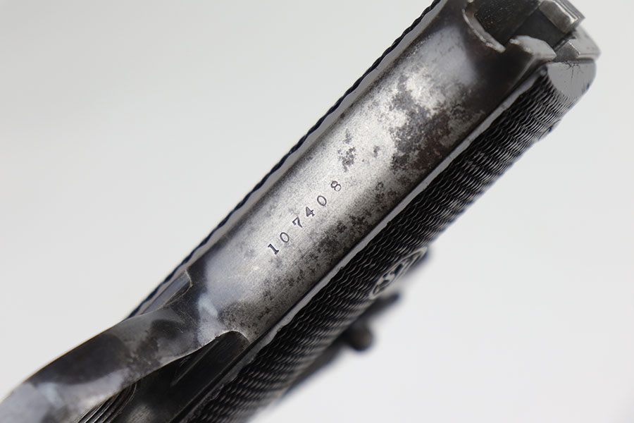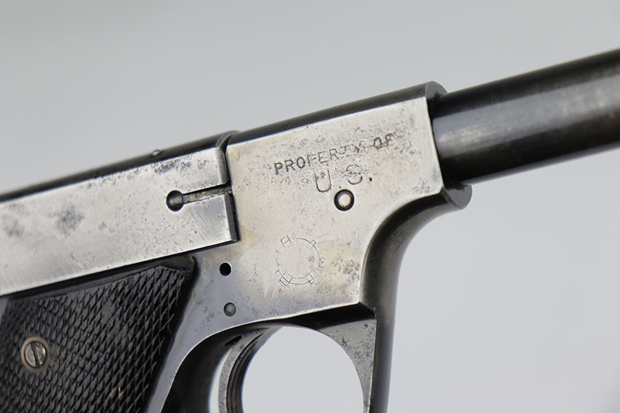 10/12/20 – This is a very rare and interesting Hi-Standard Model “B” that is marked with crossed cannons cartouche and ‘PROPERTY OF U.S.’ on the right side of the frame. In 1942, the War Department purchased many Model B’s for training purposes with all the new recruits. At the request of the military, the Model B was modified to become the Model B-US and barrels were cut to 4.5 inches to conserve steel, while the frame was modified to more closely resemble the 1911 Colt in the hand. This particular Model B appears to have come from the original, early 1942 shipment and has the uncut (5.25 inch) barrel. This is the first such example we’ve encountered, and is seemingly a pretty rare find. The gun itself is all original but clearly worn finish on most of the metal, and a few areas of pitting. Excellent bore. Original magazine. The grips are original but show some handling wear/age and a bit of dirt in the grooves.