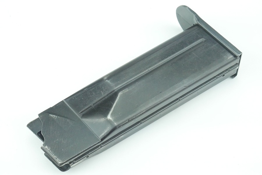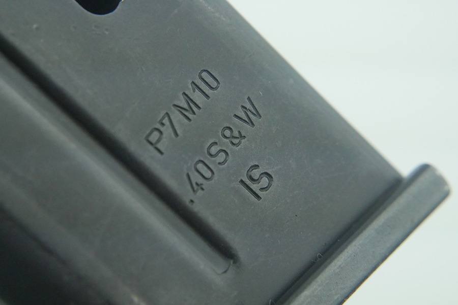 11/1/24 – This is a great example of a Rare H&K P7M10 magazine in .40 S&W. The P7M10 is a rare variant of the more popular P7M8 and the P7M13. Like all P7’s the M10 used a mechanism for cocking the pistol known as a “Squeeze Cocker” where the user had to squeeze the grip of the pistol in order to cock the firearm to fire. The P7M10 was chambered in .40 Smith and Wesson unlike the P7M8 and P7M13 which were chambered in 9mm. This magazine is in .40 S&W and has a 10 round capacity. There is some wear to the finish, however, this wear is consistent with standard use. The left side of the magazine is marked with “P7M10 .40 S&W IS”. The spring on this magazine is still strong and fully functional.
