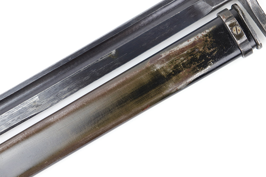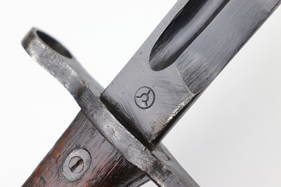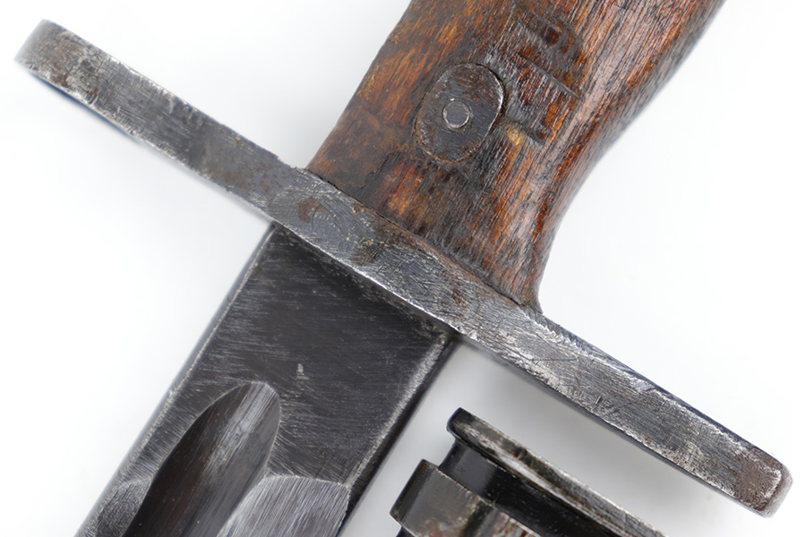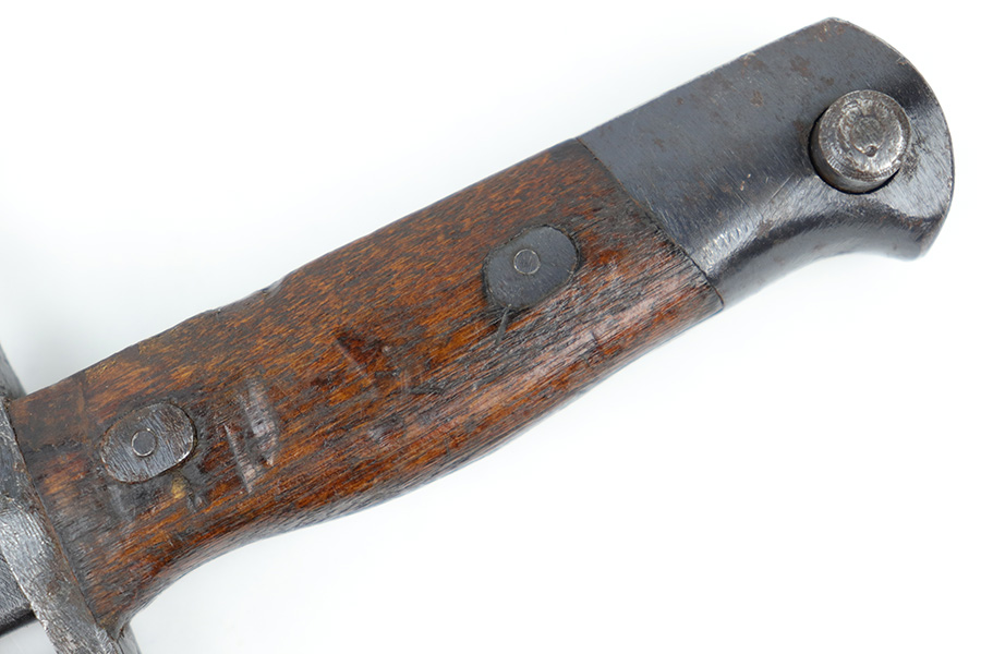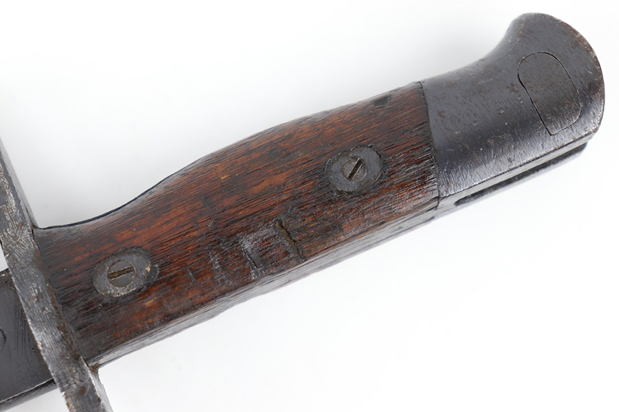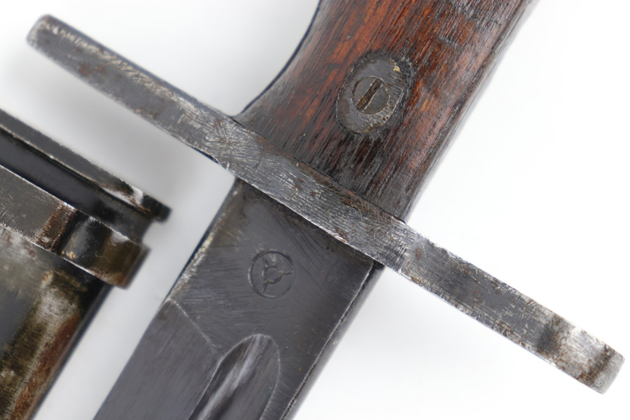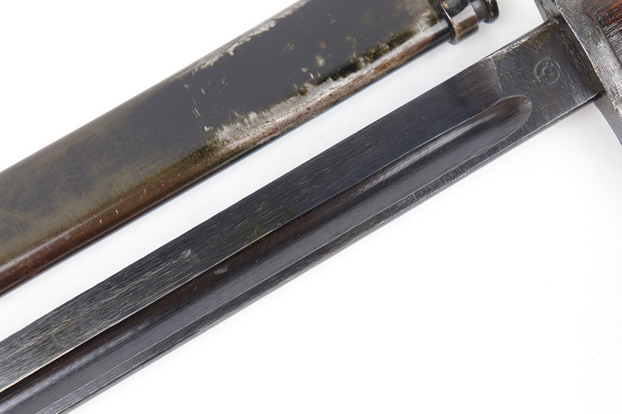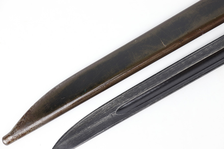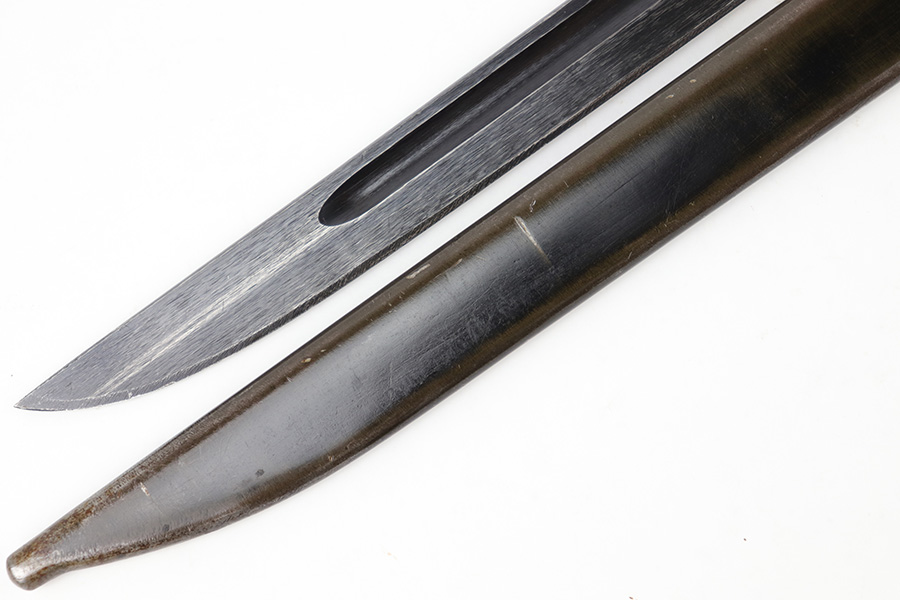 5/10/23 – This is an original WW2 production Japanese Type 30 Bayonet. The bayonet is classified as a Variation D on page 206 of Labar’s book. This example features an excellent condition blued, fullered blade, straight cross guard, bird’s head pommel, contoured wood grips with washers and screws, and a tubular tipped metal scabbard. The blade is arsenal stamped on one side of the ricasso, as shown. This is by Hoten Arsenal, commonly referred to as Mukden arsenal. There were only around 3,000 bayonets produced by this arsenal during WW2. The cross guard and pommel have light surface patina but most of the original finish is intact. The wood grips show typical age but no major issues. The scabbard has light finish loss and mild surface patina but no dents or major issues. Overall an excellent wartime example.