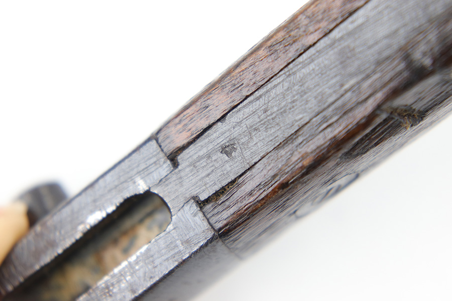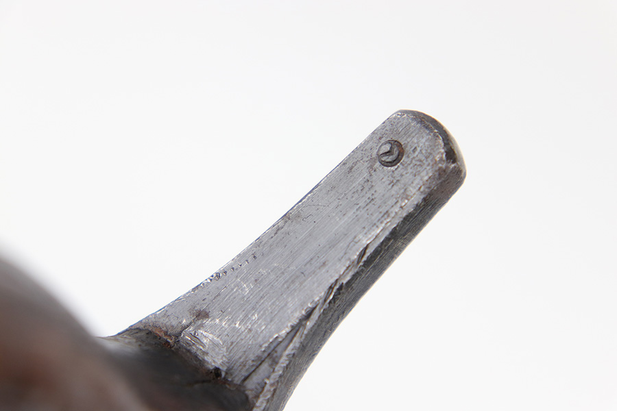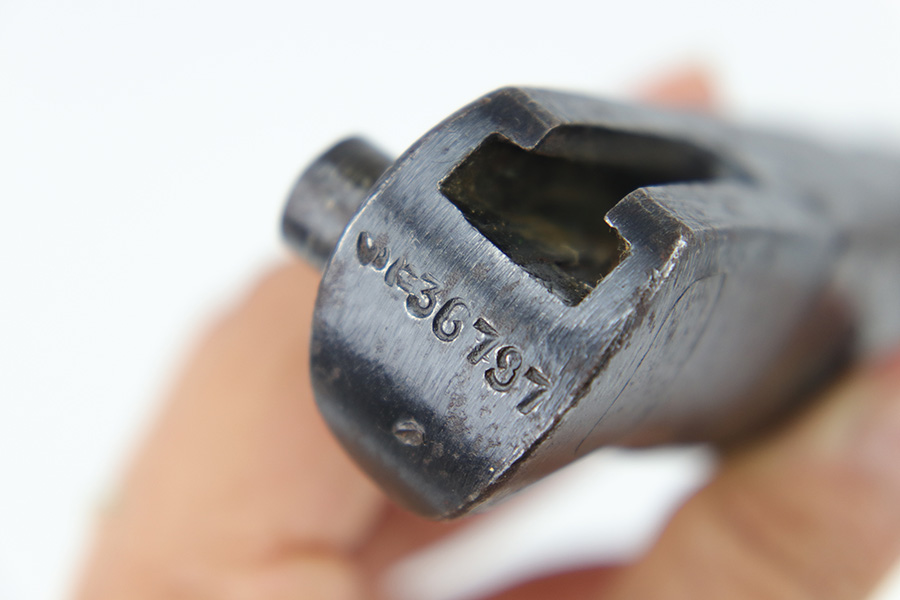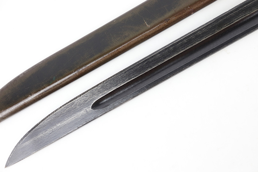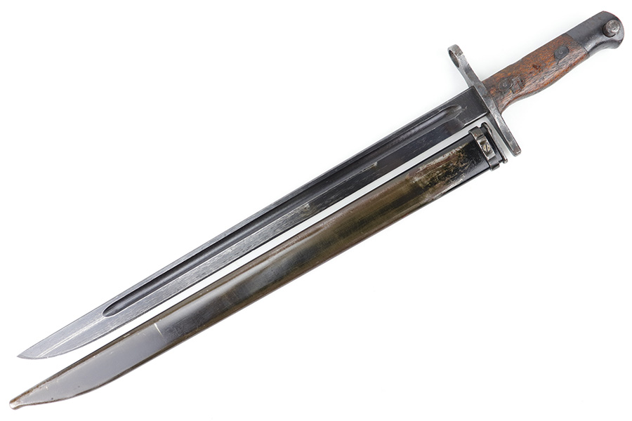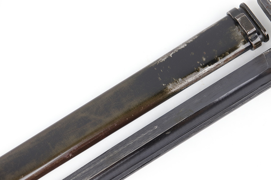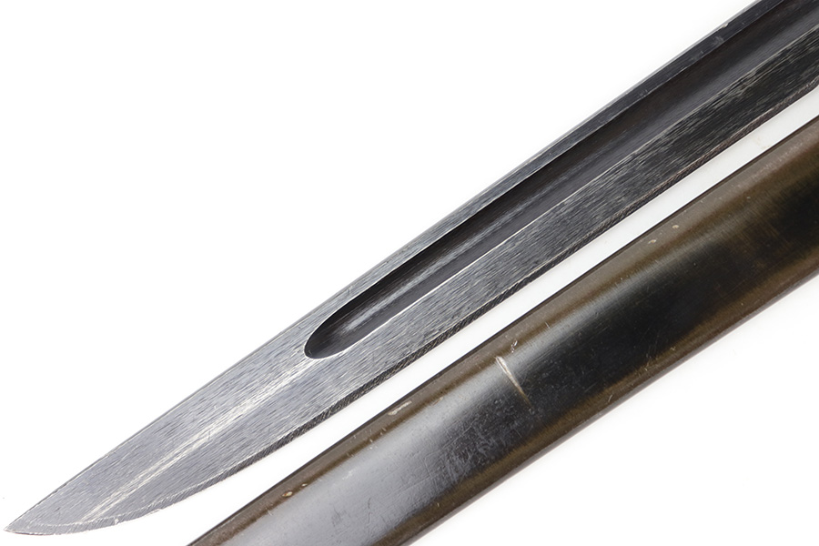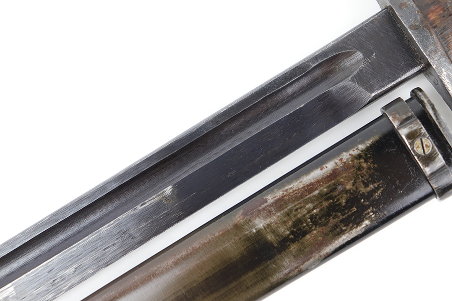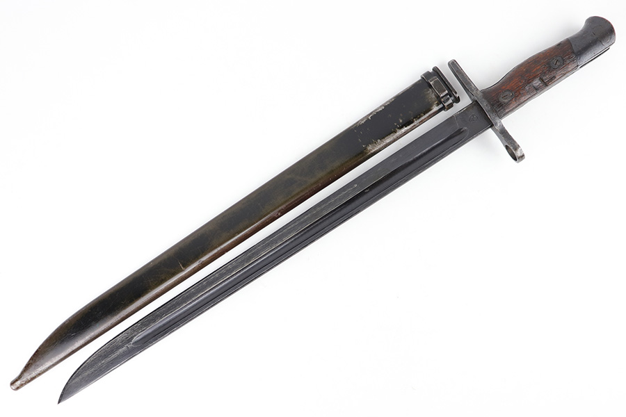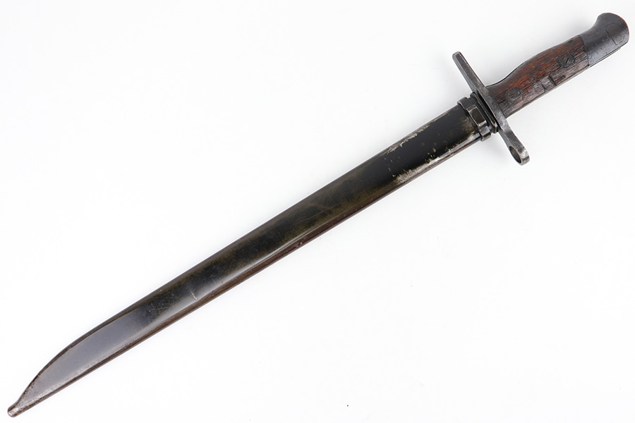 5/10/23 – This is an original WW2 production Japanese Type 30 Bayonet. The bayonet is classified as a Variation D on page 206 of Labar’s book. This example features an excellent condition blued, fullered blade, straight cross guard, bird’s head pommel, contoured wood grips with washers and screws, and a tubular tipped metal scabbard. The blade is arsenal stamped on one side of the ricasso, as shown. This is by Hoten Arsenal, commonly referred to as Mukden arsenal. There were only around 3,000 bayonets produced by this arsenal during WW2. The cross guard and pommel have light surface patina but most of the original finish is intact. The wood grips show typical age but no major issues. The scabbard has light finish loss and mild surface patina but no dents or major issues. Overall an excellent wartime example.