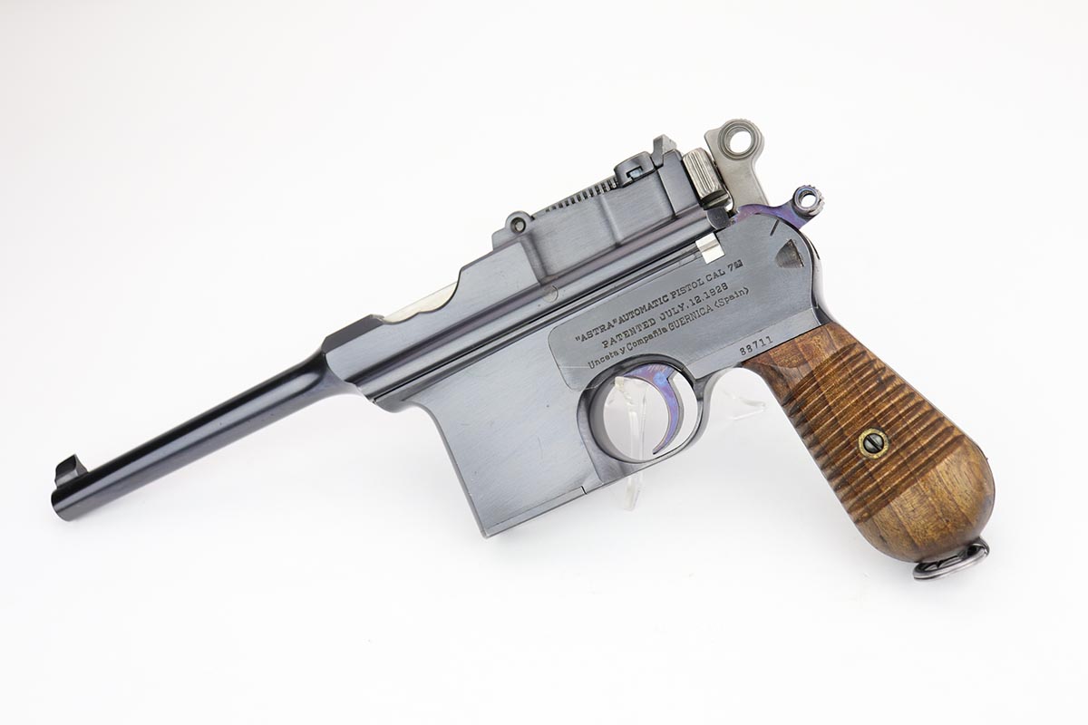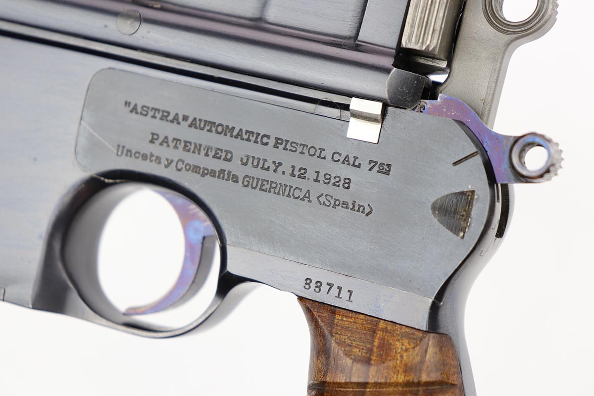 In 1927, the Spanish firm of Astra-Unceta y Cia, Guernica began producing their own “look-alike” version of the of the “Mauser C96”; The “Astra Modelo 900”. This was in an effort to compete against Mauser in the export market and cash in on the lucrative far east arms trade. Astra’s Export Director Ernesto Borchers traveled to Asia to promote sales of the new weapon. He returned to Spain with a three-year contract for 72,000 M900’s in 7.63 mm Mauser caliber. A total of approximately 35,000 of the standard Model 900’s pistols were produced at the Astra factory, with about 30,000 of those exported to China. After the long and devastating Spanish civil war, the nation of Spain was finally united under the right-wing dictator General Francisco Franco in April 1939. As an immerging nation, Spain’s new government was officially “neutral” during World War-II, but was a consistent supporter of Nazi Germany and the Axis powers. “Neutral” Spain, in contravention of the “international Neutrality Act”, was a major supplier of armaments to the Wehrmacht throughout the war. In 1941, Spain’s Astra company sold 6,000 Astra Modelo 400 pistols directly to the German military. Additionally, Astra subsequently sold about 63,000 Modelo 300 pistols chambered for 9mm Kruz and about 10,500 Modelo 600’s chambered for the 9mm Parabellum to the German Army during the war years.