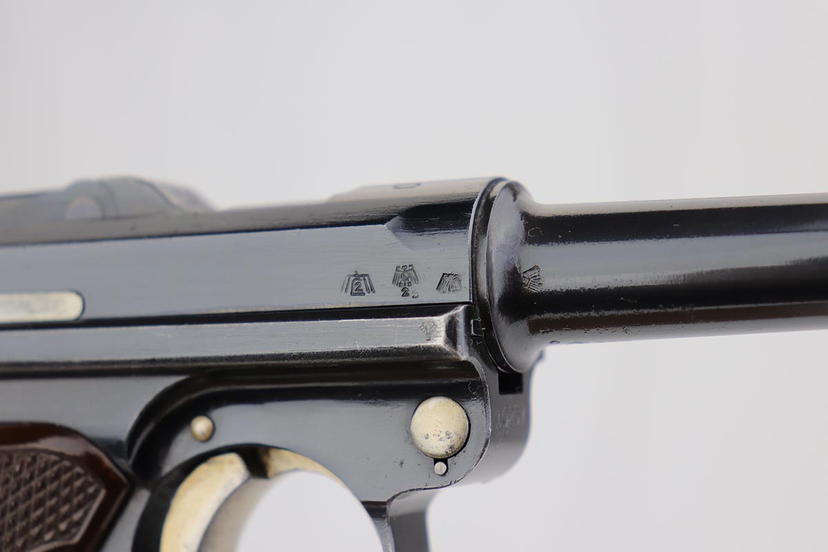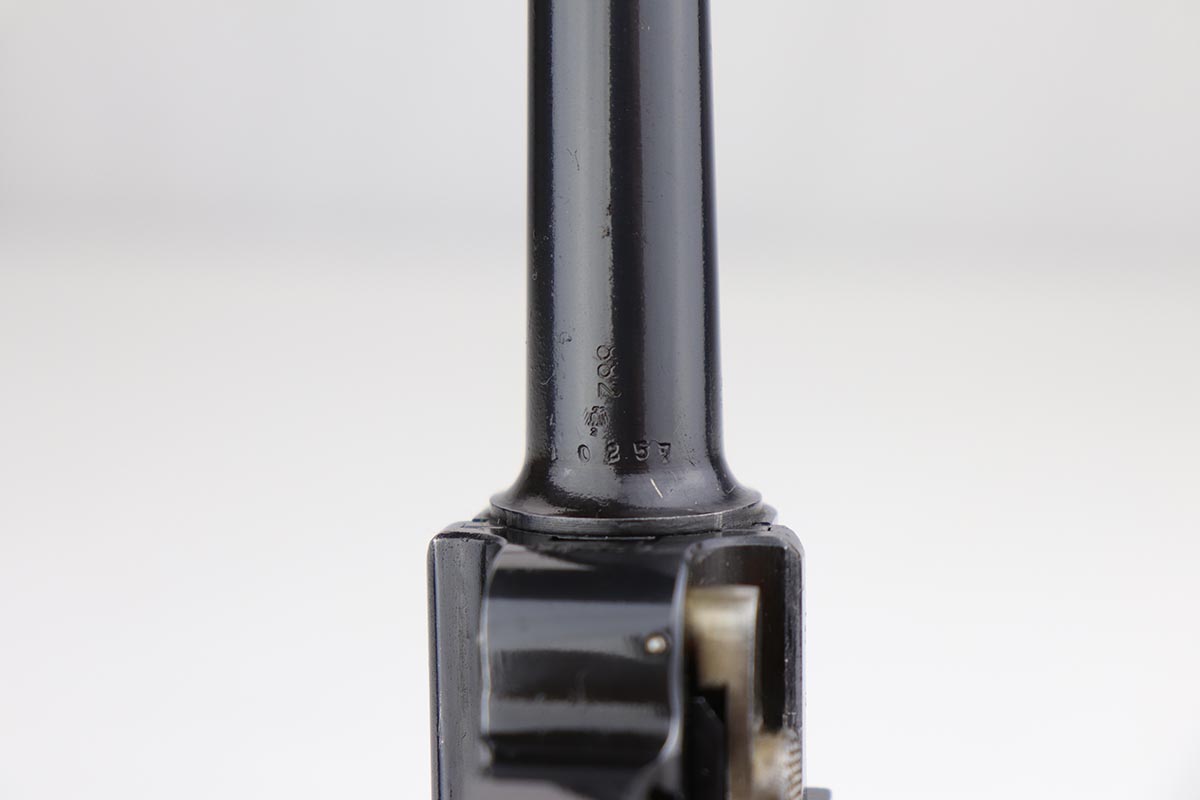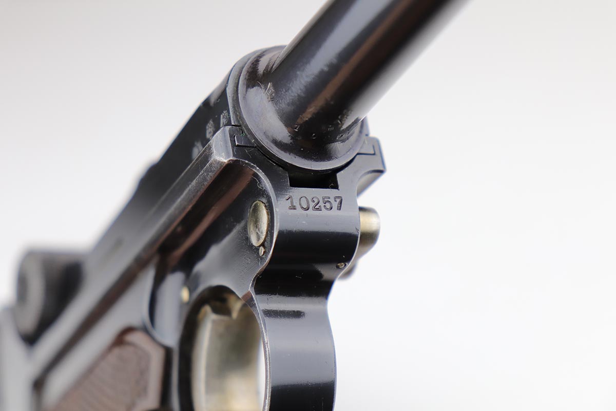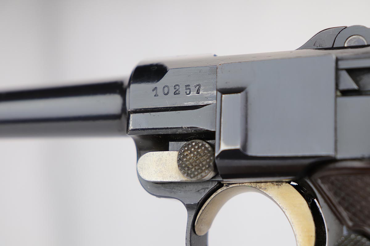 9/27/19 – This is one of the finest examples we’ve seen of an extremely rare and desirable Krieghoff Luger. One of only about 1,000 produced, this pistol is all matching and original with 98% of the beautiful Krieghoff bluing remaining. There is a minor area of slight thinning and patina on the left side of the barrel, and a couple hints of high edge thinning otherwise. Small parts retain about 70% of the original straw. Excellent brown Krieghoff grips. The magazine is mismatched but is an original Krieghoff example. Krieghoff Eagle/2 proof present on frame, barrel, sideplate, coupling link, toggle, firing pin, etc.