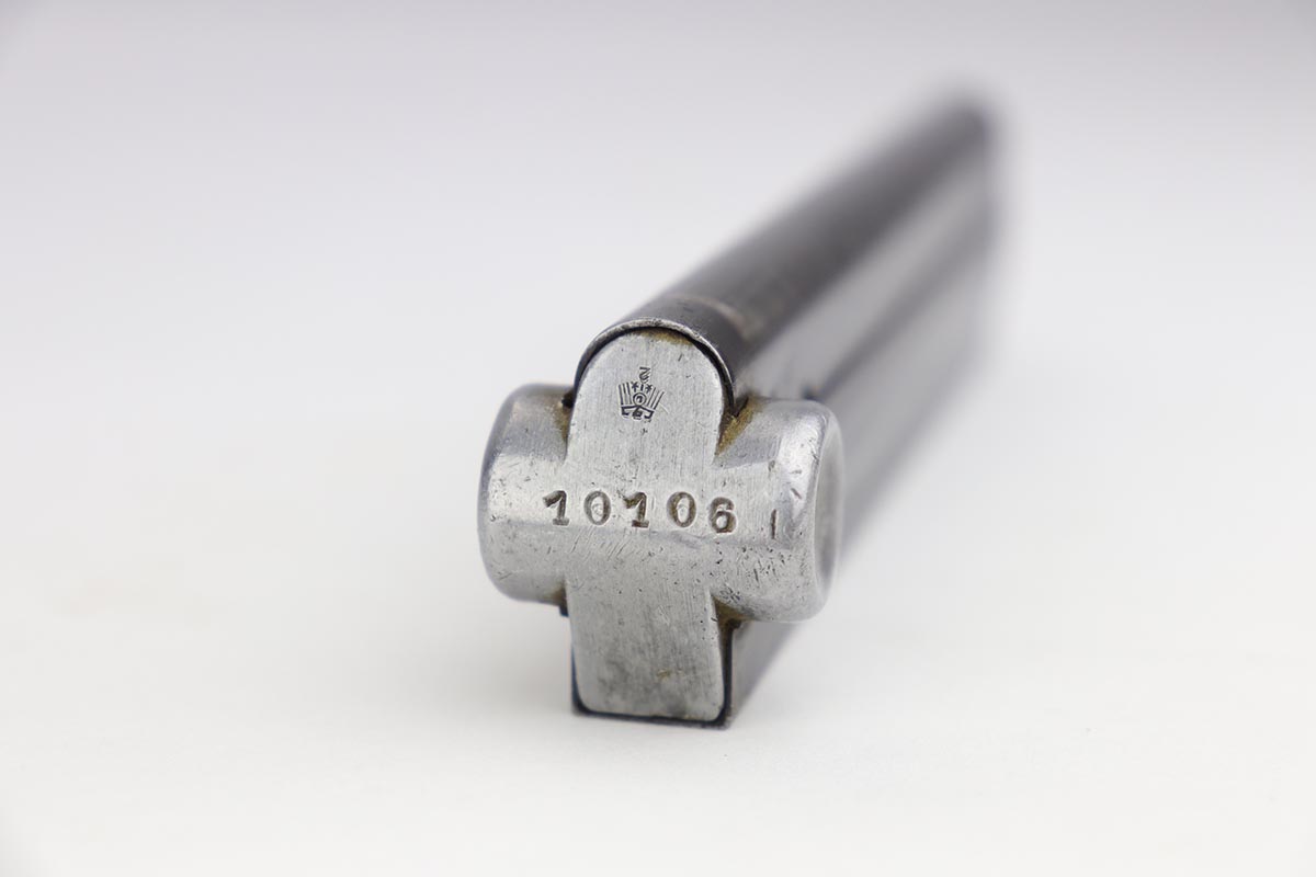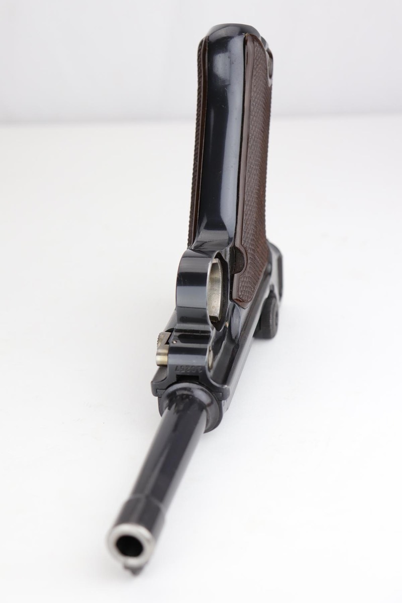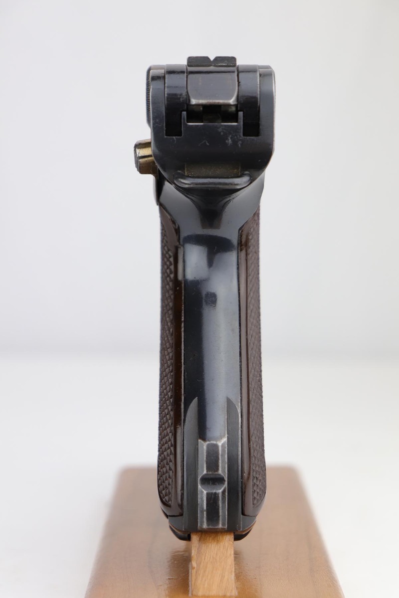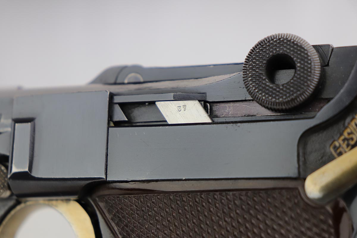 9/27/19 – This is one of the finest examples we’ve seen of an extremely rare and desirable Krieghoff Luger. One of only about 1,000 produced, this pistol is all matching and original with 98% of the beautiful Krieghoff bluing remaining. There is a minor area of slight thinning and patina on the left side of the barrel, and a couple hints of high edge thinning otherwise. Small parts retain about 70% of the original straw. Excellent brown Krieghoff grips. The magazine is mismatched but is an original Krieghoff example. Krieghoff Eagle/2 proof present on frame, barrel, sideplate, coupling link, toggle, firing pin, etc.