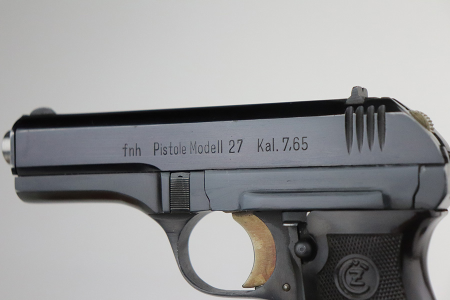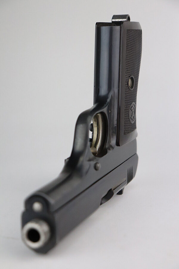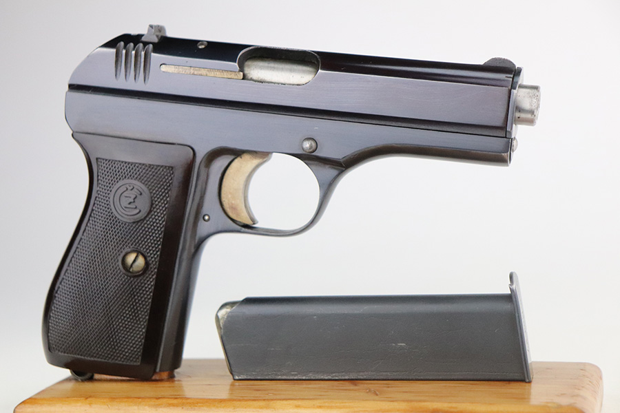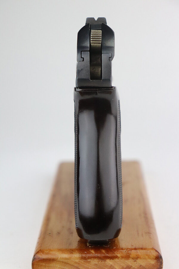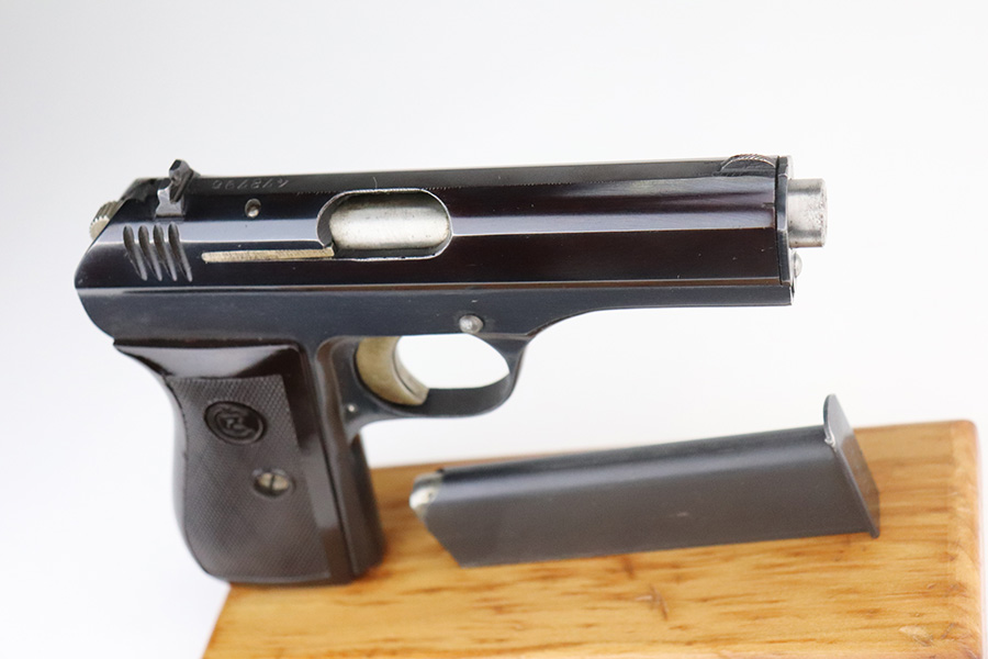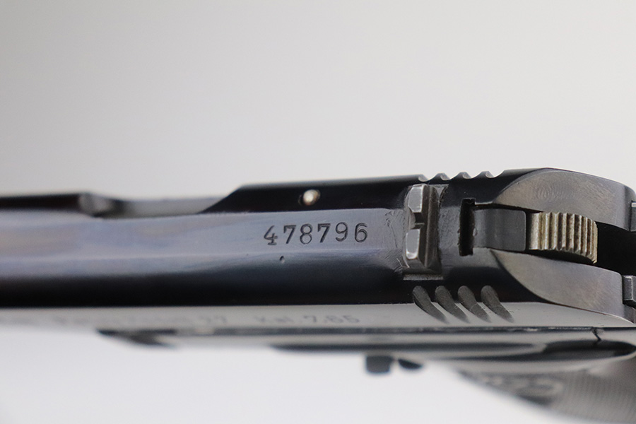 7/3/21 – This is a near-mint example of a rare CZ 27 manufactured immediately following WW2, in 1945. It has a gorgeous high polish finish and no proofs or slide legend. These guns were put together after the war using leftover WW2 parts. Only about 9,000 made. The correct serial range for this variation is 476,000 – 485,000. This gun is in the correct serial range for this variation. It has retained more than 98% of its original high polish finish. There is just a hint of wear on the high edges of the slide and around the muzzle. Comes with an excellent grip – no chips or cracks. Also comes with a period-correct magazine. Mint bore.