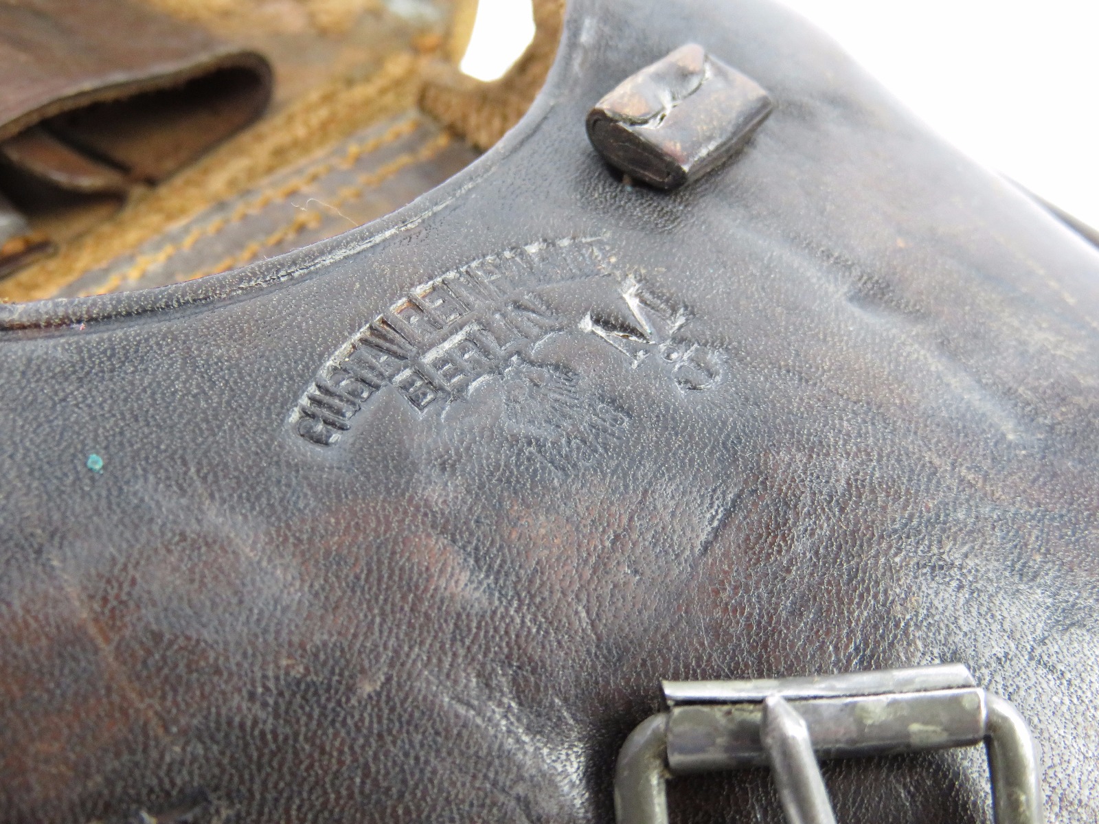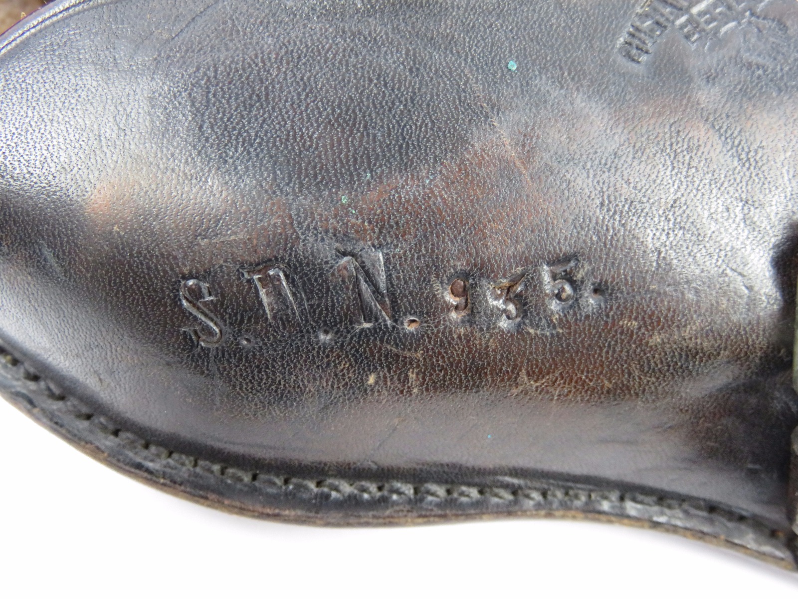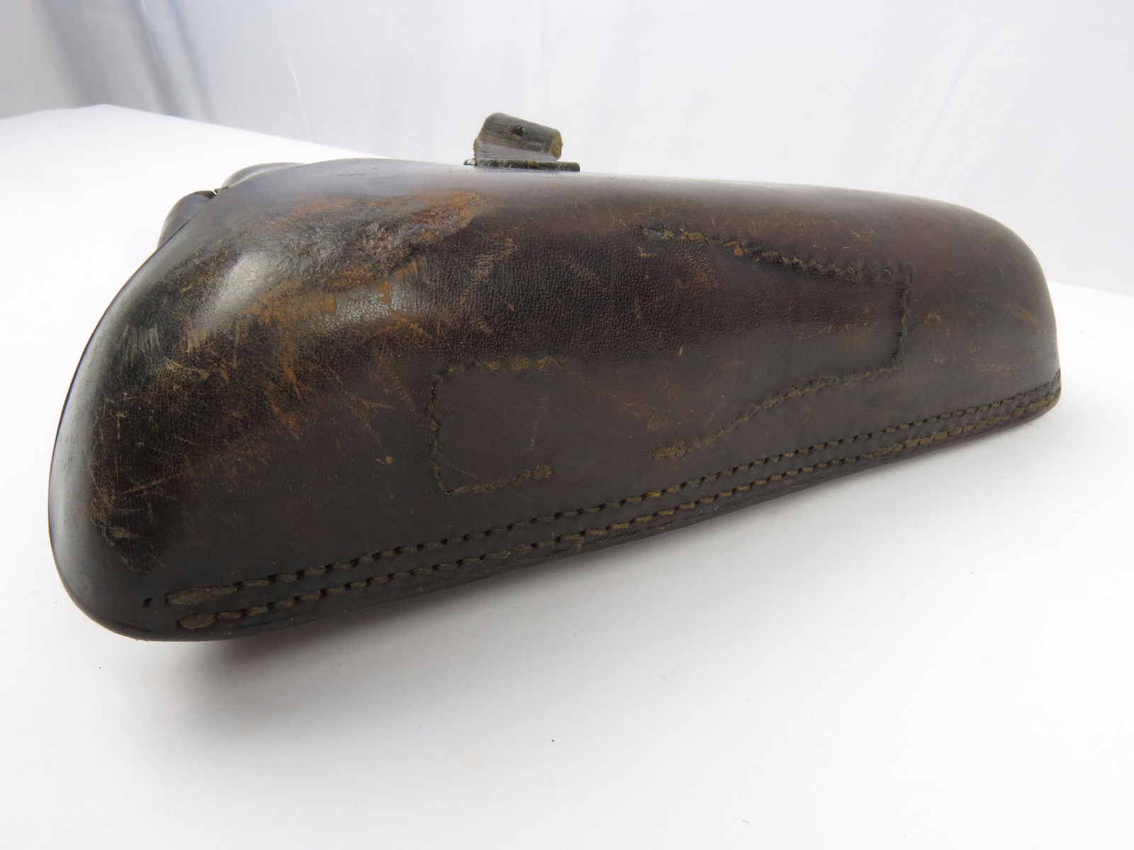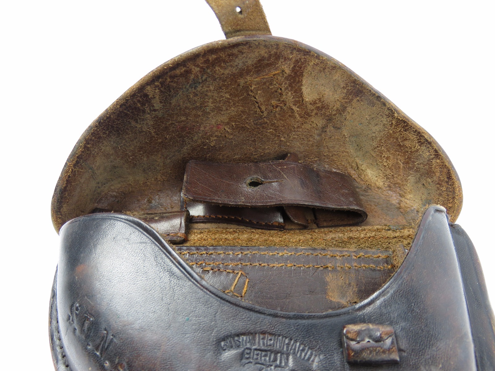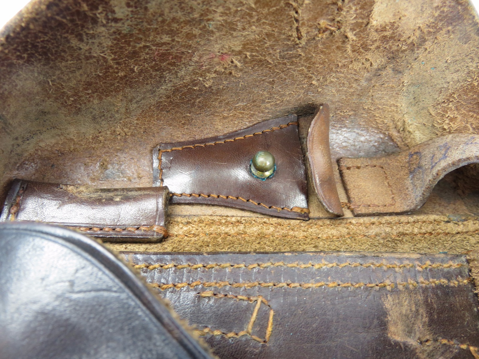 10/19/17 – This is an original WW1 era Imperial Navy Luger holster. These holsters are extremely scarce, and are characterized by the “M” over anchor stamp. This stamp is next to the maker stamp under the top flap on the main body of leather. There is also an imperial eagle WaA18 proof stamp. To the left of these stamps is a unit stamped into the leather “S.D.N. 935.” This is a ‘custom’ stamp that would have been done by a soldier outside of the factory. The holster leather is strong and excellent with no major issues. The top leather has some surface wear, but no major flaws. The stitching is all original and in tact.