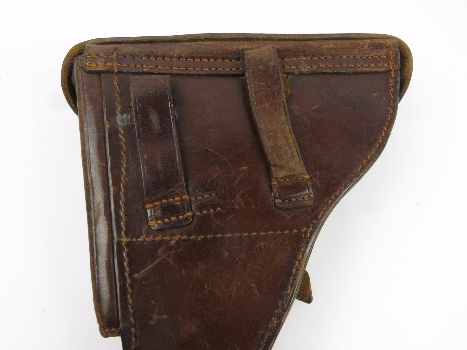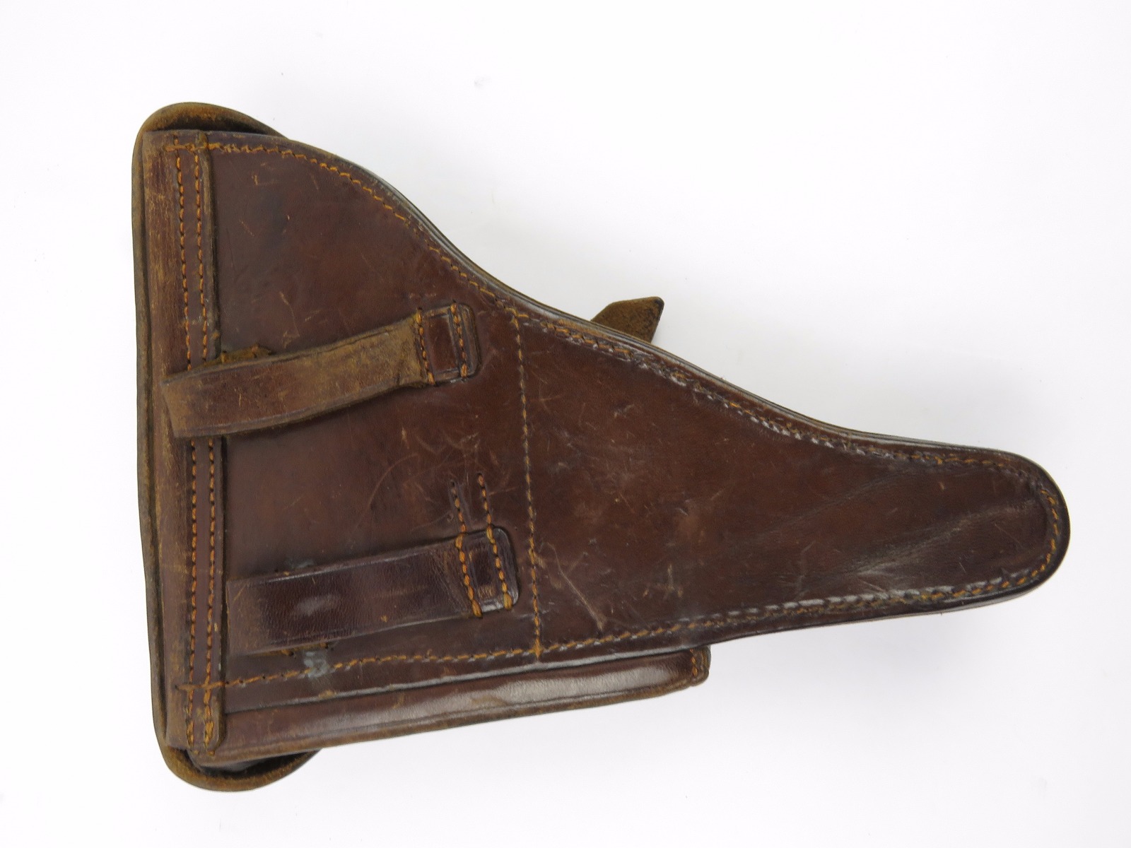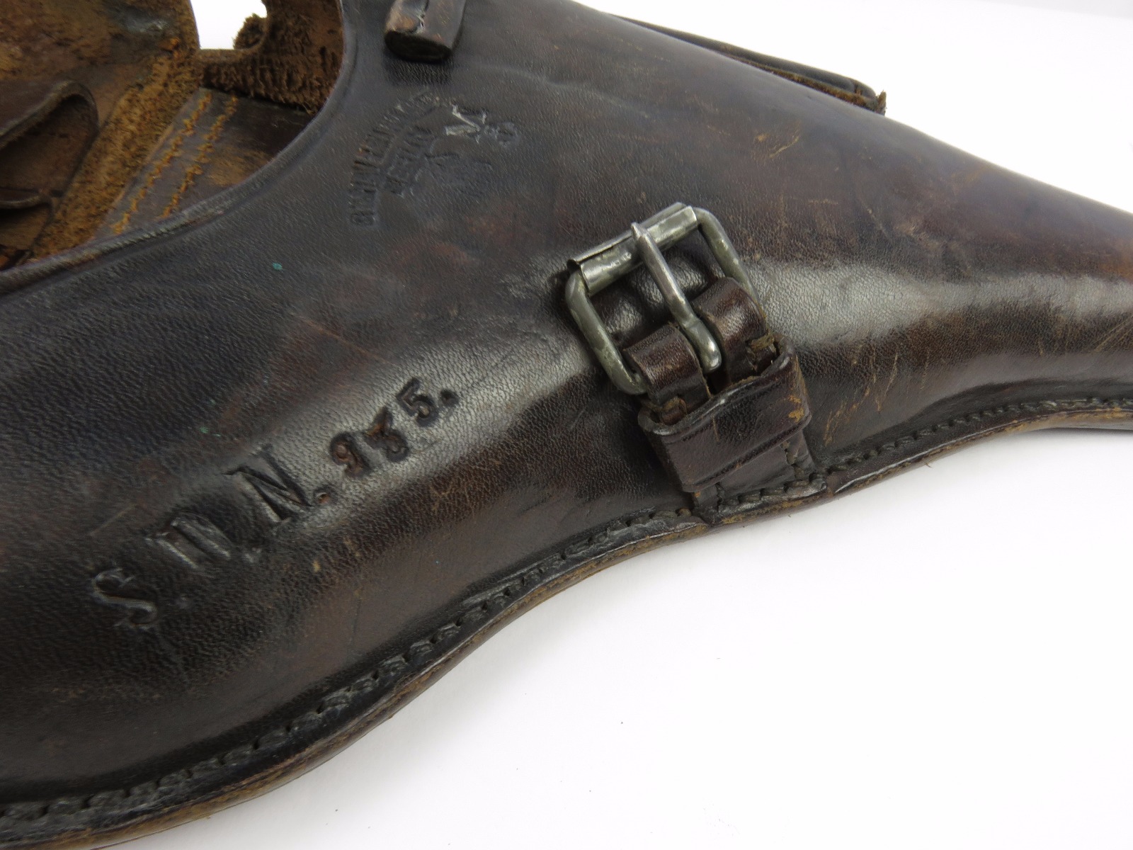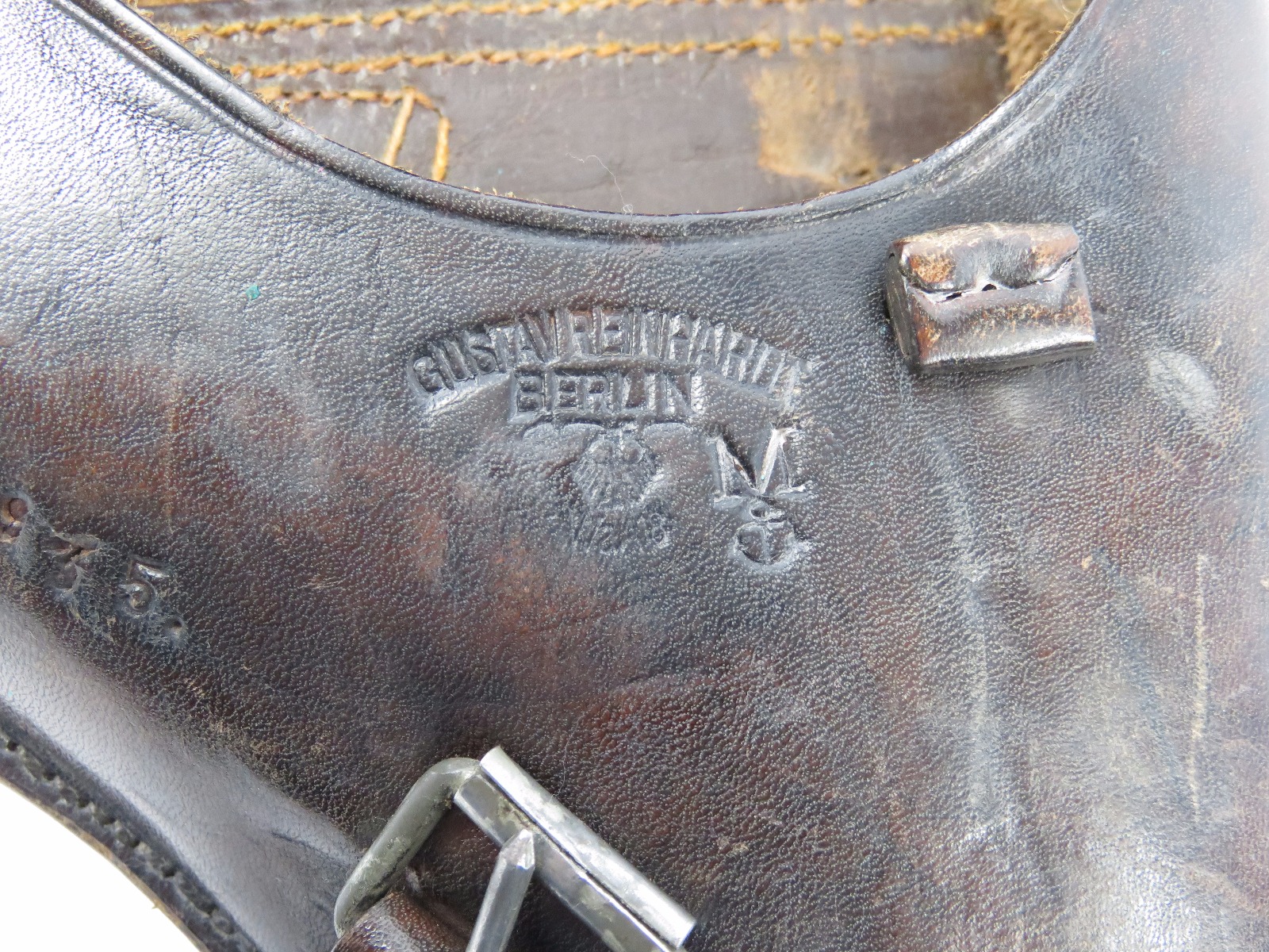 10/19/17 – This is an original WW1 era Imperial Navy Luger holster. These holsters are extremely scarce, and are characterized by the “M” over anchor stamp. This stamp is next to the maker stamp under the top flap on the main body of leather. There is also an imperial eagle WaA18 proof stamp. To the left of these stamps is a unit stamped into the leather “S.D.N. 935.” This is a ‘custom’ stamp that would have been done by a soldier outside of the factory. The holster leather is strong and excellent with no major issues. The top leather has some surface wear, but no major flaws. The stitching is all original and in tact.