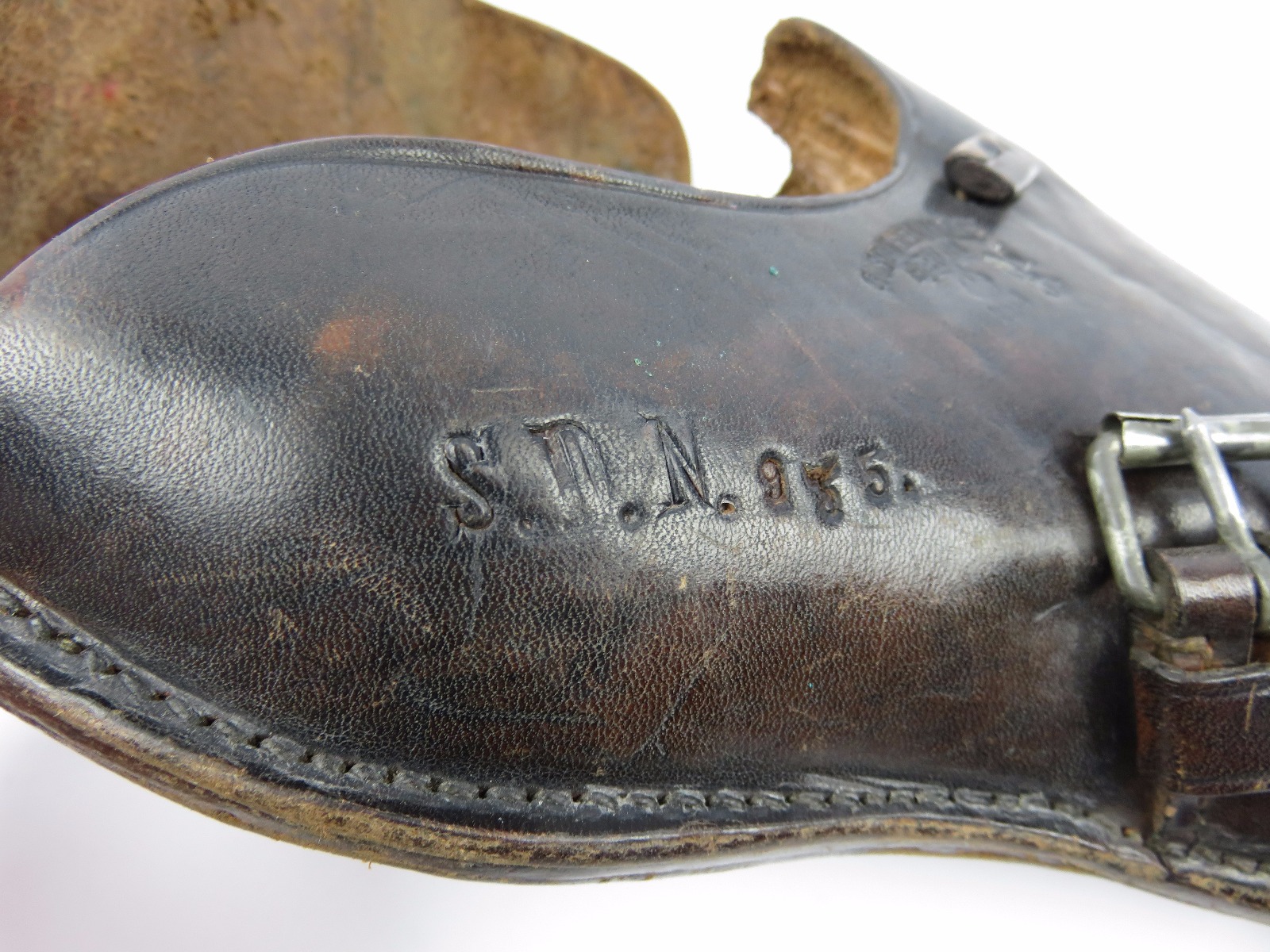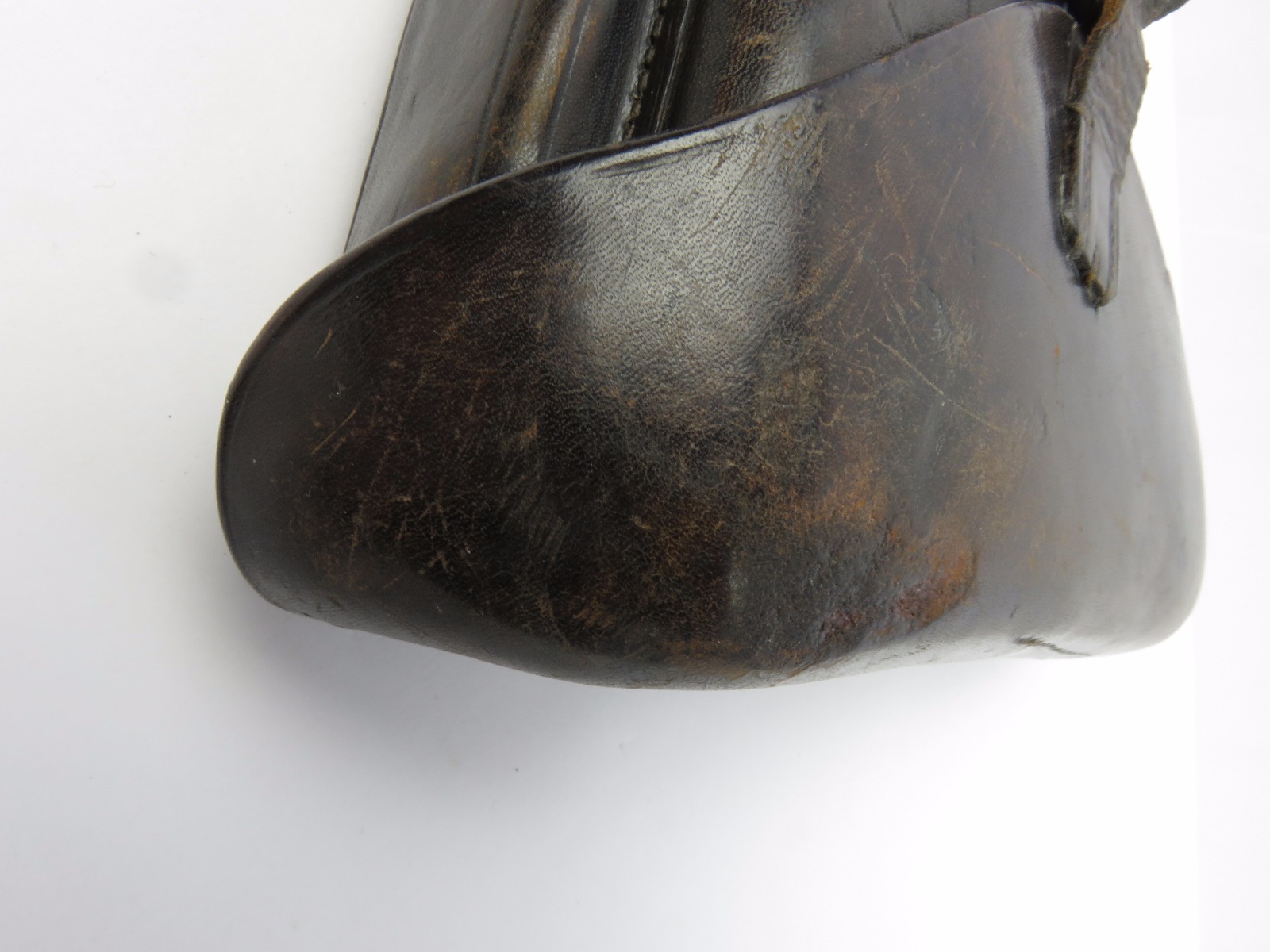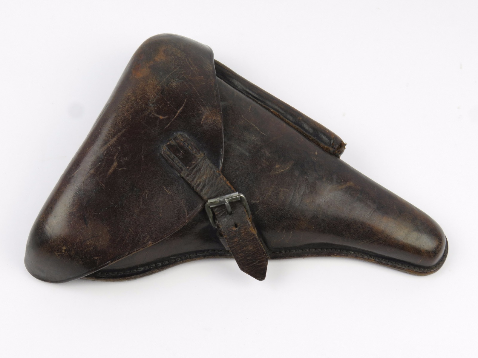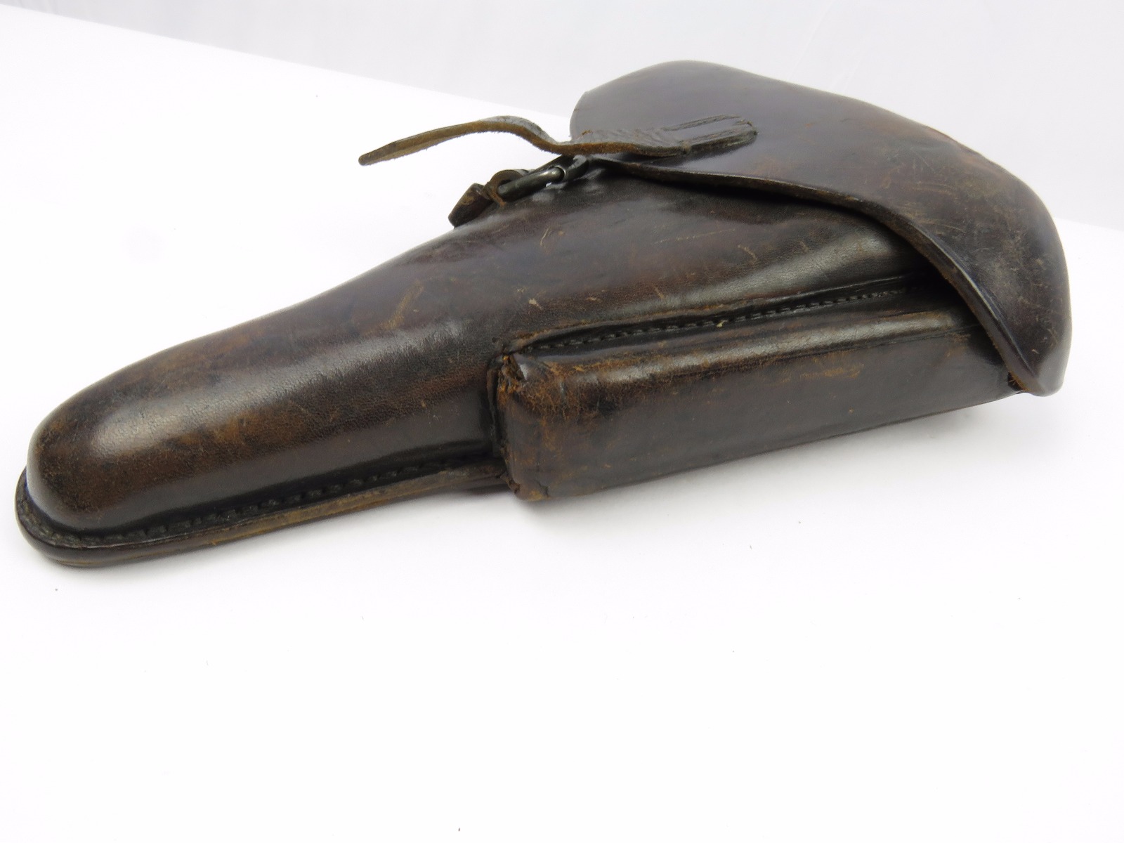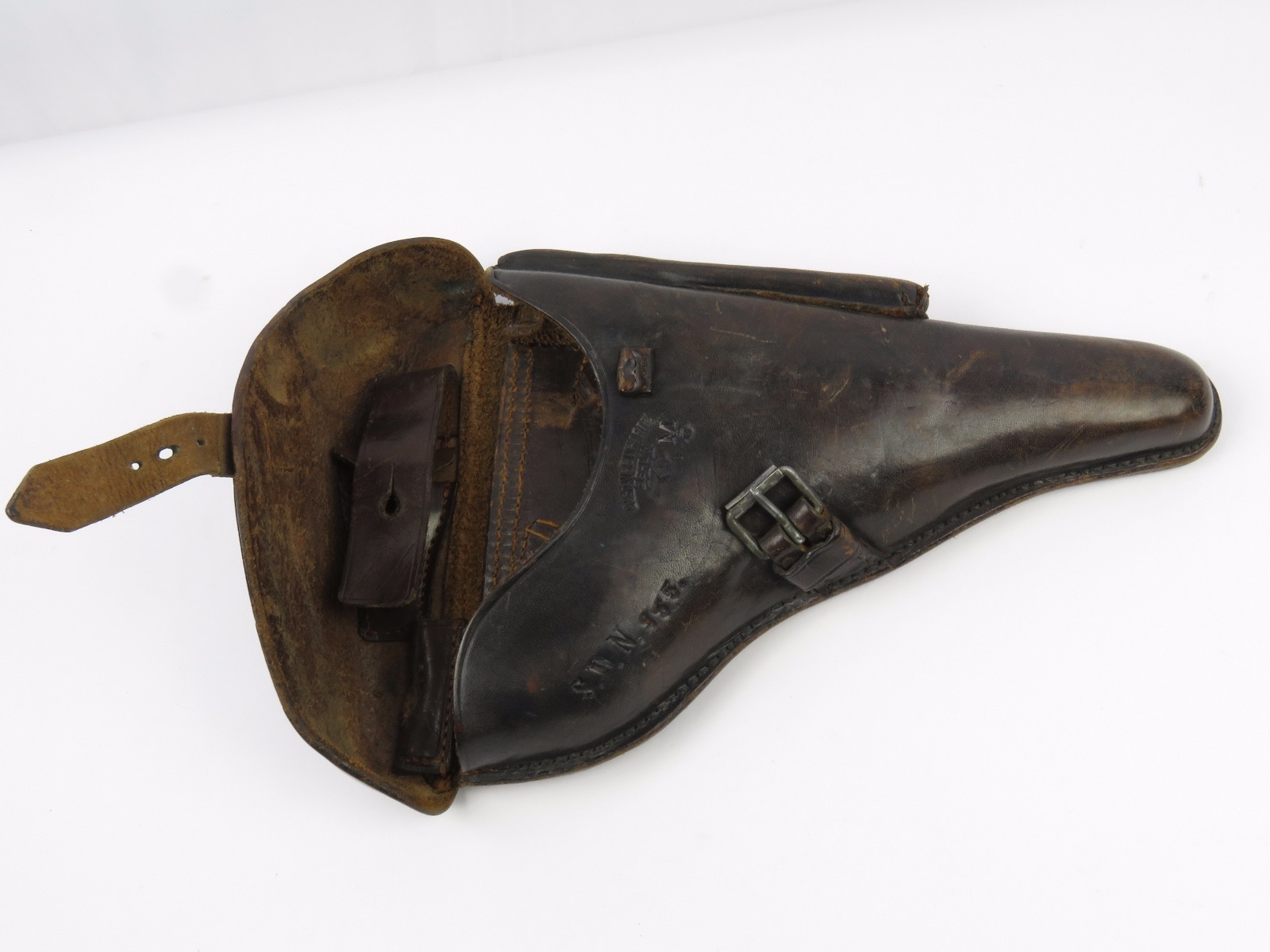10/19/17 – This is an original WW1 era Imperial Navy Luger holster. These holsters are extremely scarce, and are characterized by the “M” over anchor stamp. This stamp is next to the maker stamp under the top flap on the main body of leather. There is also an imperial eagle WaA18 proof stamp. To the left of these stamps is a unit stamped into the leather “S.D.N. 935.” This is a ‘custom’ stamp that would have been done by a soldier outside of the factory. The holster leather is strong and excellent with no major issues. The top leather has some surface wear, but no major flaws. The stitching is all original and in tact.