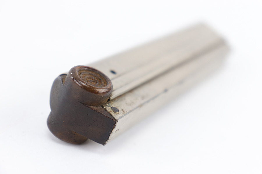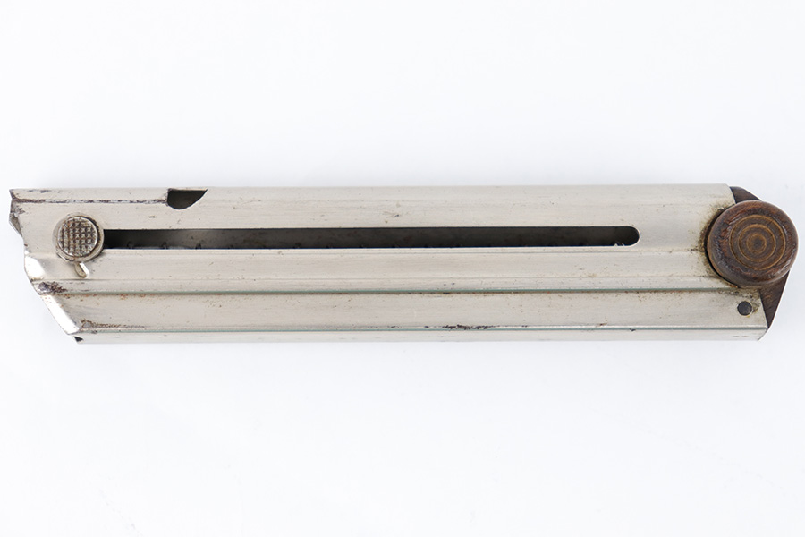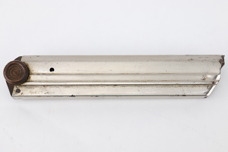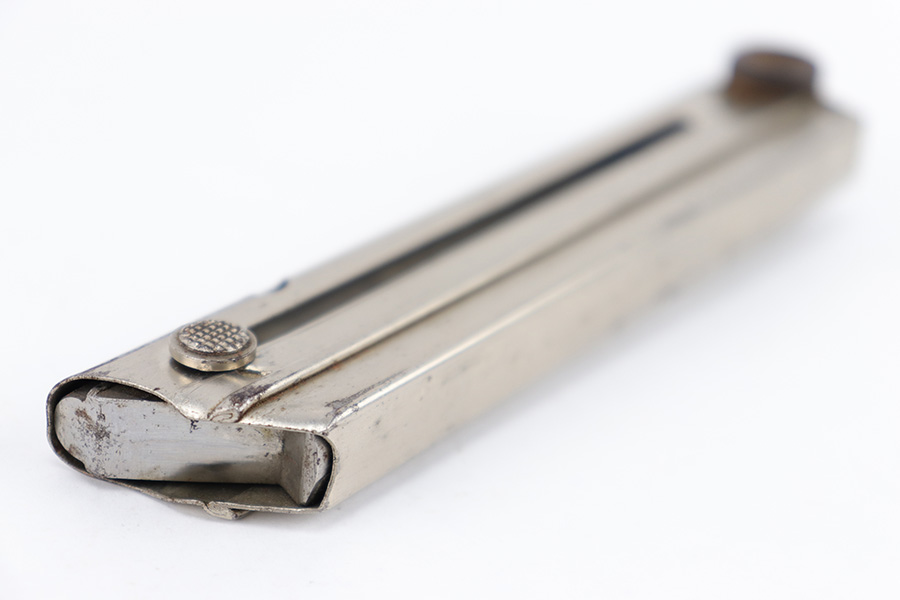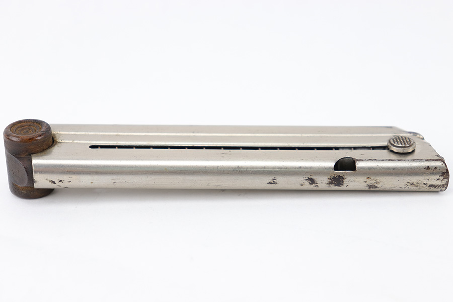 6/30/23 – This is a rare WW1 era production German Navy Luger magazine. The magazine is in near-excellent condition, except for some small areas of surface oxidation and discoloration on the tube. No rust or pitting however, and overall the tube is very clean. The base of the magazine has concentric circles on both sides, a characteristic of Imperial Navy Luger magazines. The base of the magazine is Imperial crown/M proof stamped as well. The base has no other markings or serial number stamps, making this a desirable example. Strong, functional spring.
