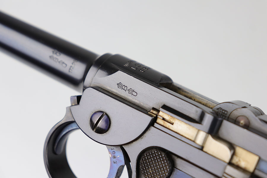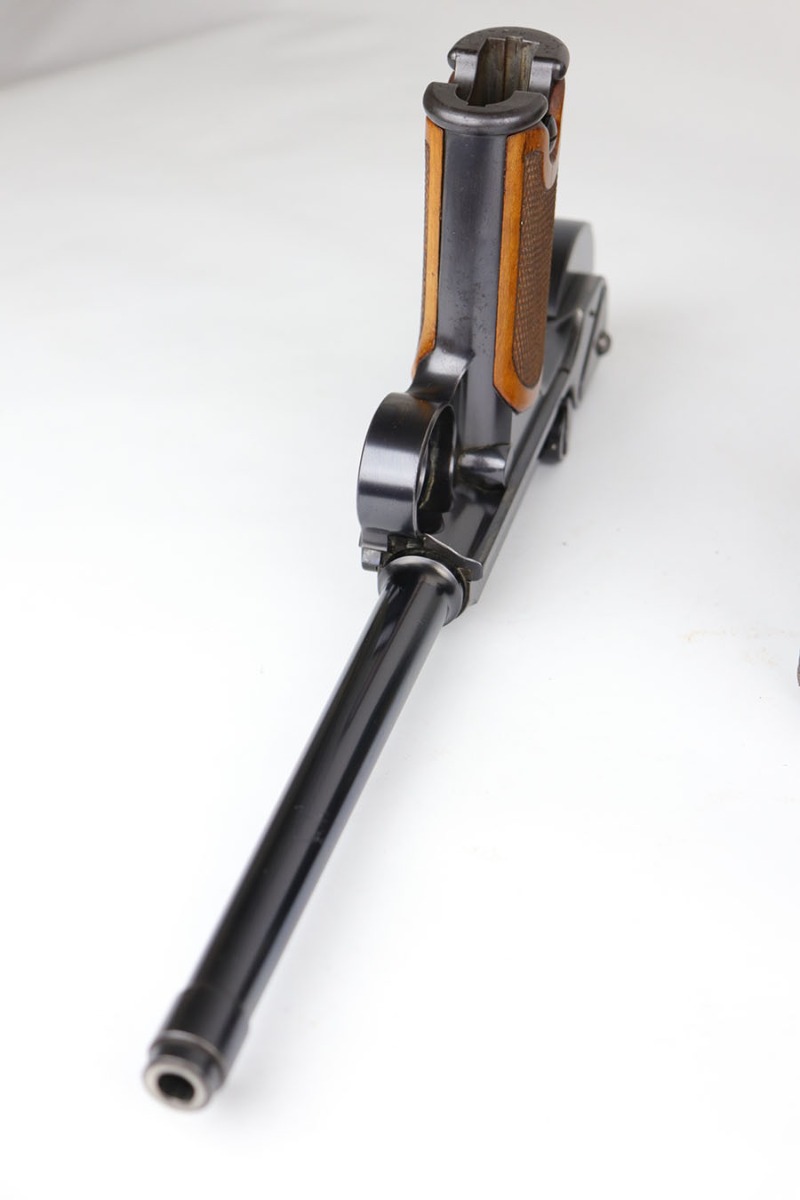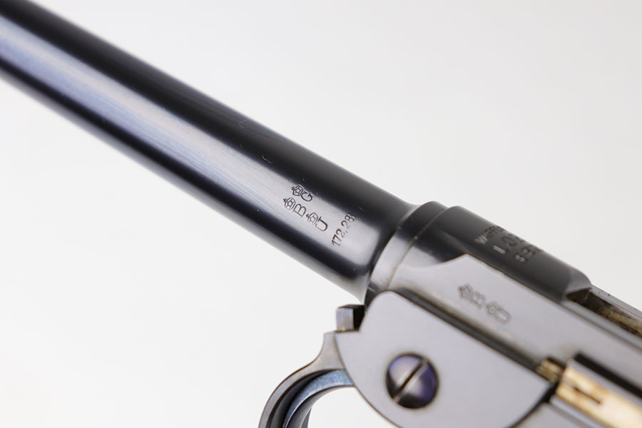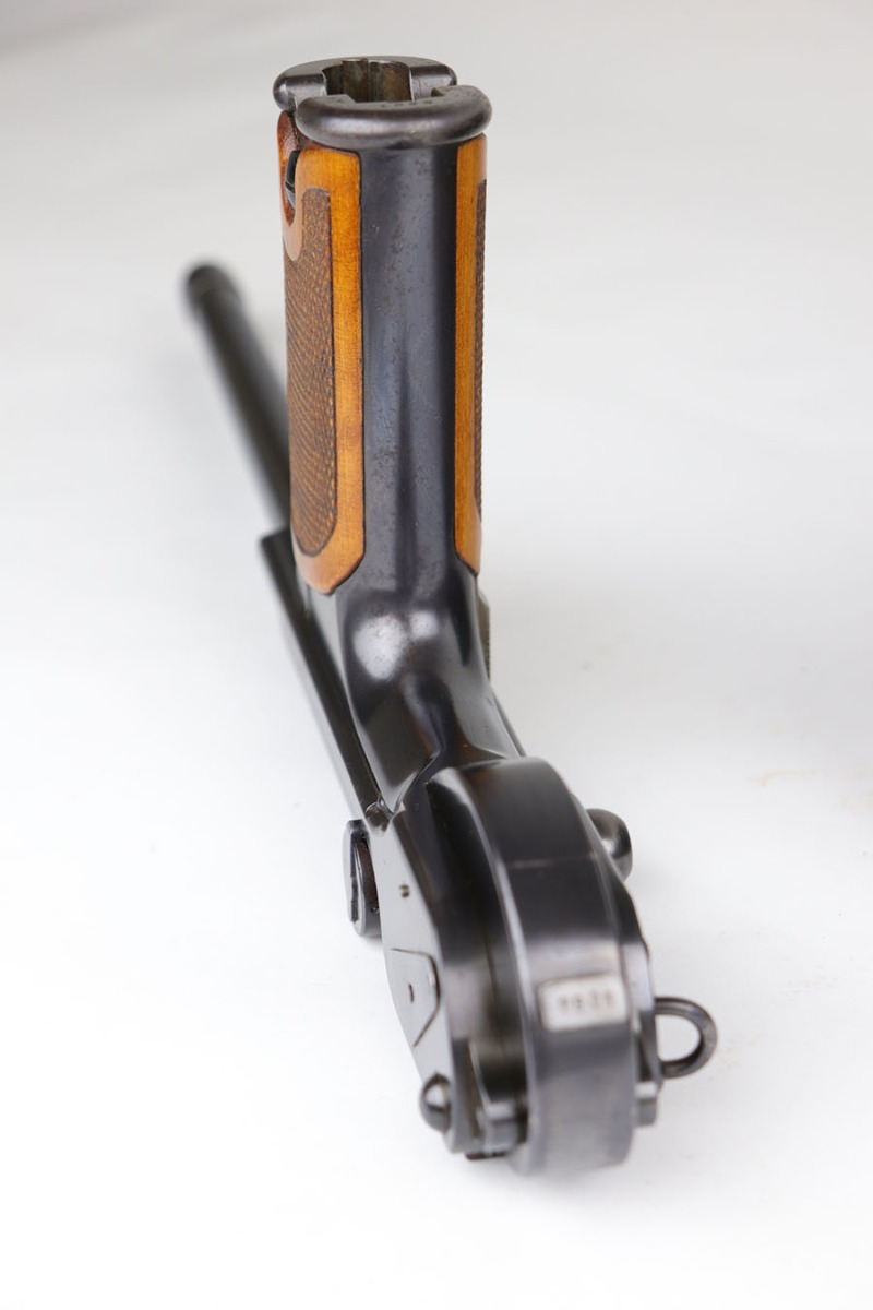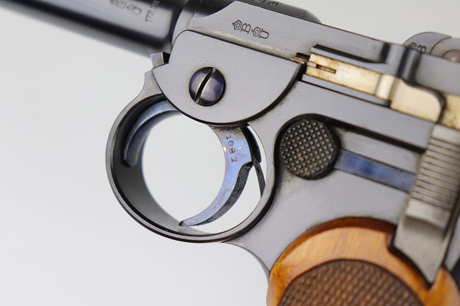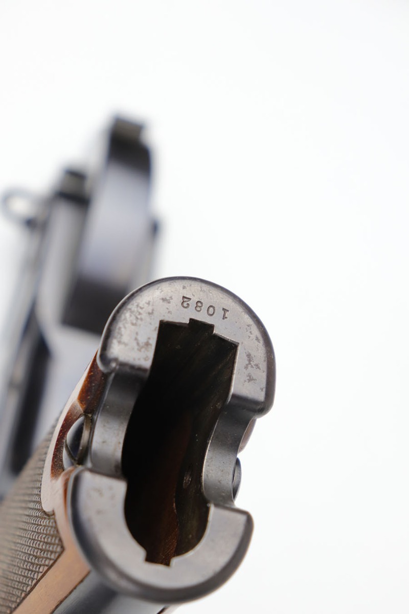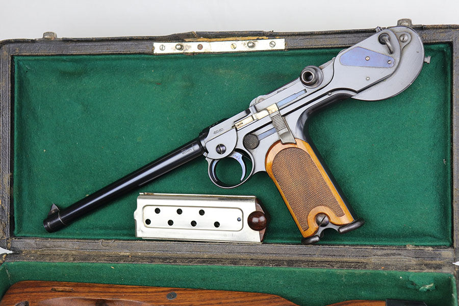 6/9/20 – This is a rare and gorgeous Borchardt luger, or C-93, with original case and extras. It’s likely one of the finest existing examples remaining, especially with all four of the original, matching magazines. The original bluing rates at 98+%, with minor muzzle wear, and a little bit of finish loss where the stock attaches. The included accessories: four magazines that match the pistol, the wooden shoulder stock, matching numbered cheek piece, takedown wrench and pin-punches, brass cleaning rod, and oiler, which are all contained in a Borchardt black leather bound carrying case. The case shows some obvious wear but has its structural integrity. Mint bore on the pistol, to go along with the condition of the grips and bluing.
