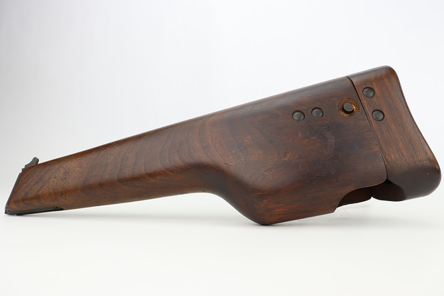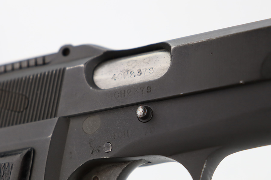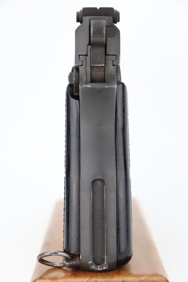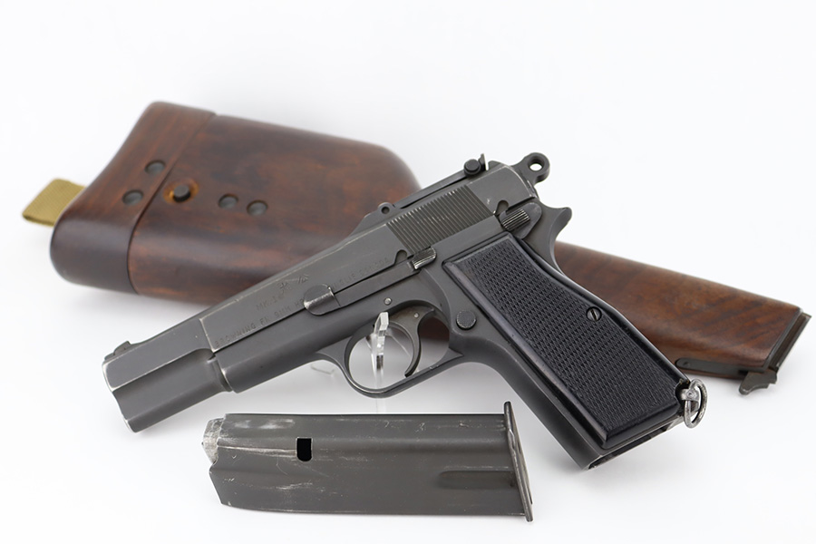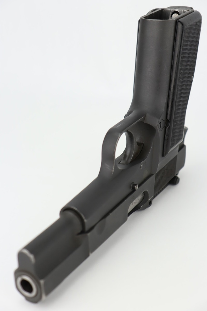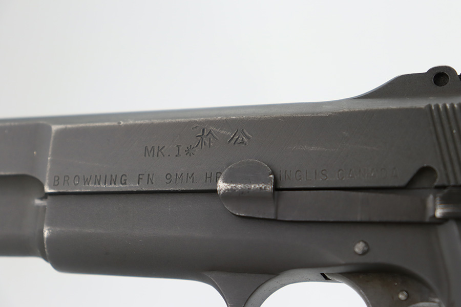 12/5/23 – This is a rare Chinese-contract Canadian Inglis Mk I* High Power. All matching with two Chinese characters on the left side of the slide. It comes as a rig with an excellent wood stock. The gun has retained about 96% of its finish with just very minor wear around the muzzle and on the high edges of the slide. Fitted with period-correct black bakelite grips and comes with a proper “JI” marked magazine. The bore has great rifling, but there is minor pin-pricking throughout.