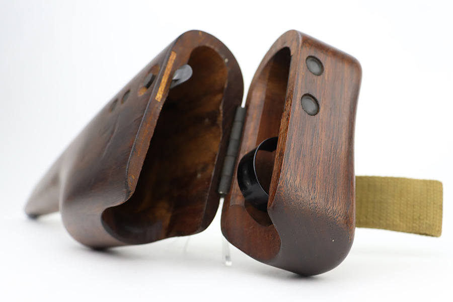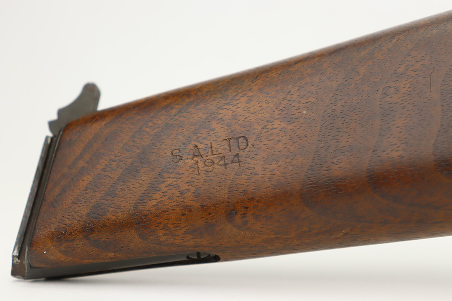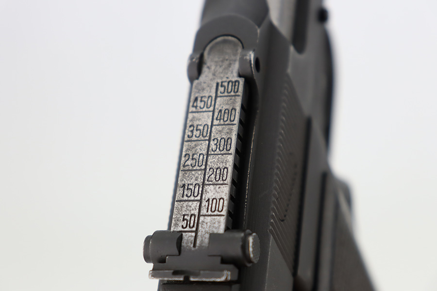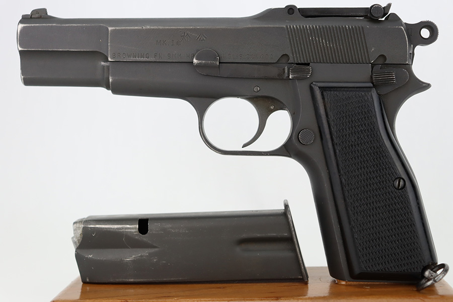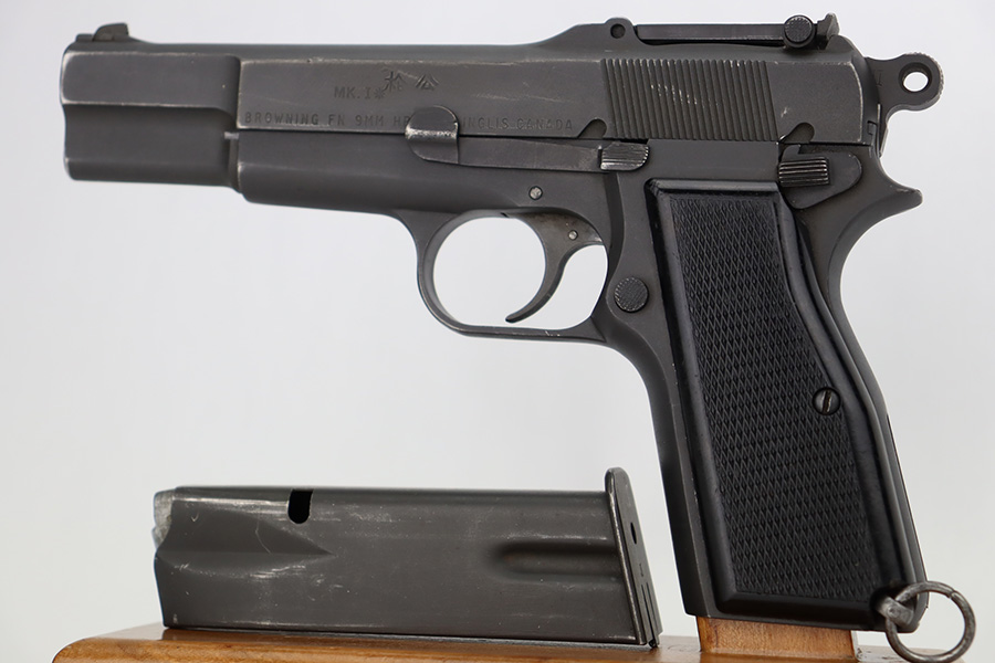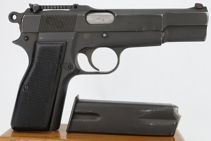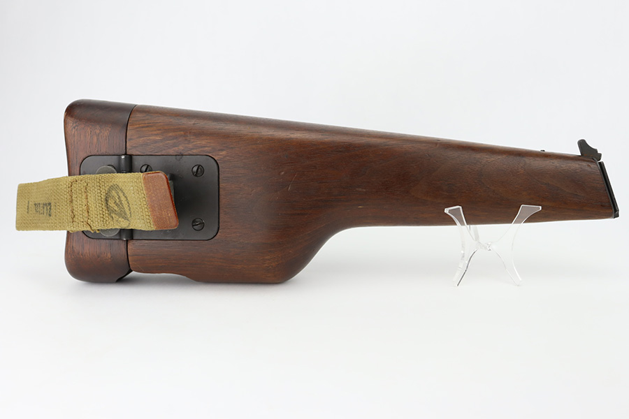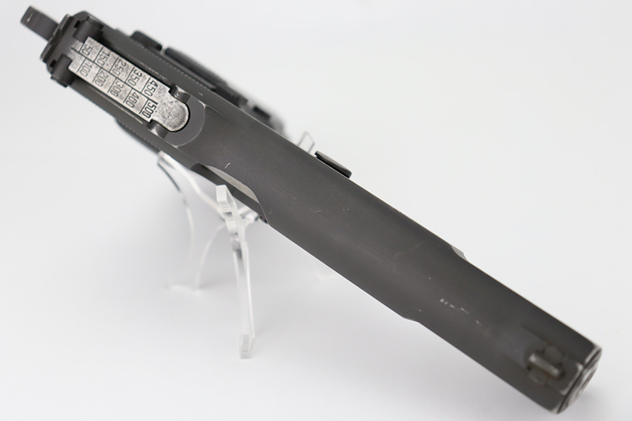 12/5/23 – This is a rare Chinese-contract Canadian Inglis Mk I* High Power. All matching with two Chinese characters on the left side of the slide. It comes as a rig with an excellent wood stock. The gun has retained about 96% of its finish with just very minor wear around the muzzle and on the high edges of the slide. Fitted with period-correct black bakelite grips and comes with a proper “JI” marked magazine. The bore has great rifling, but there is minor pin-pricking throughout.