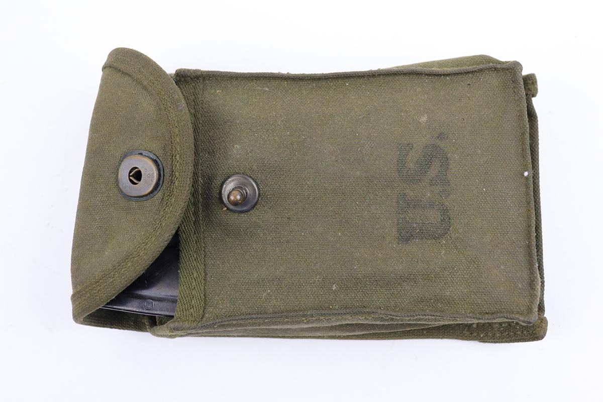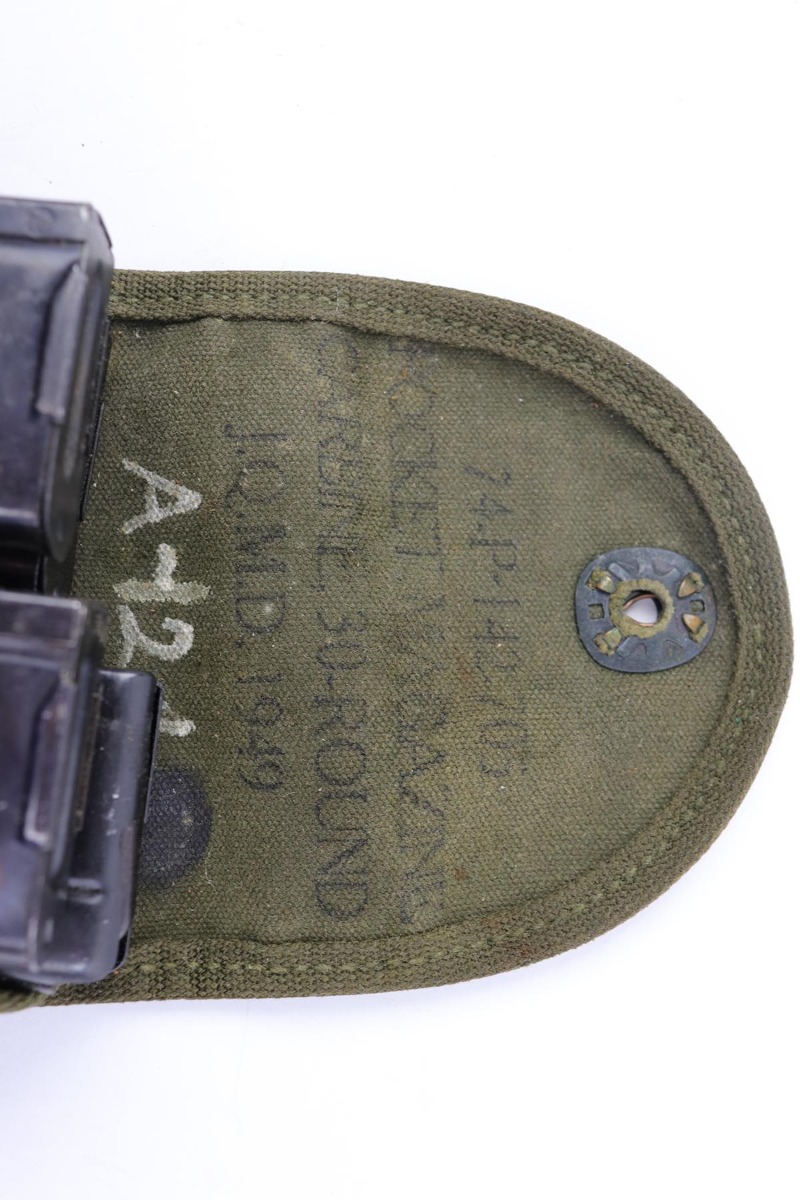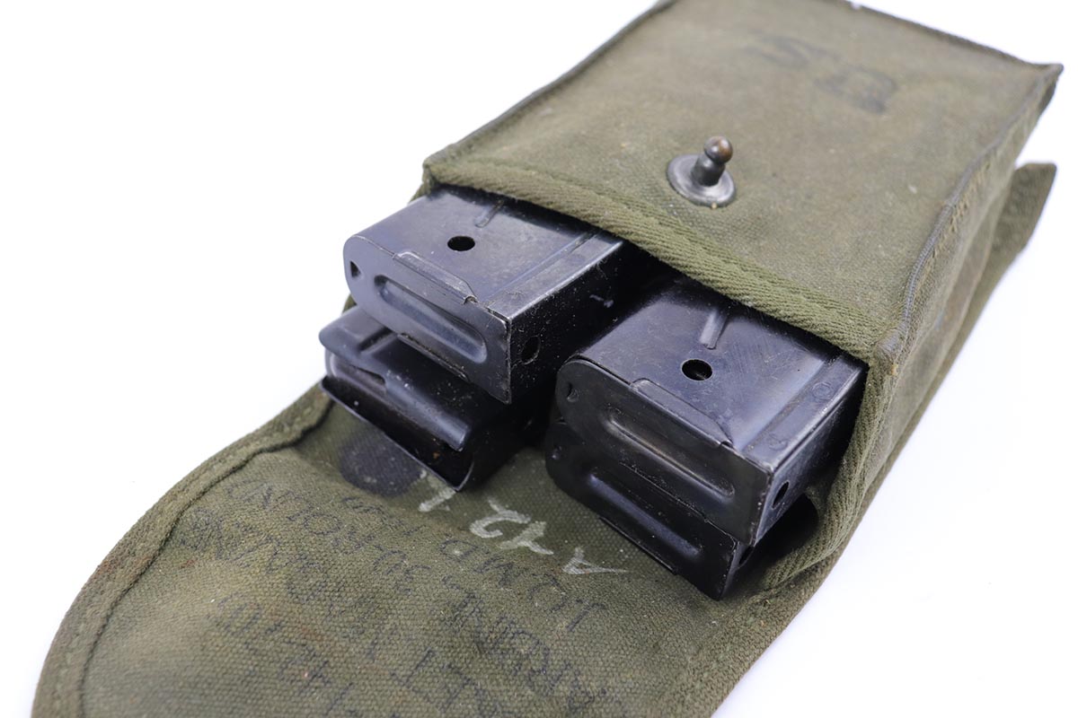 2/6/20 – This is a RARE, excellent condition, original WW2 issue M2 ( 2/1) Carbine. Metal is all original finish and the wood has not been sanded or re-varnished. It still retails it’s original WW2 M2 stock, and you can see the Inland cartouche on the right side. The barrel is dated December of 1944. The bore is mint; shiny with strong rifling. The gun is mechanically excellent and runs/ feeds flawlessly. The gun includes the Bayonet lug, adjustable rear site, and muzzle brake on the end of the barrel with 4 extra magazines. The magazines are all original military issued 30 round mags. It comes with a pouch dated 1949. The front sight is marked RIA and is the only replacement part that we can find on the gun. FULLY TRANSFERABLE on form 3 and 4. No import marks. Fires 30 caliber ammo in full auto as well as semi-auto. A real collectors piece that will most likely go up in value !