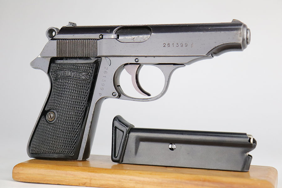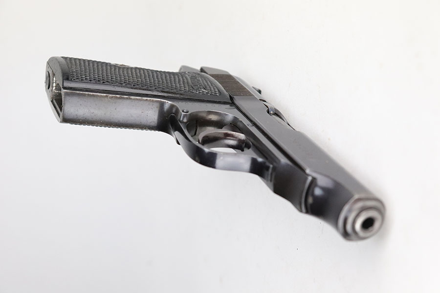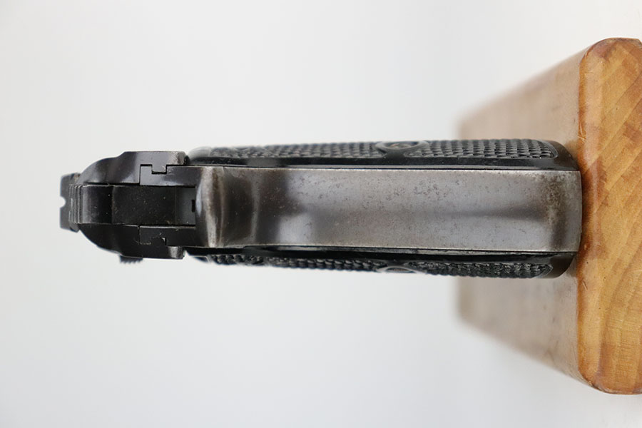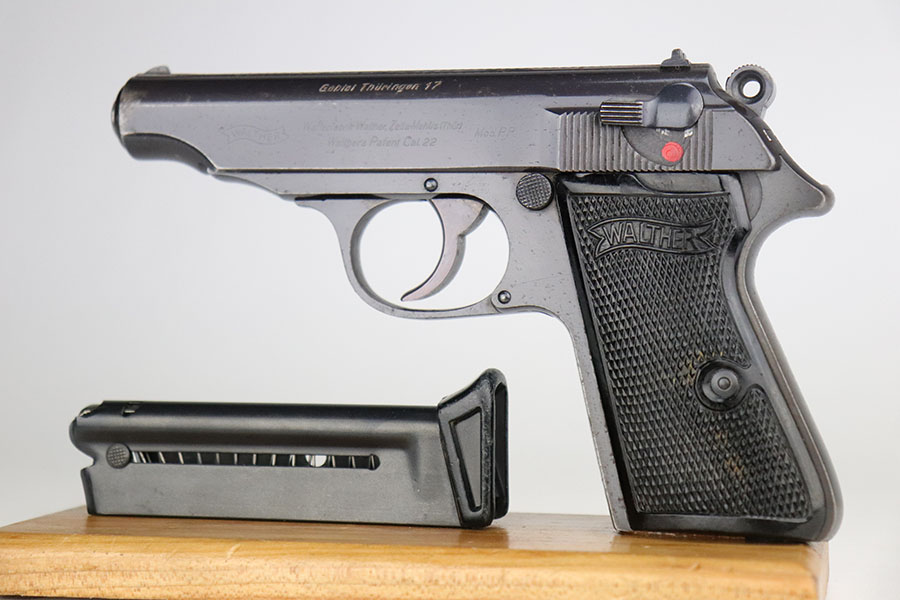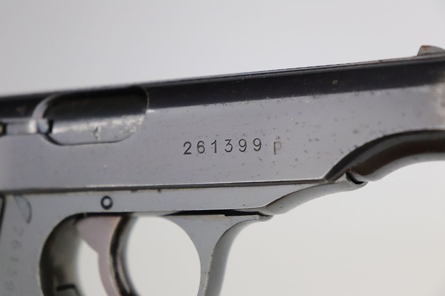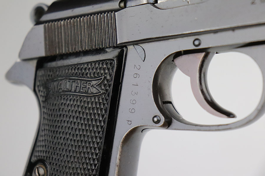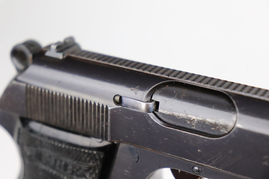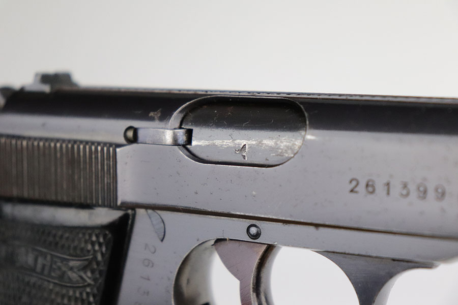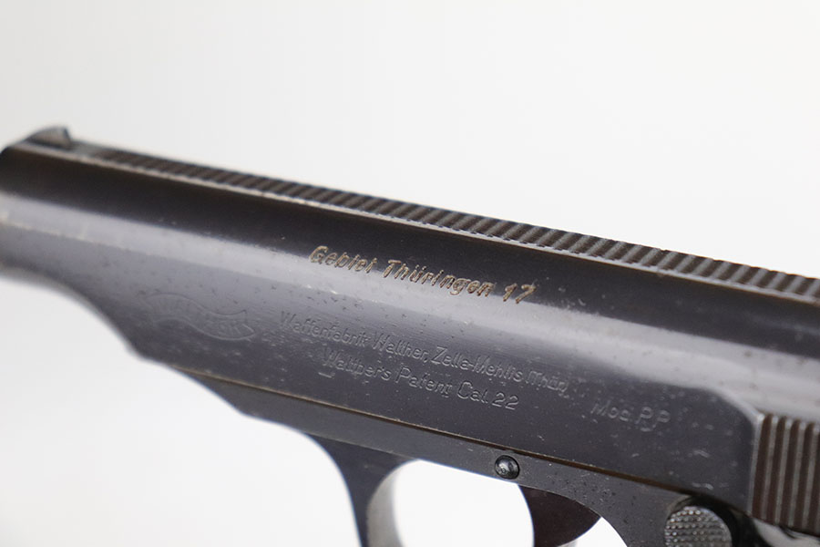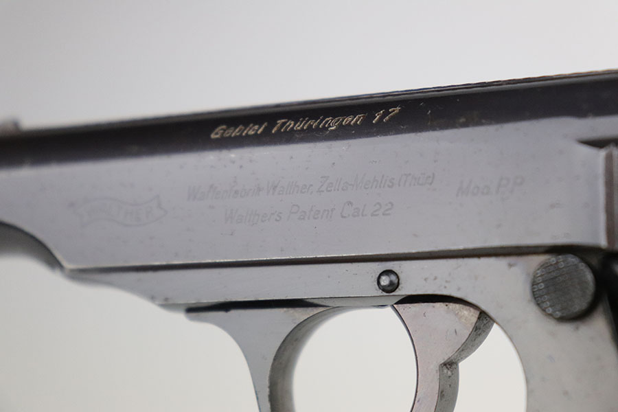 This is a very interesting and rare Walther PP in .22 caliber. It is inscribed on the slide “Gebiet Thuringen 17”, which roughly translates to Area or District 17, Thuringen. We believe the inscription to be 100% authentic but this is the first such inscription we’ve seen. The seller stated that it came from a Hitler Youth leader. They of course would have used 22 rifles and pistols for training boys on shooting. We have not been able to confirm this theory , but others have agreed that this is a feasible explanation. The bluing is original and rates at about 90%, with high edge wear on the slide, and some thinning on the straps. There is also oxidation visible on the bluing surfaces. Minty bore and nice grips. Comes with an original finger extension magazine.